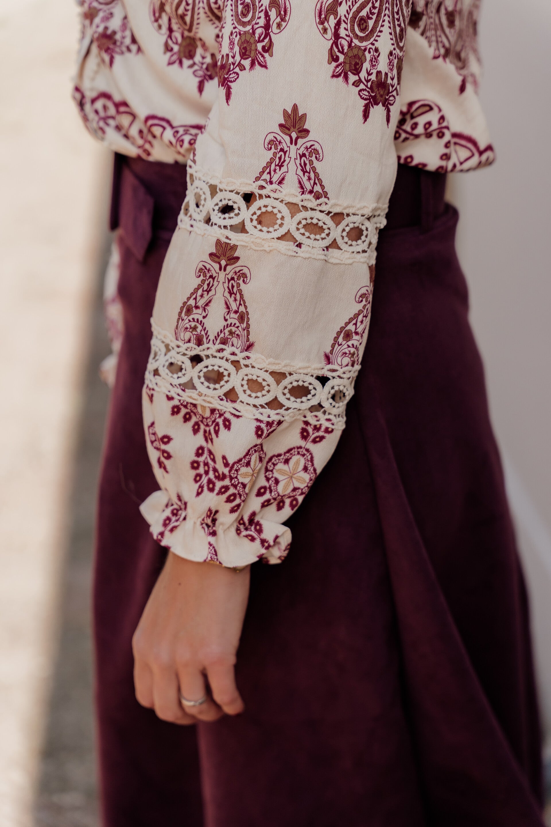 Deze blouse straalt bohemian chic uit! De paisleyprint in warme bordeauxtinten op een ecru basis geeft de blouse een stijlvolle en tegelijkertijd speelse uitstraling. De mooie kanten details op de mouwen zorgen voor een extra verfijnde touch.