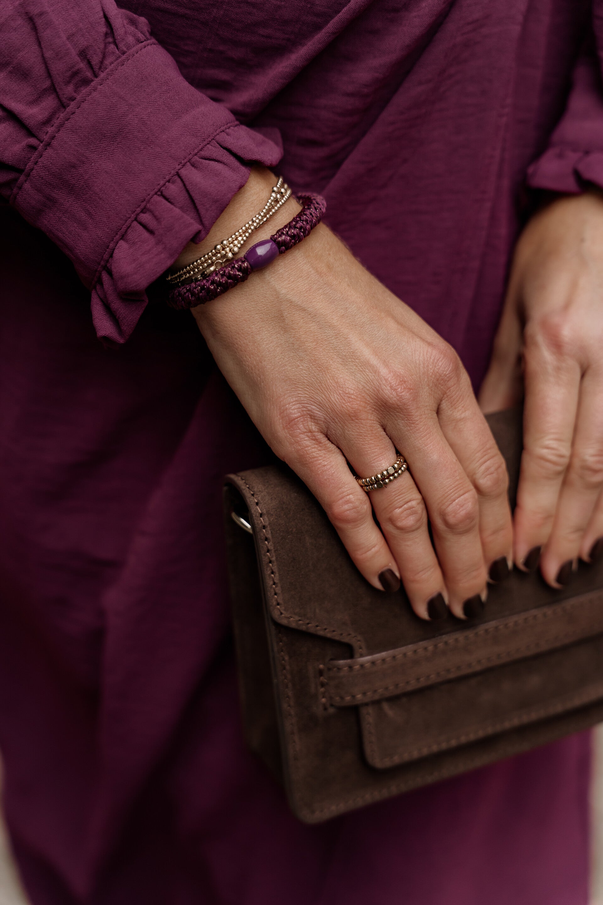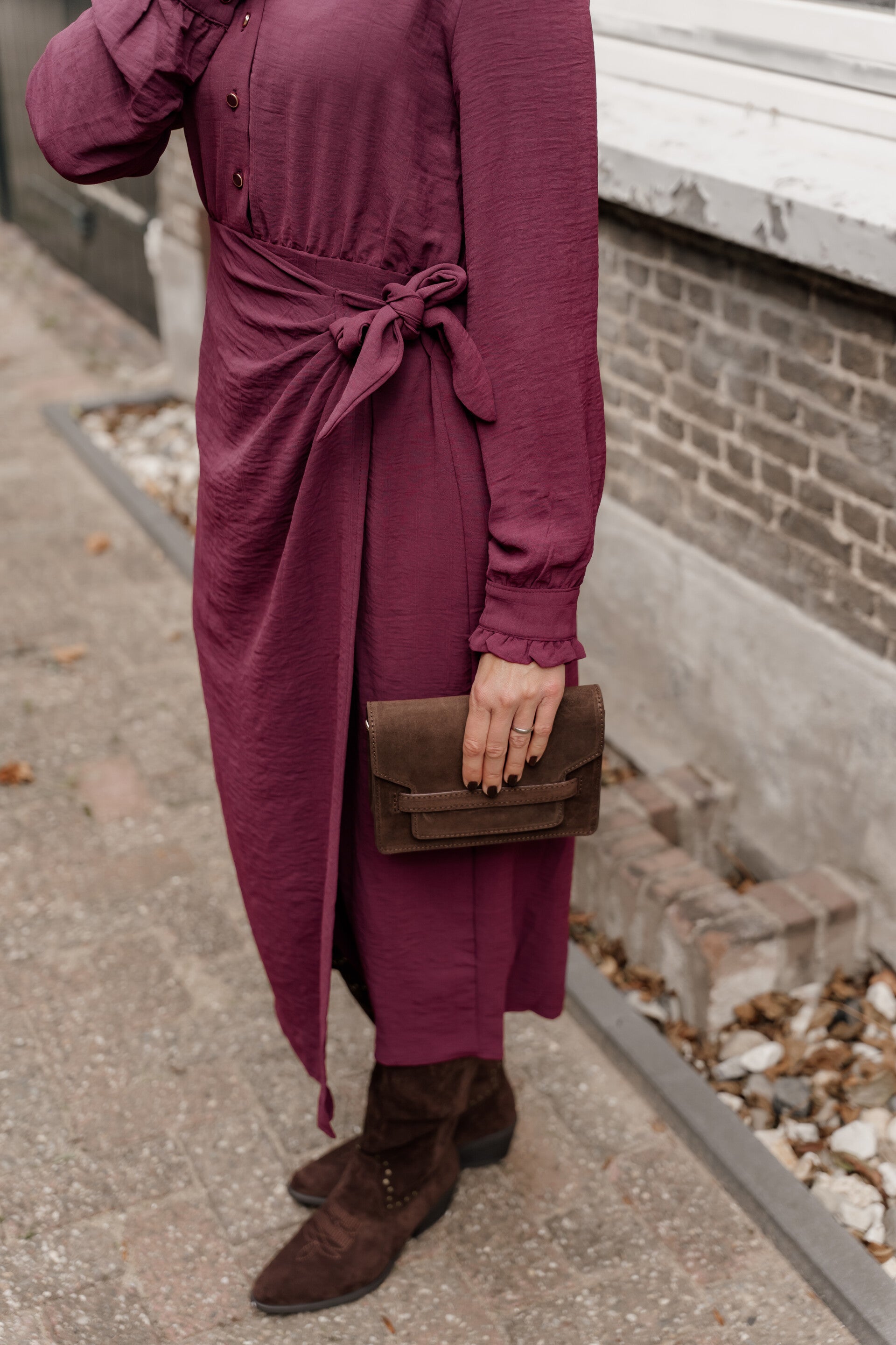 Een prachtige, vrouwelijke jurk in een diepe burgundy/paarse kleur die moeiteloos stijl en comfort combineert. De jurk is elegant afgewerkt met fijne knoopjes aan de voorzijde en bij de manchetten, wat zorgt voor een verfijnde, klassieke uitstraling.