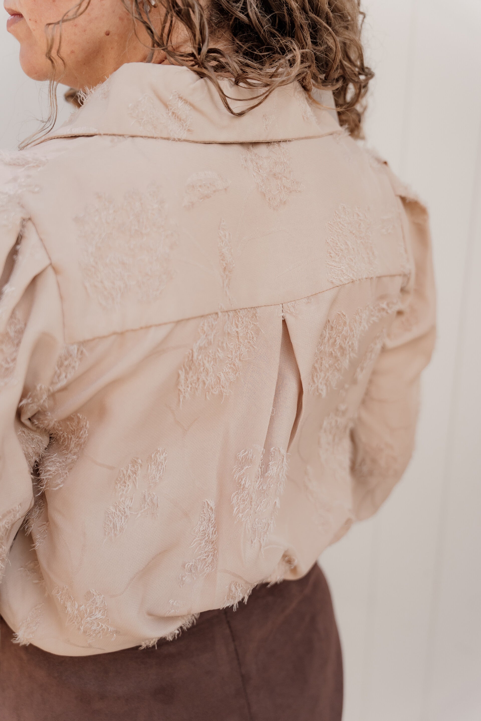 Een vrouwelijke blouse met elegante uitstraling en perfect passend bij de trendkleur bruin. Deze licht doorschijnende blouse in zacht beige heeft een verfijnde opgewerkte bloemenstructuur die zorgt voor een luxe, subtiele textuur. De blouse heeft een klassieke kraag, knoopsluiting en stijlvolle pofmouwen met manchetten.