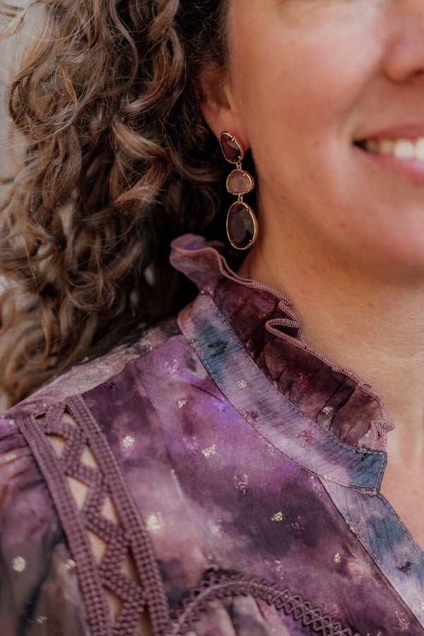 Deze romantische jurk in prachtige herfstkleuren is een echte eyecatcher! De rijke mix van paarse en bruine tinten, gecombineerd met subtiele goudaccenten, geeft de jurk een luxe uitstraling. De pofmouwen en fijne plooien bij de schouders zorgen voor een elegante, vrouwelijke look.
