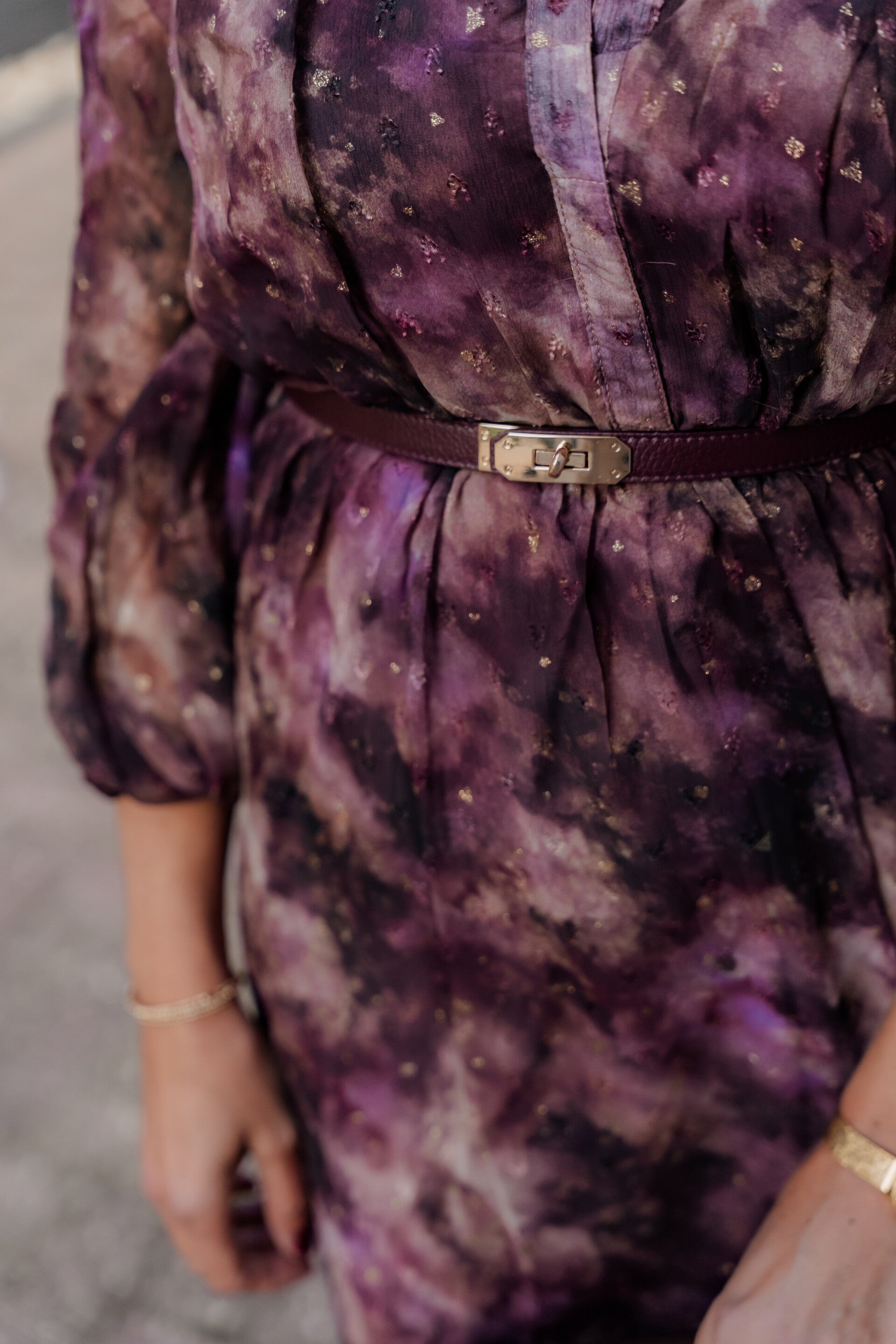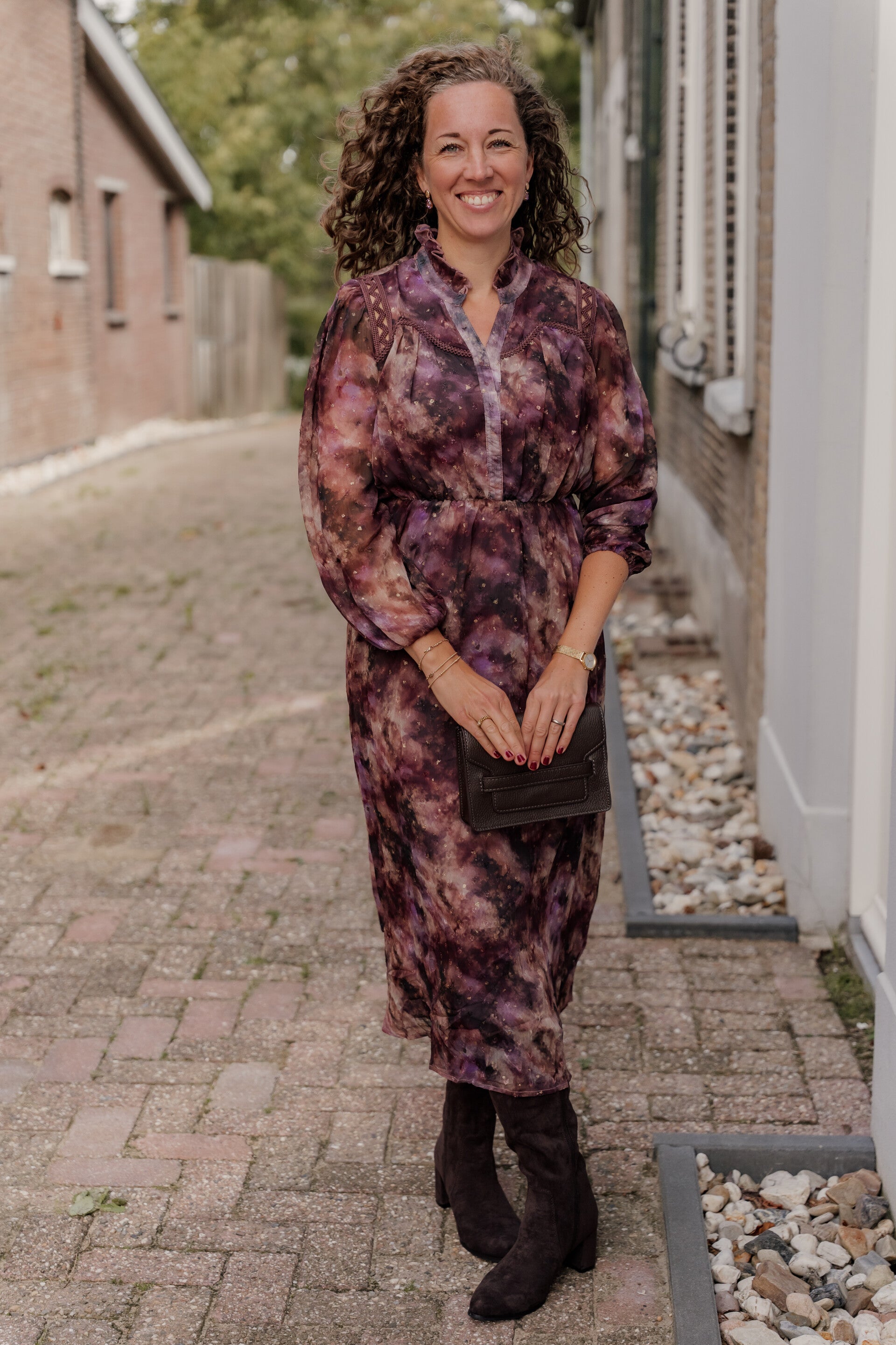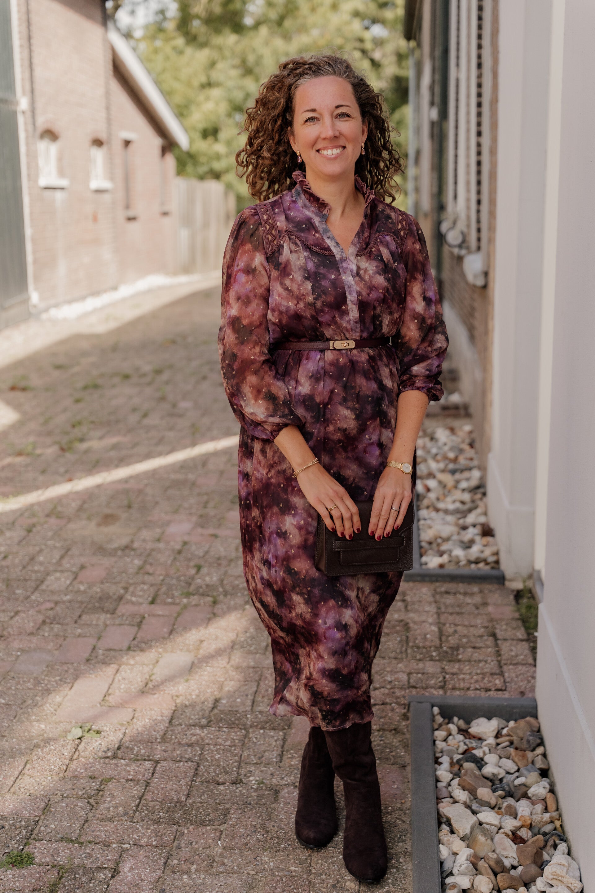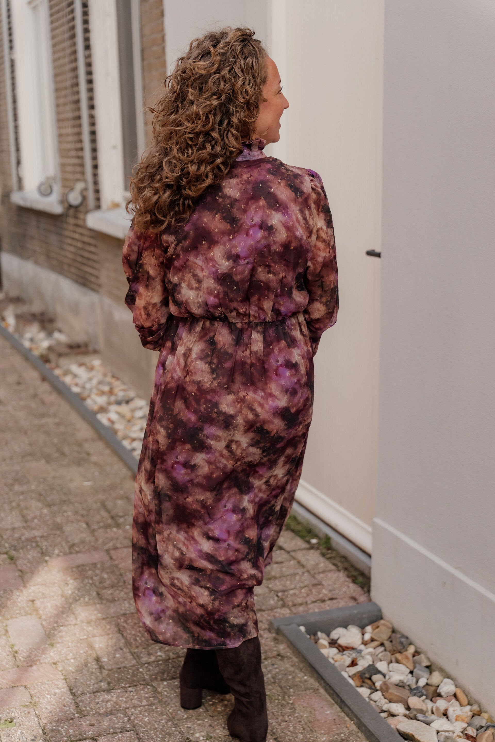 Deze romantische lange jurk in prachtige herfstkleuren is een echte eyecatcher! De rijke mix van paarse en bruine tinten, gecombineerd met subtiele goudaccenten, geeft de jurk een luxe uitstraling. De pofmouwen en fijne plooien bij de schouders zorgen voor een elegante, vrouwelijke look.