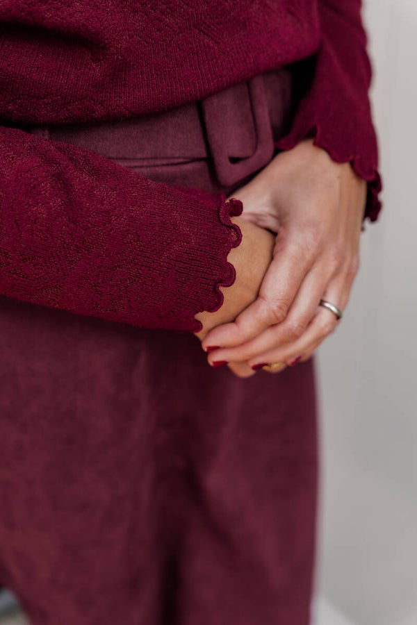 Deze elegante rok in donkerbruine suèdelook is een echte eyecatcher. Het soepelvallende model heeft een vrouwelijke A-lijn en wordt geaccentueerd door de brede tailleband met bijpassende ceintuur. Het zachte materiaal zorgt voor een comfortabele pasvorm en een luxe uitstraling. Mooi te combineren met een blouse of trui en laarzen voor een stijlvolle najaarslook.