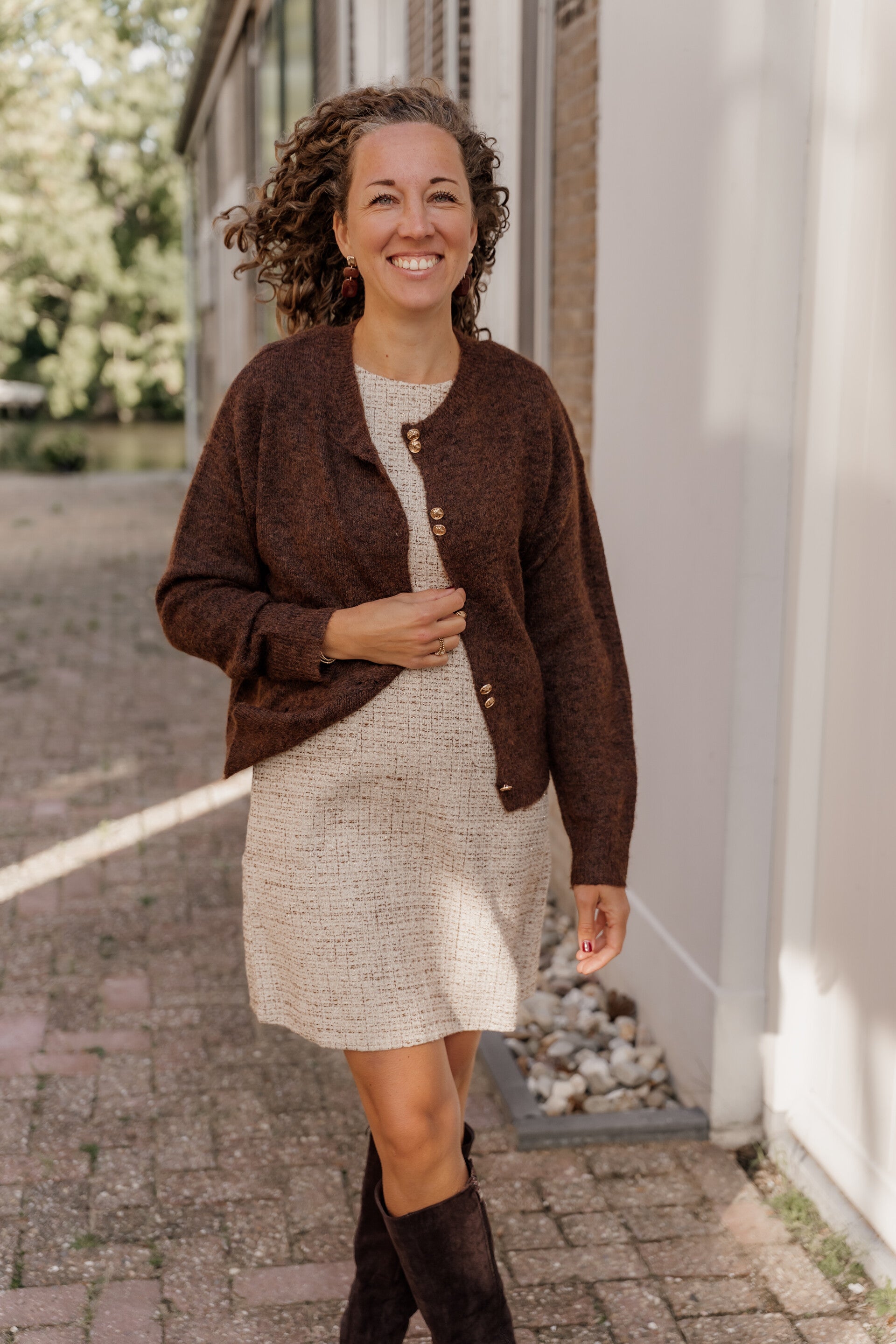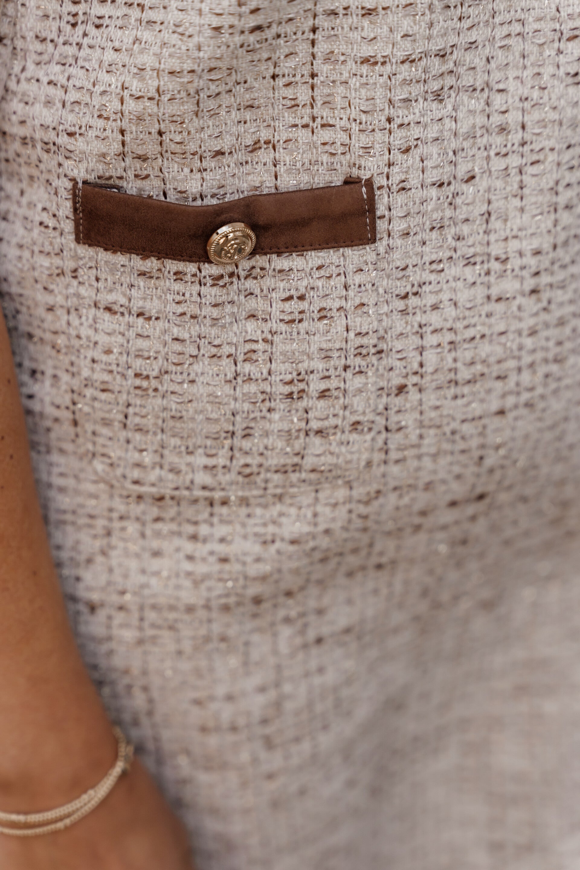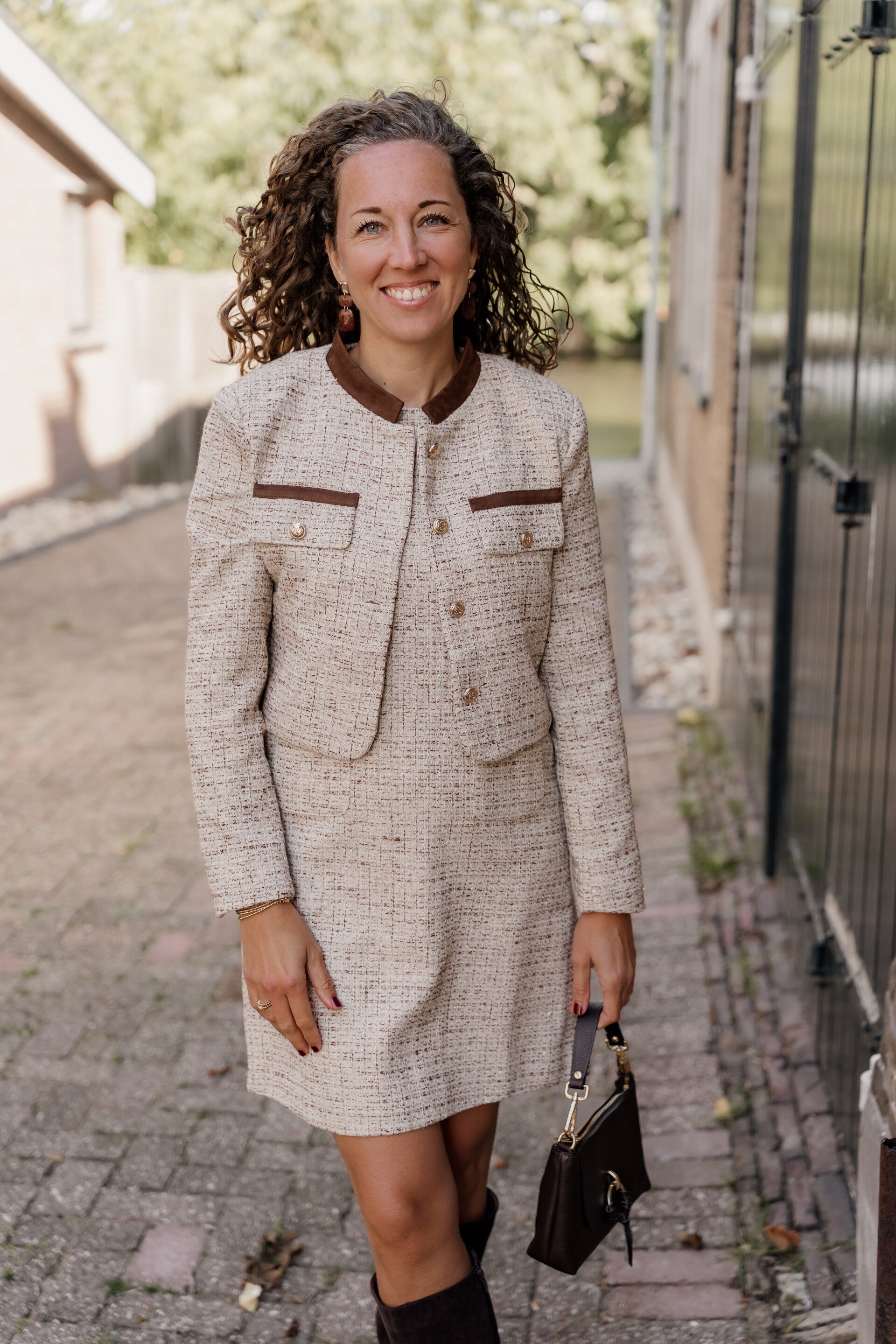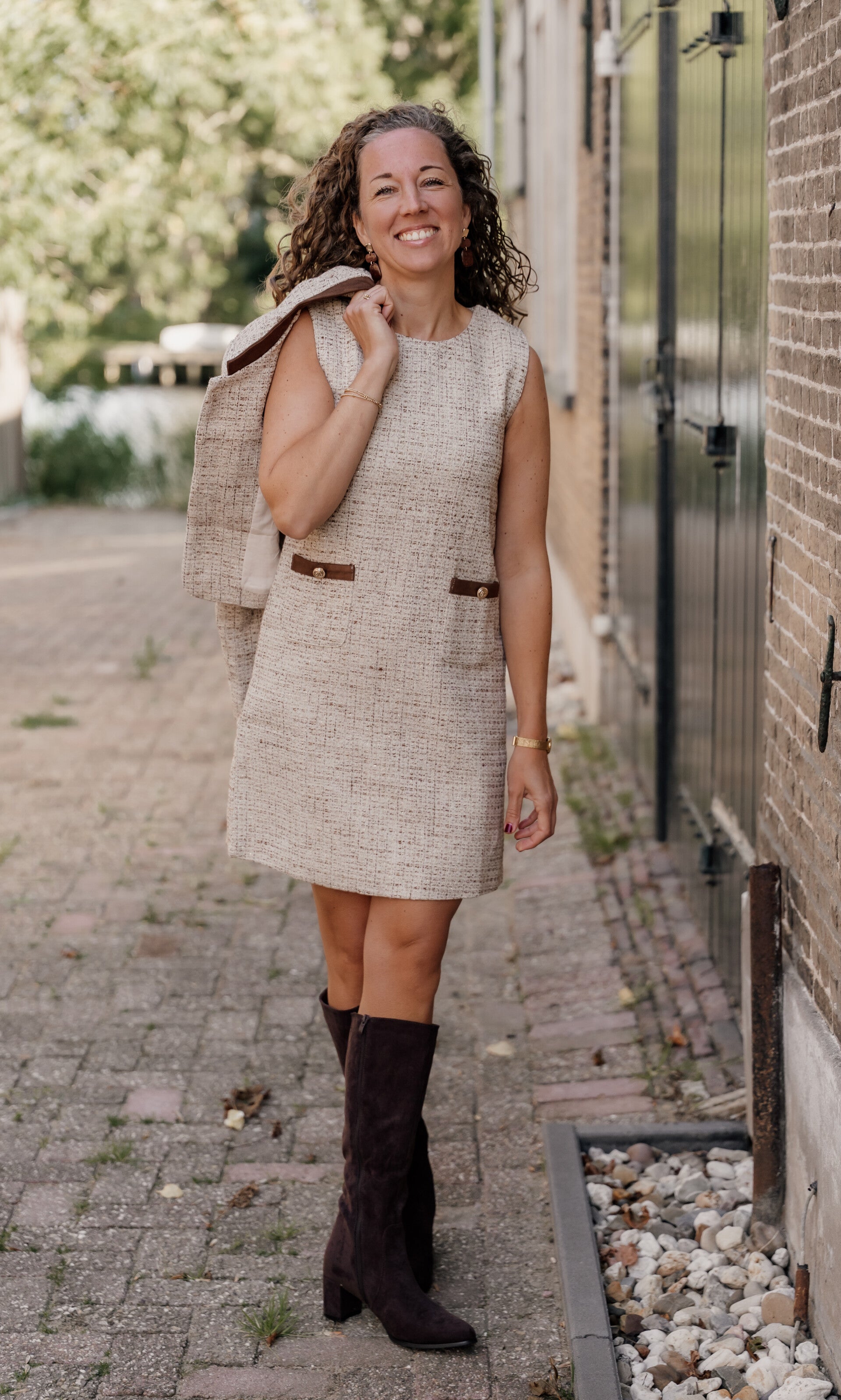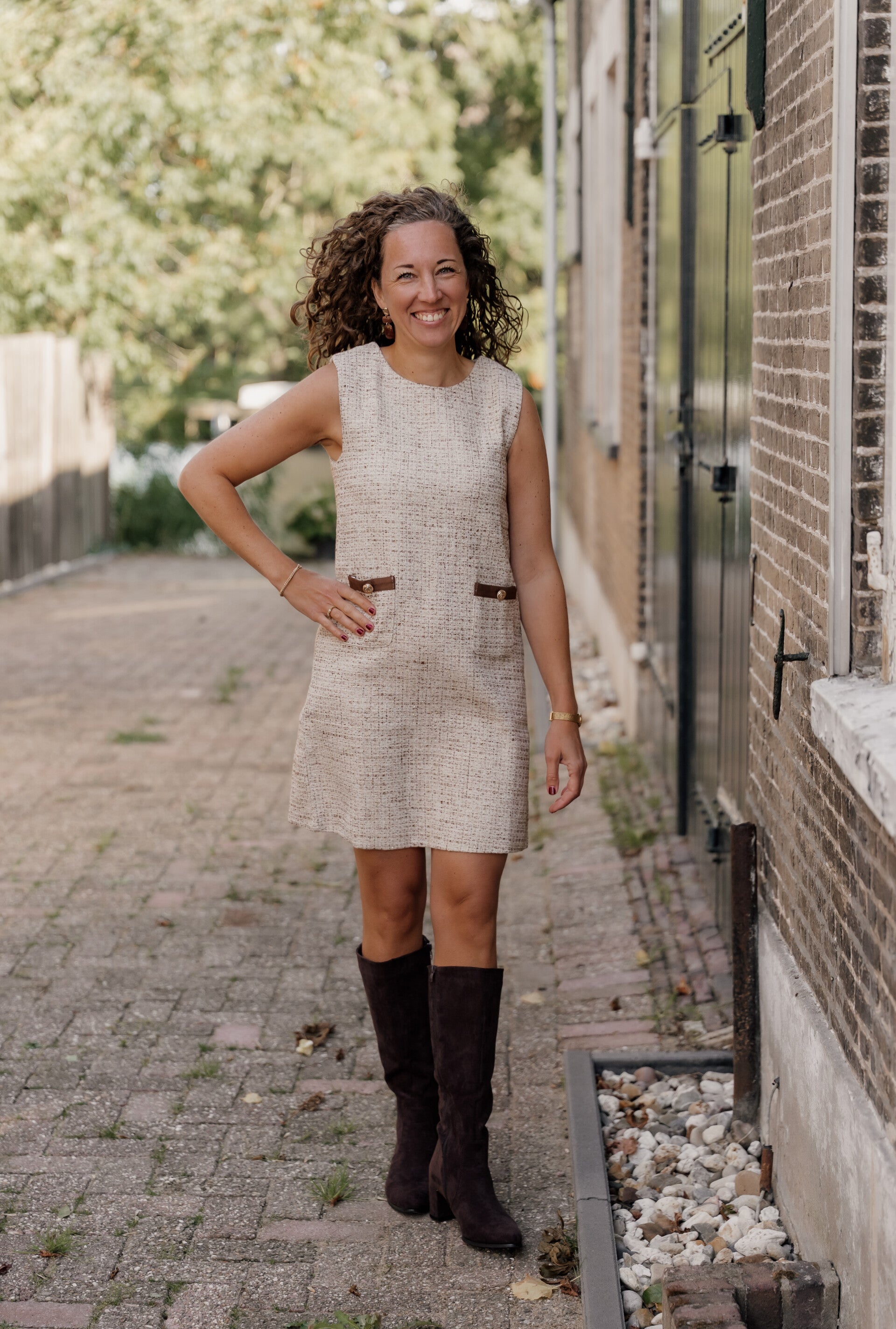 Deze elegante jurk in een licht gemêleerde tweed look heeft bruine suèdine details en goudkleurige knoopjes, wat zorgt voor een rijke, klassieke uitstraling. De stof heeft een subtiel glittertje voor een extra verfijnde look. Mooi als set te dragen met het bijpassende jasje, maar ook prachtig op zichzelf of met een fijngebreid vestje. De jurk bevat een ritssluiting aan de achterzijde.