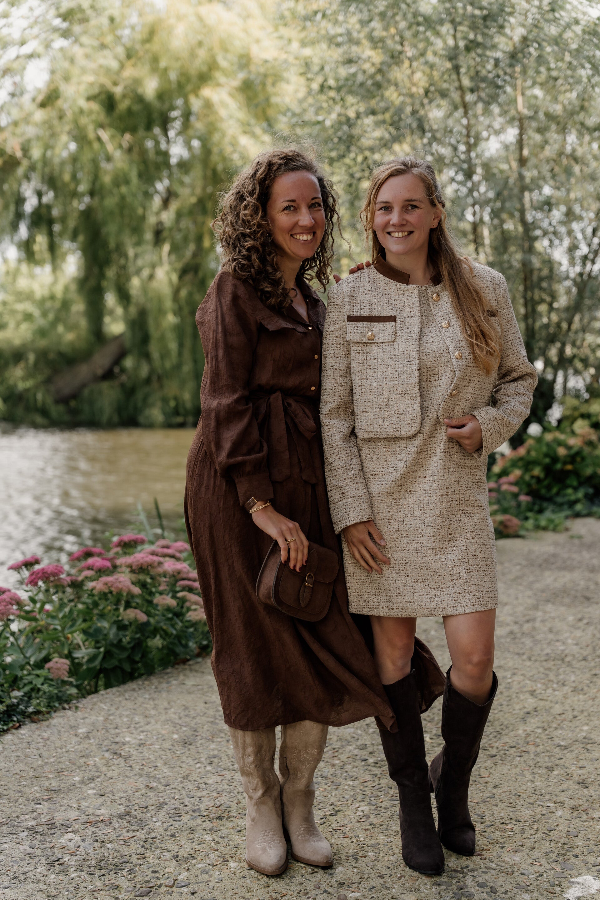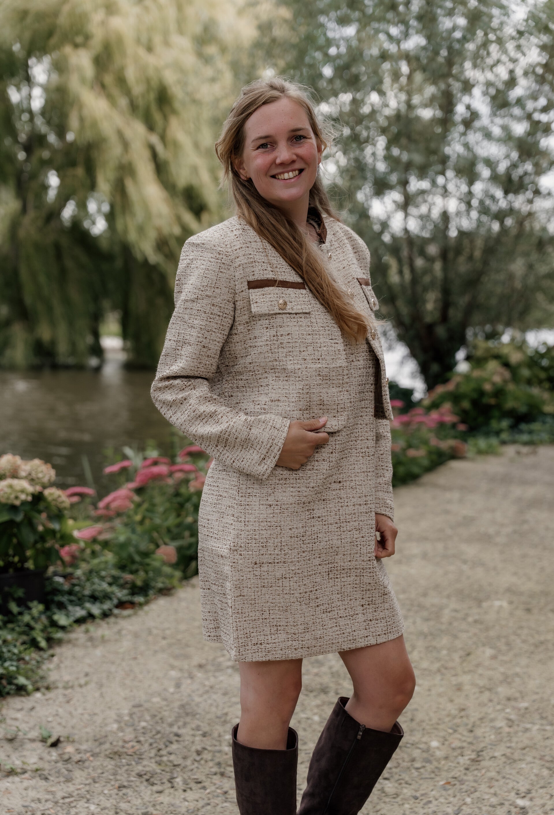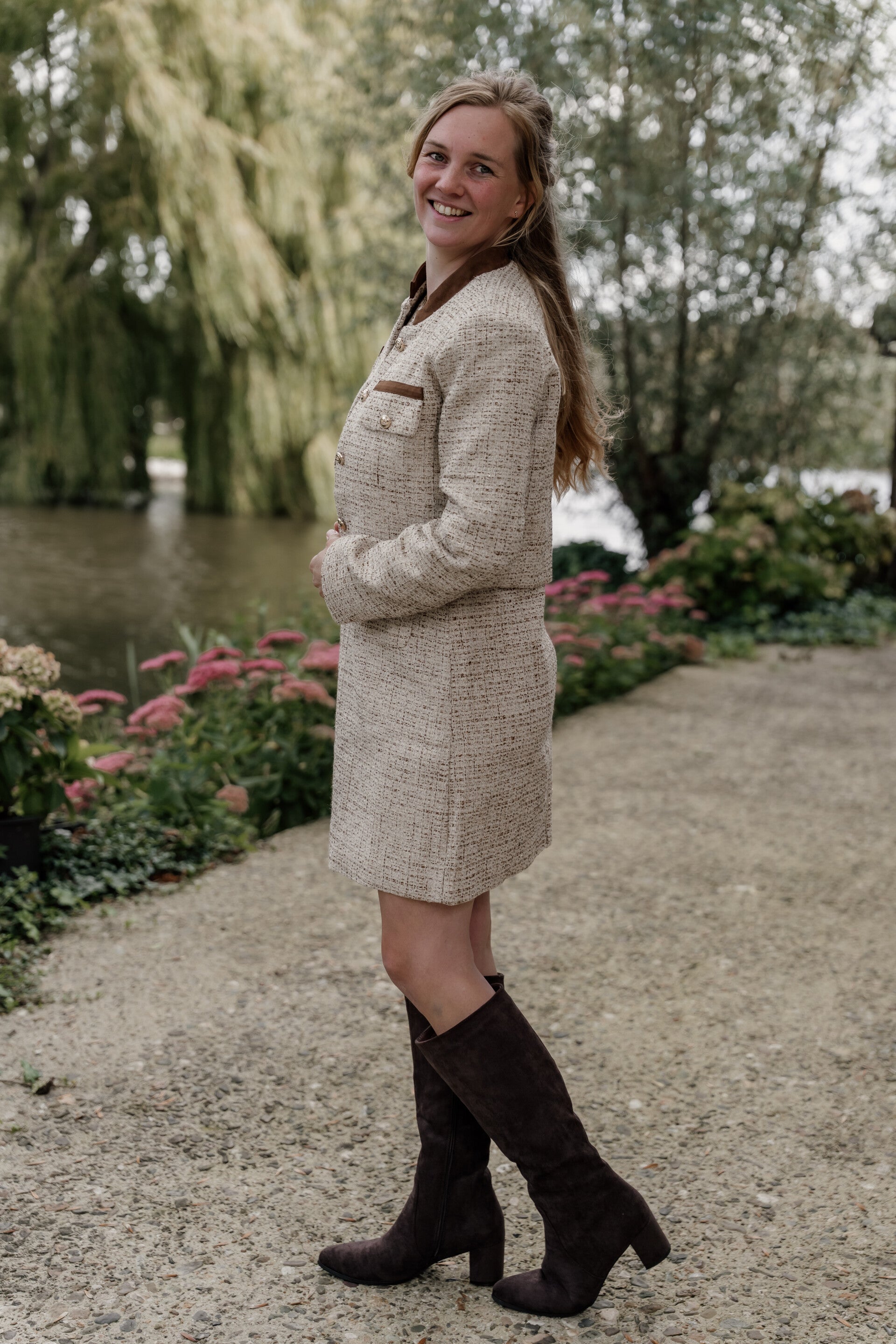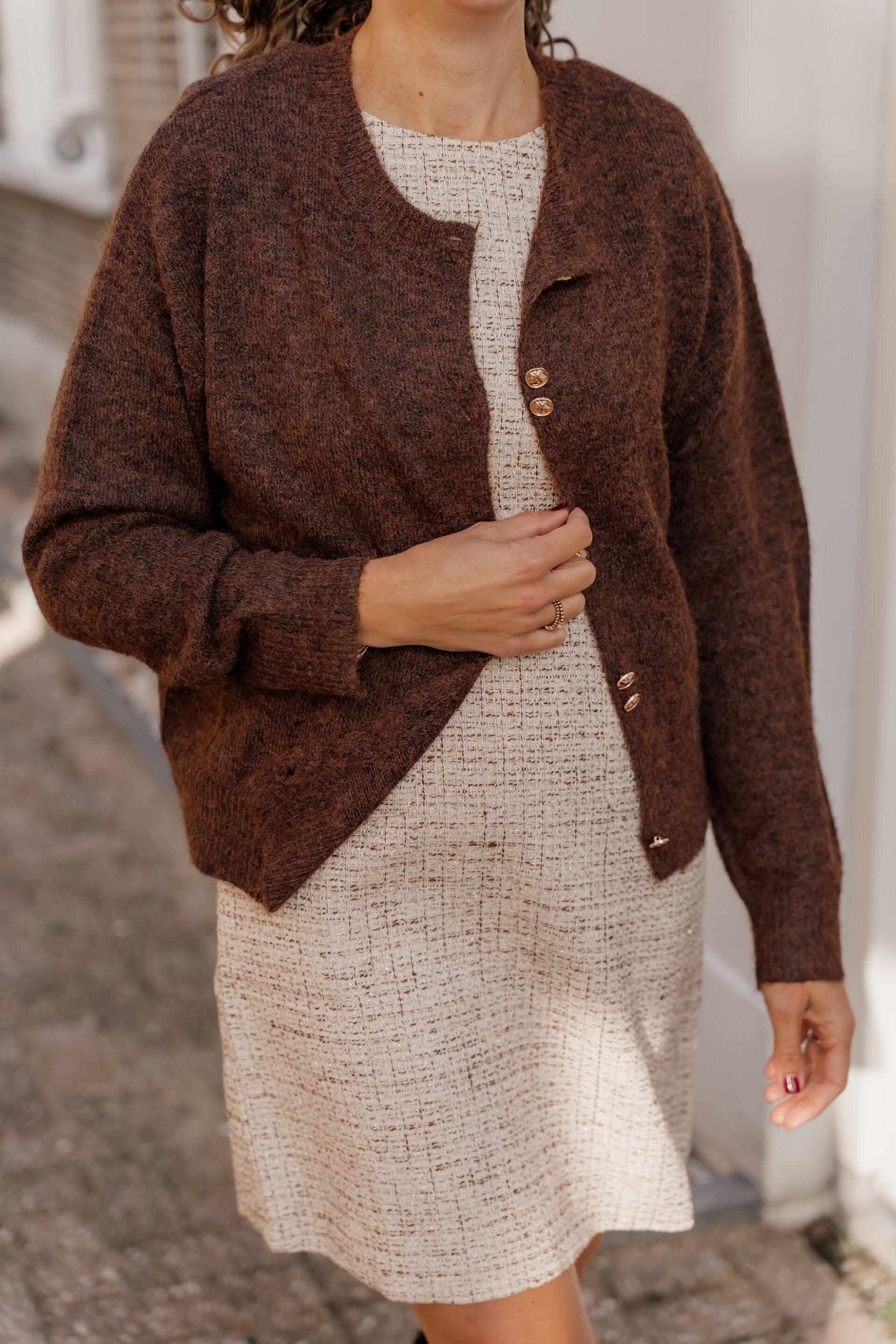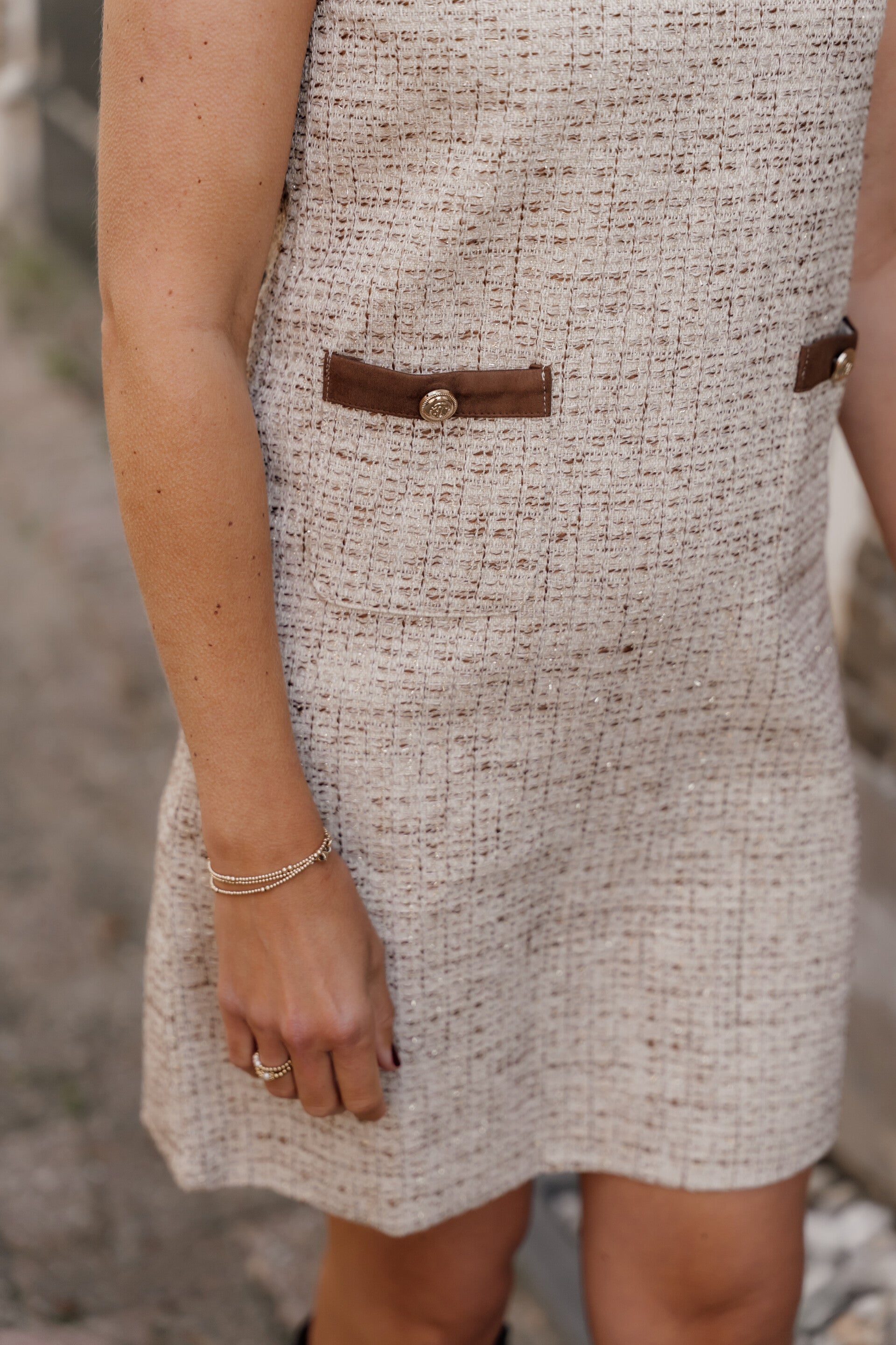 Deze elegante jurk in een licht gemêleerde tweed look heeft bruine suèdine details en goudkleurige knoopjes, wat zorgt voor een rijke, klassieke uitstraling. De stof heeft een subtiel glittertje voor een extra verfijnde look. Mooi als set te dragen met het bijpassende jasje, maar ook prachtig op zichzelf of met een fijngebreid vestje. De jurk bevat een ritssluiting aan de achterzijde.
