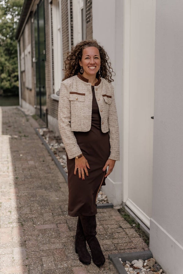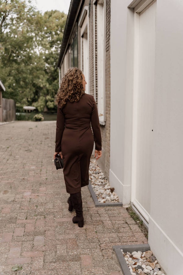 Deze elegante, bruine jurk is een echte eyecatcher! Het getailleerde model zorgt voor een vrouwelijke pasvorm en wordt extra geaccentueerd door de subtiele leren gespsluiting aan de zijkant. De jurk heeft een rechte rok met een kleine split, wat zorgt voor een elegante uitstraling en comfort in beweging.