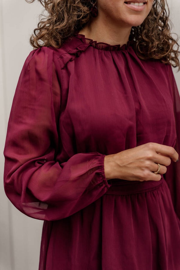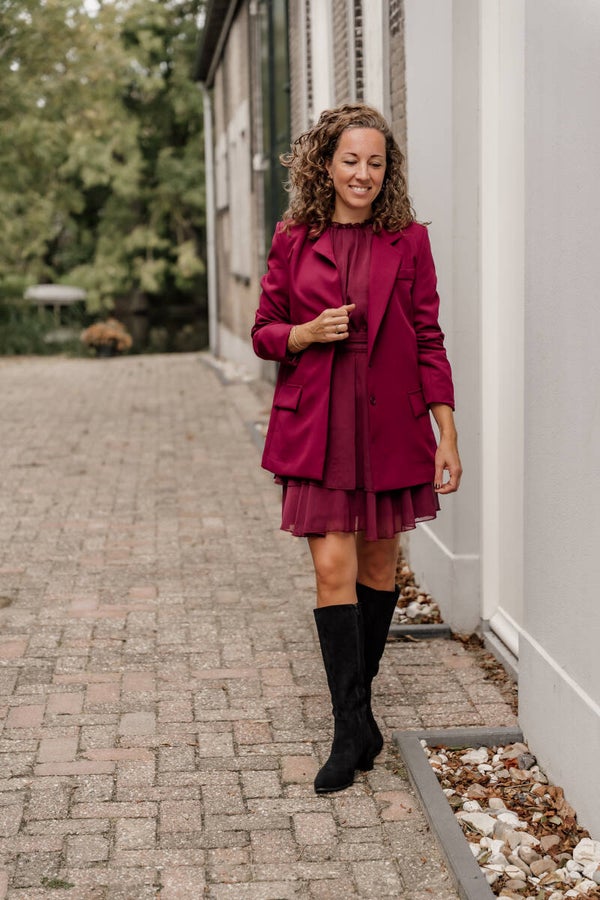 De subtiele plooien bij de hals en de licht gepofte mouwen geven de jurk een romantisch en tijdloos karakter. Perfect te combineren met de nieuwe bordeaux blazer in dezelfde kleur!