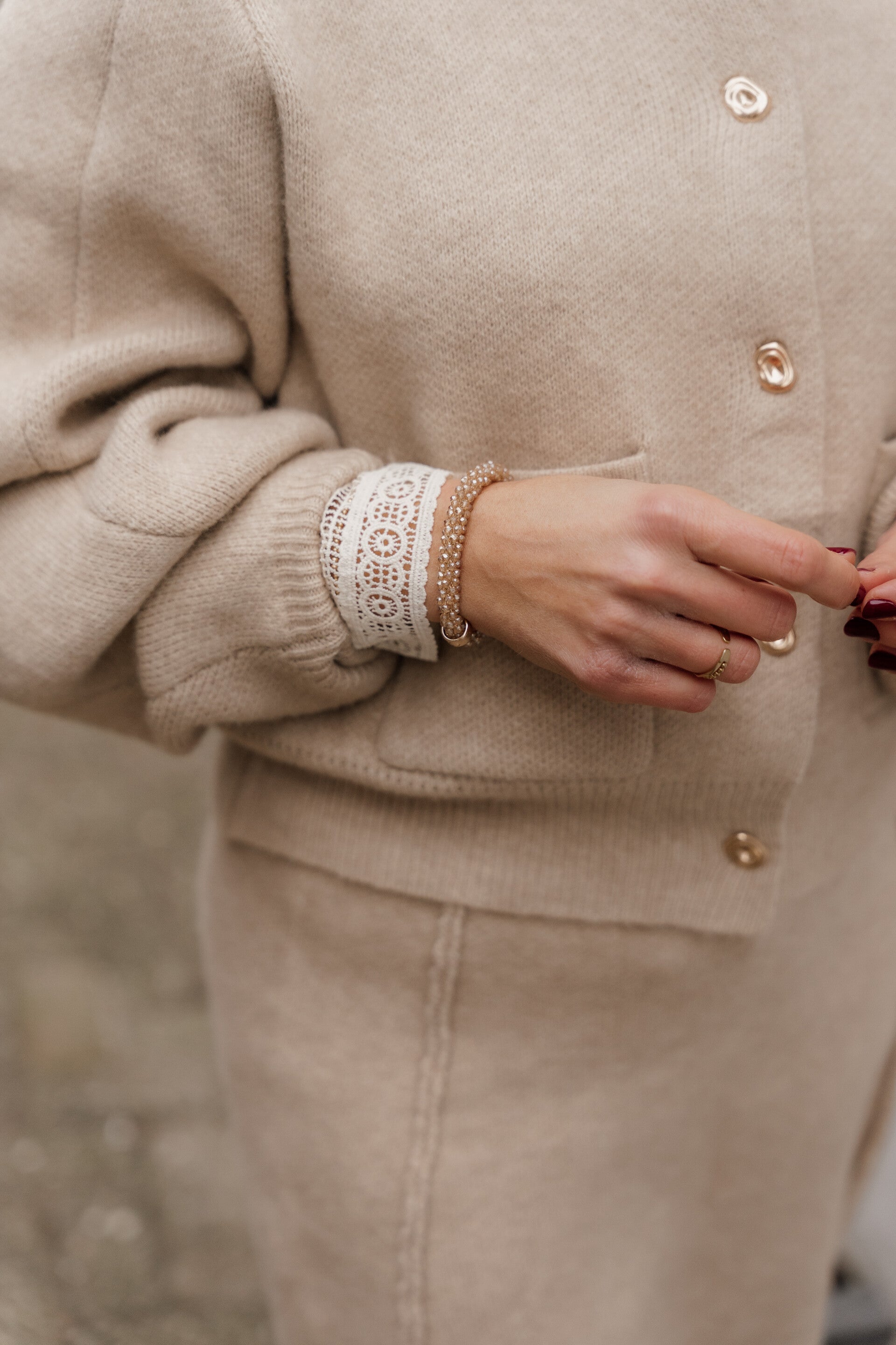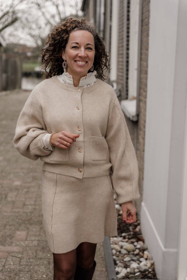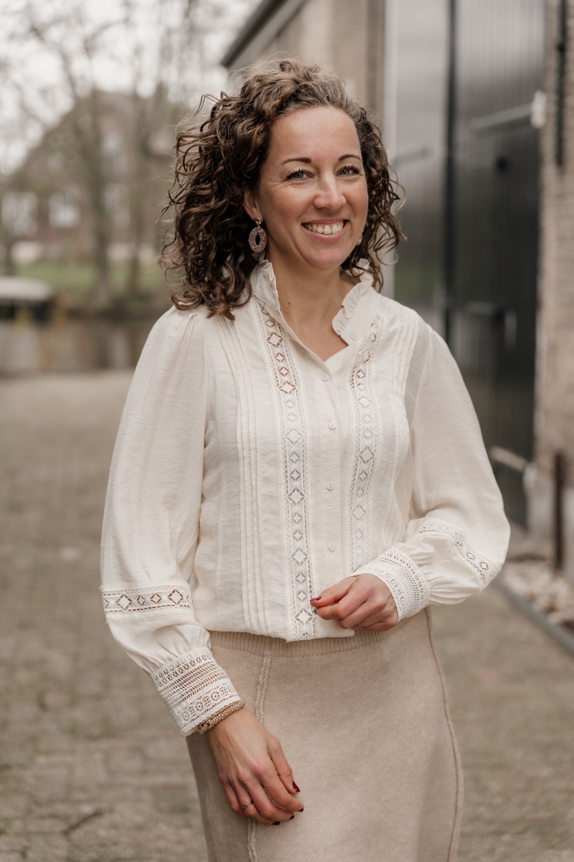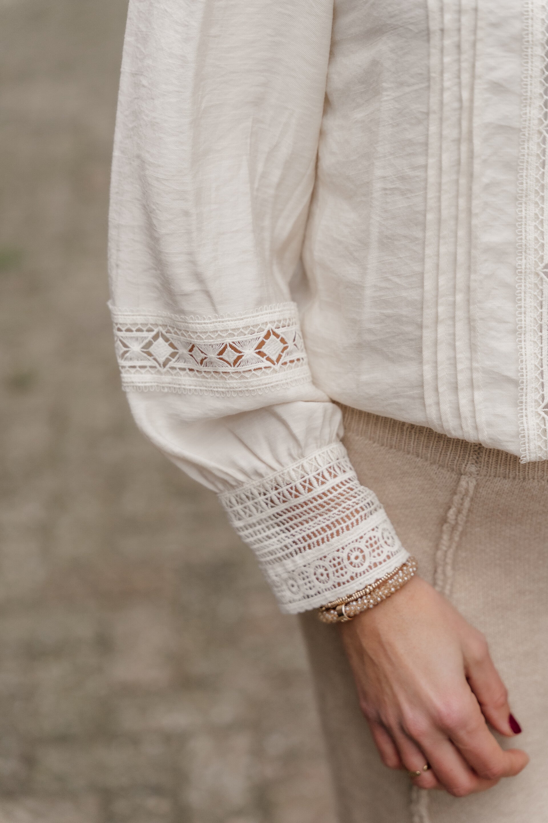 Deze elegante beige blouse straalt vrouwelijkheid en verfijning uit. De blouse is gemaakt van een lichte, comfortabele stof en is afgewerkt met prachtige kant- en ajourdetails aan de voorzijde en mouwen, wat zorgt voor een romantische en luxe uitstraling.