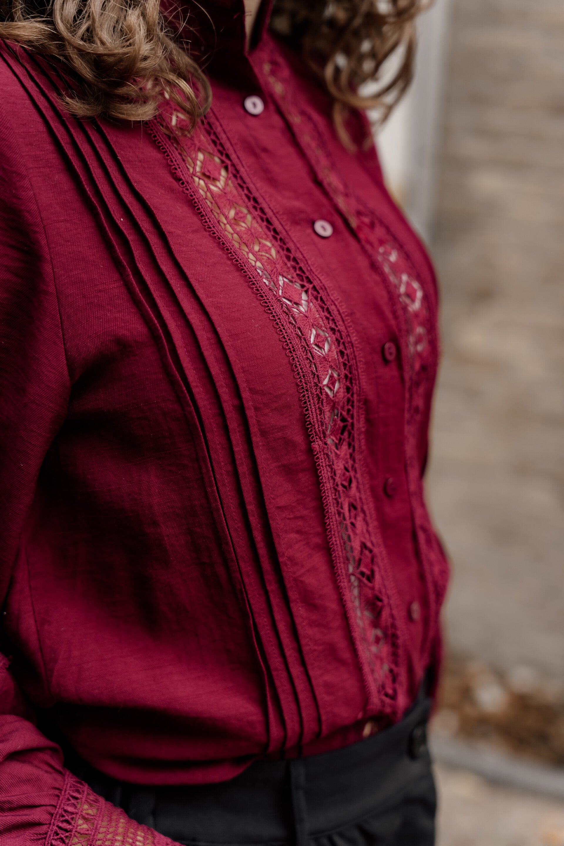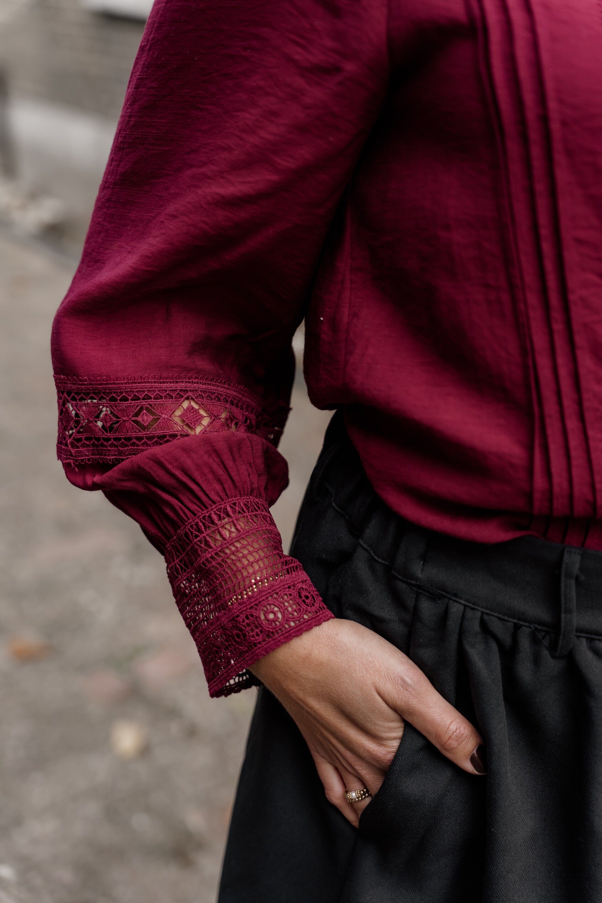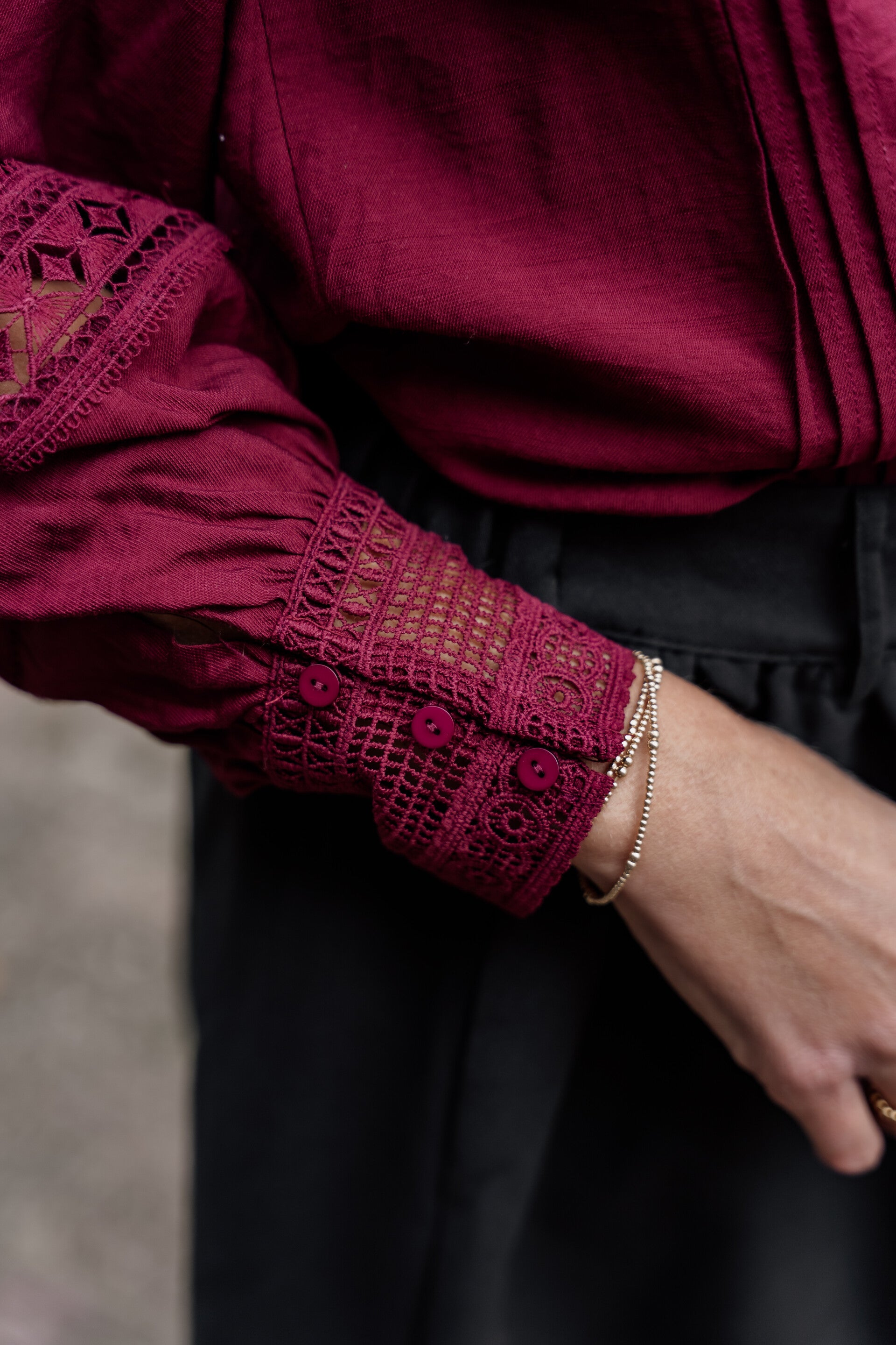 Bestseller blouse in een nieuw trendkleurtje! Deze prachtige blouse is echt een favoriet en afgewerkt met opengewerkt kant wat terugkomt bij de kraag en langs de knopen. De mouw bevat 3 kleine knoopjes.