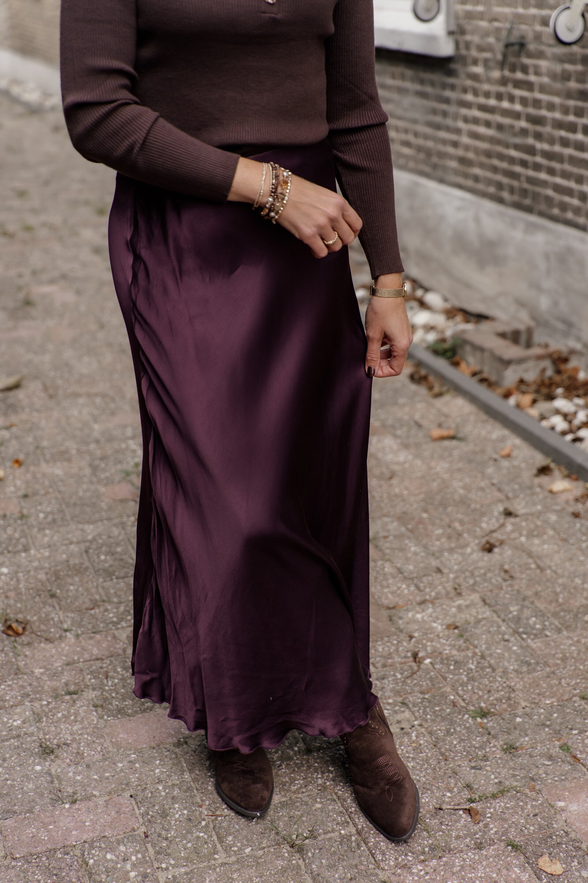 Must-have rok in de mooie burgundy kleur! Lengte van de rok is 90 cmOne size - te dragen t/m maat L. Mariëlle is 1,68 m en draagt meestal S/M.