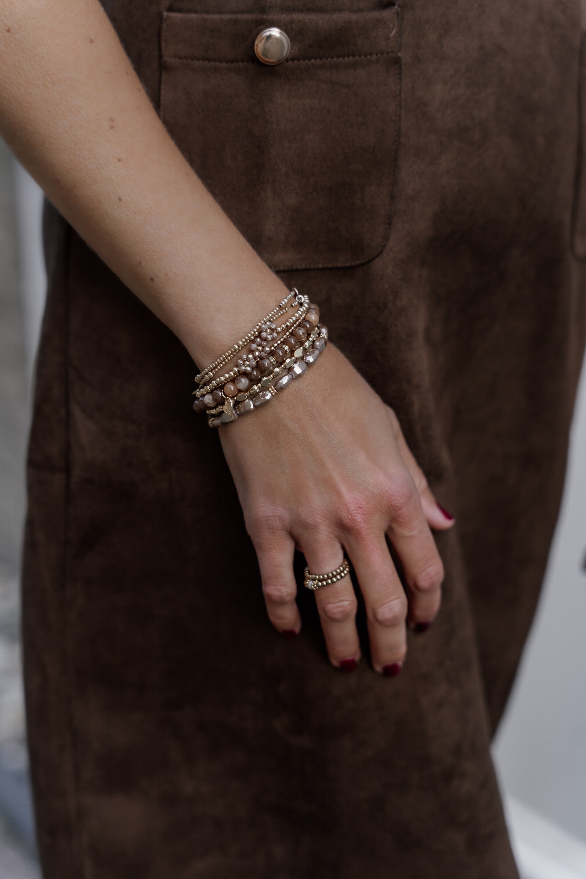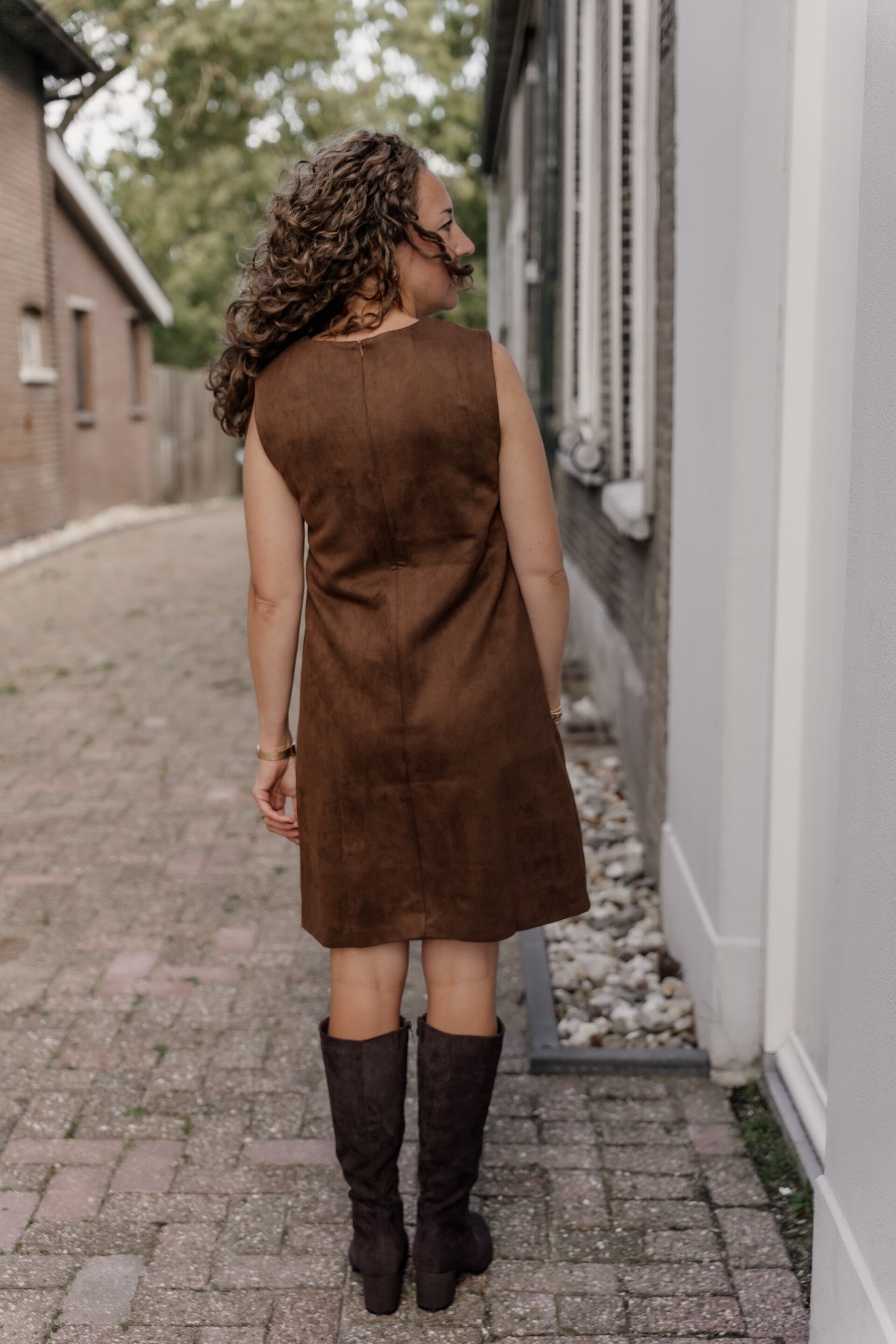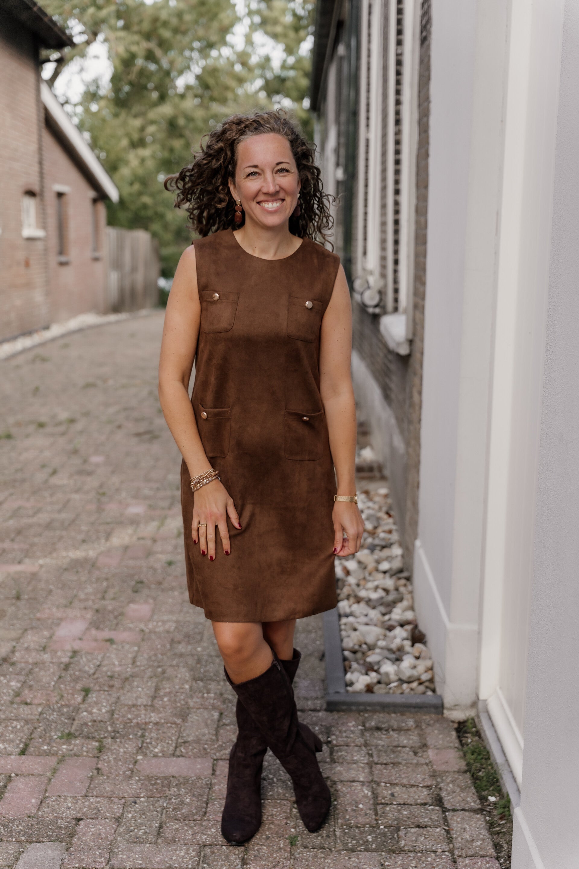 Deze stijlvolle bruine jurk is gemaakt van een zachte faux suede stof en heeft een elegante, tijdloze uitstraling. De goudkleurige knopen op de borst- en heupzakjes geven het geheel een chique touch. Perfect te combineren met het korte jasje uit dezelfde collectie, maar ook los te dragen met bijvoorbeeld een vest erover voor een speelse herfstlook.