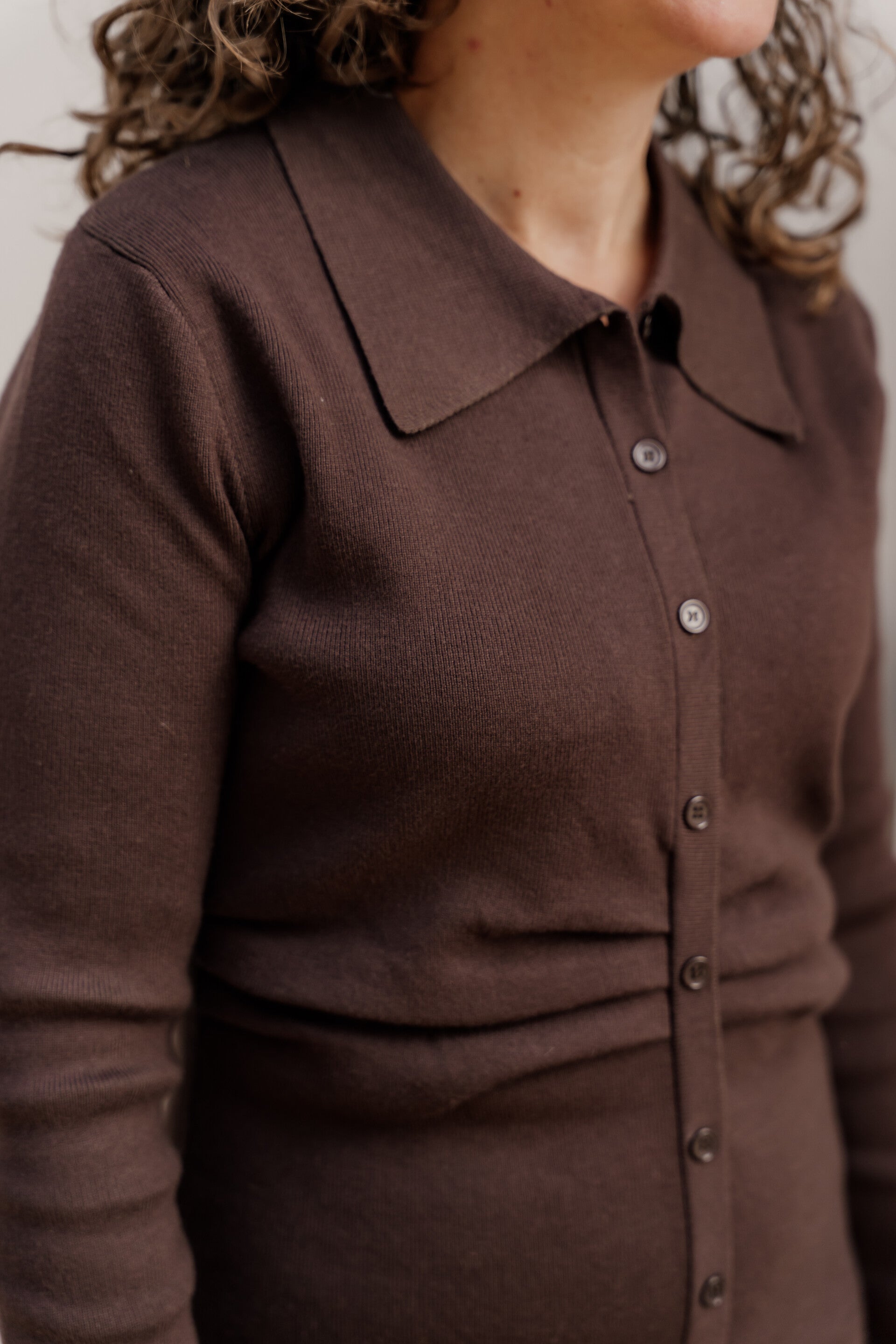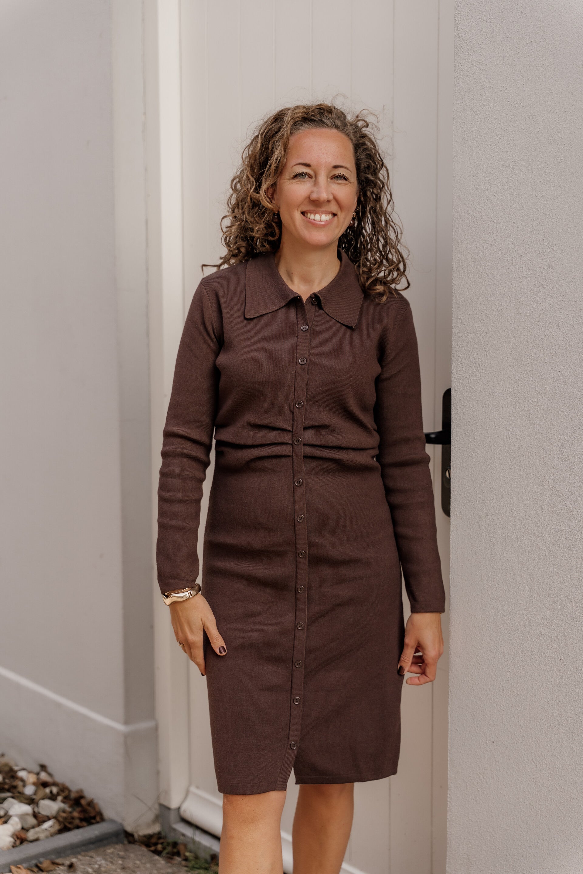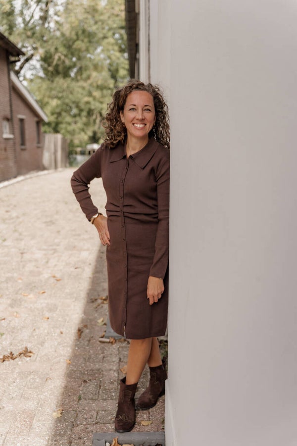 Deze stijlvolle donkerbruine bodycon jurk combineert comfort met elegantie. Gemaakt van een stevige, zachte en rekbare stretch stof die prachtig aansluit op het lichaam en je silhouet op een verfijnde manier benadrukt.