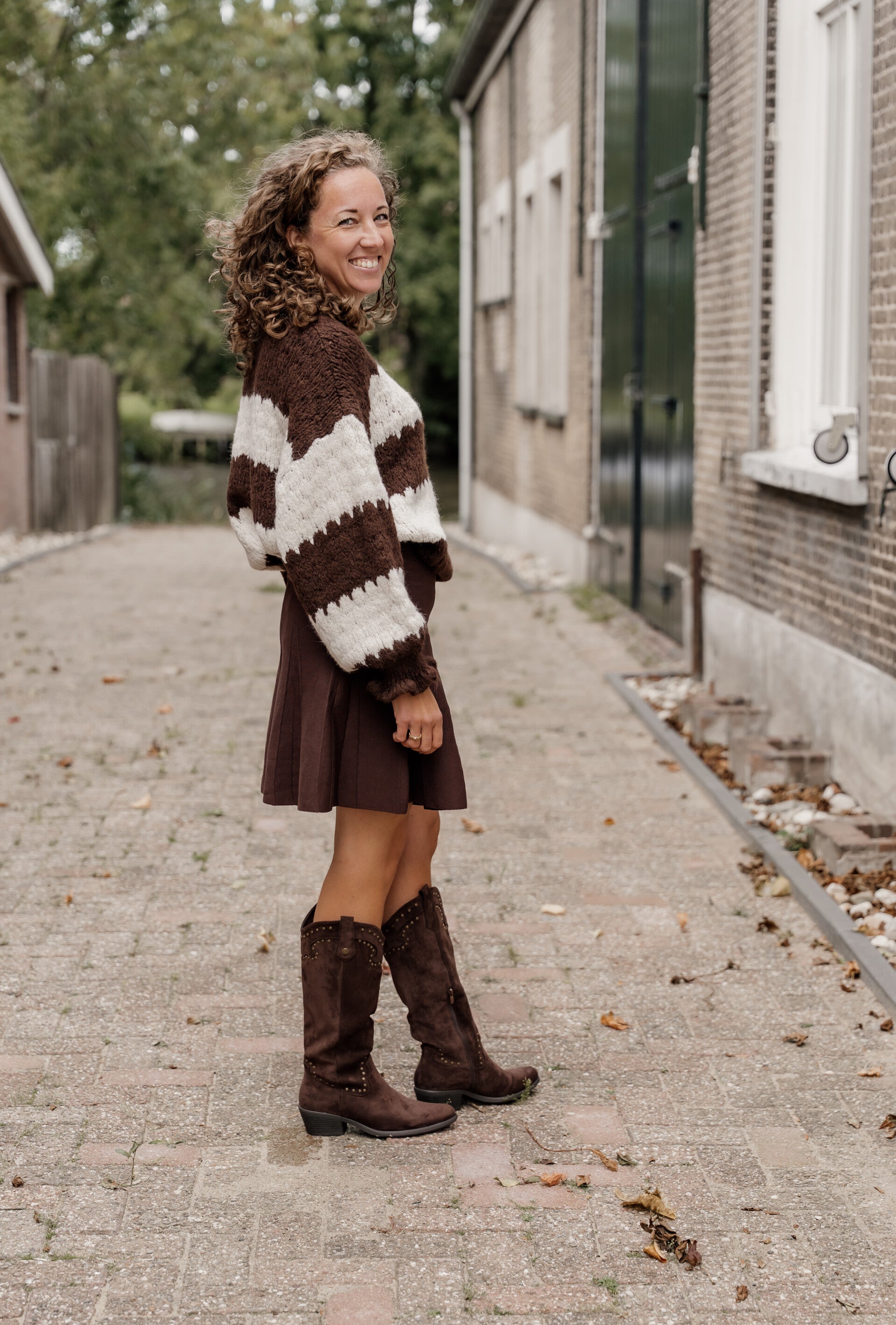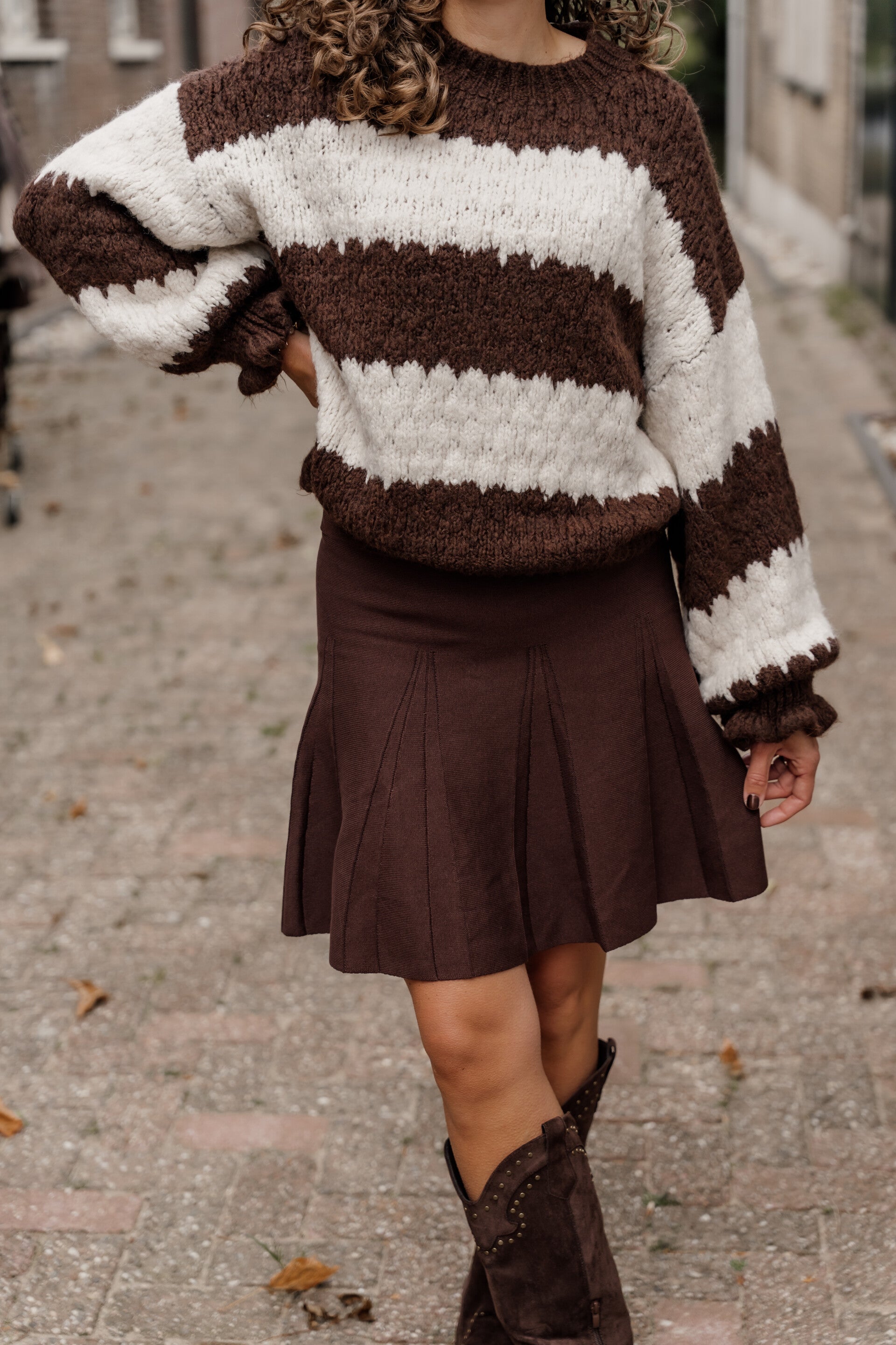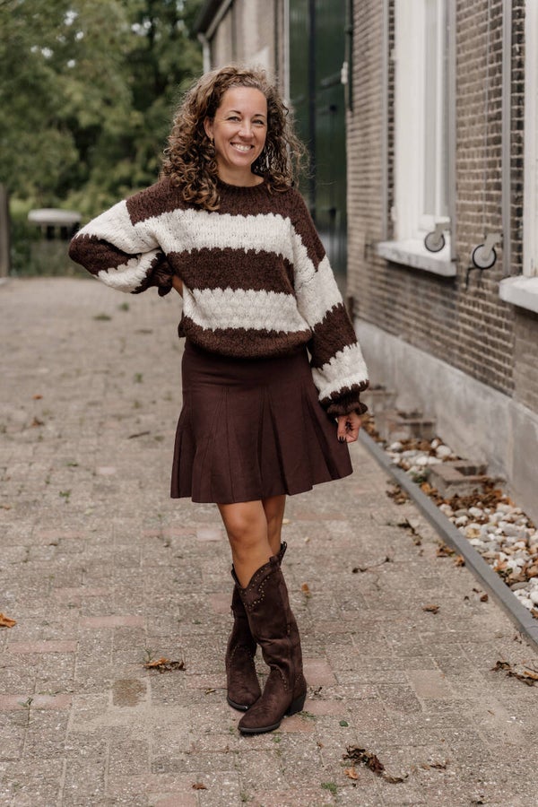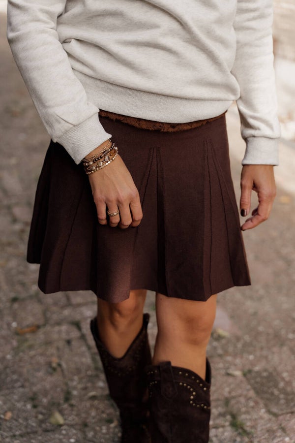 Favoriet plooi rokje van het merk By Clara. Verkijgbaar in de maten S/M en M/L. De stof bevalt veel stretch. Je shopt dit geweldige rokje in 3 najaarstinten: bruin, taupe en bordeaux. Het rokje is 50 cm lang.