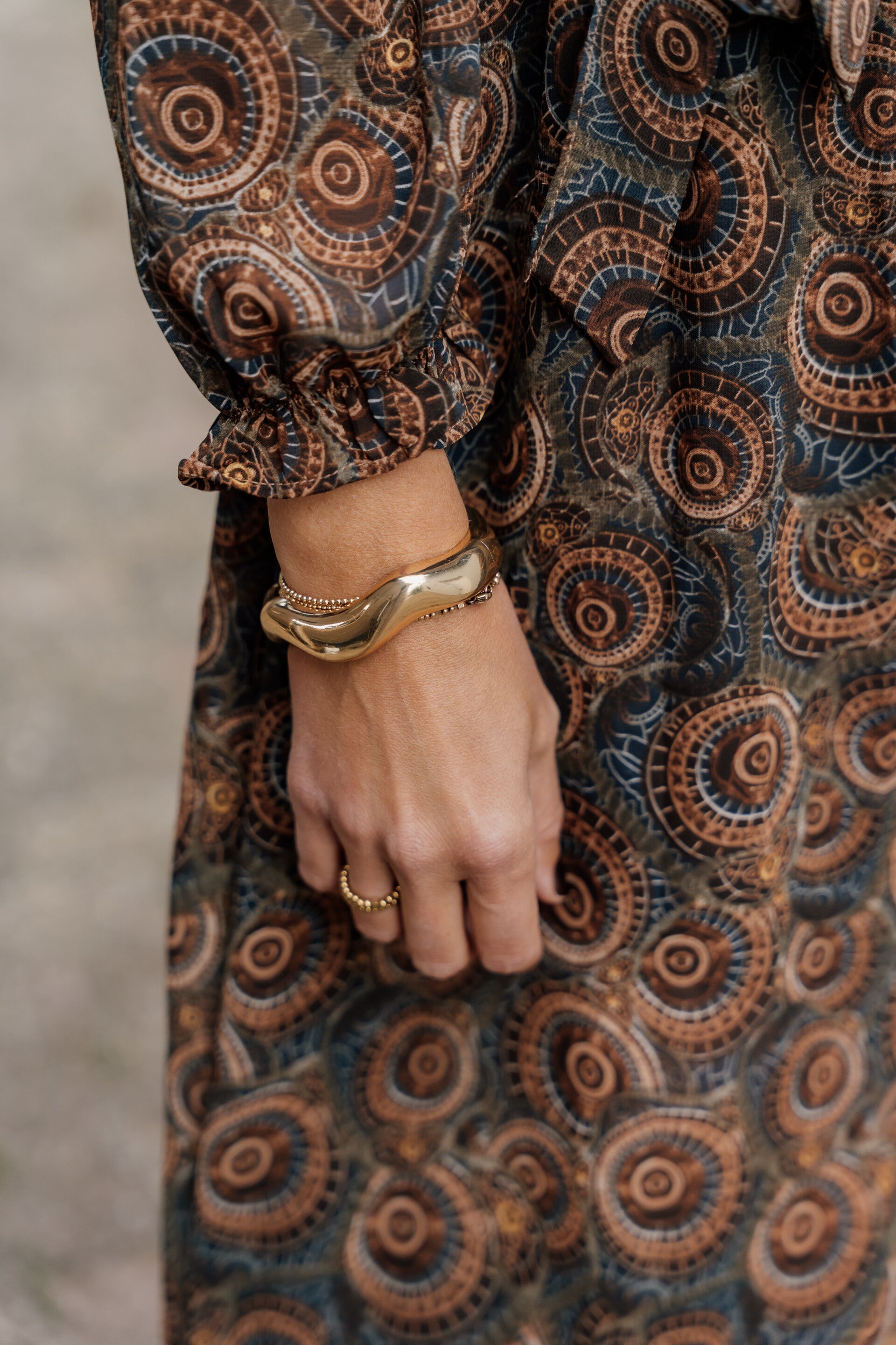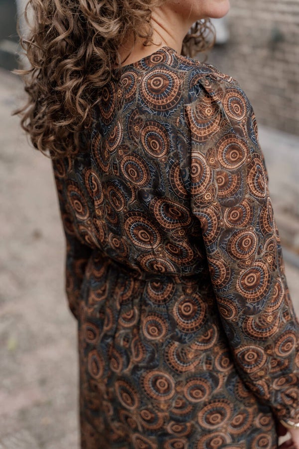 Deze jurk heeft een prachtige grafische cirkelprint in warme tinten bruin en taupe, wat zorgt voor een stijlvolle vintage look. Gemaakt van een soepelvallende stof en voorzien van een flatterende V-hals. Het strikceintuur in de taille zorgt voor een vrouwelijk silhouet.