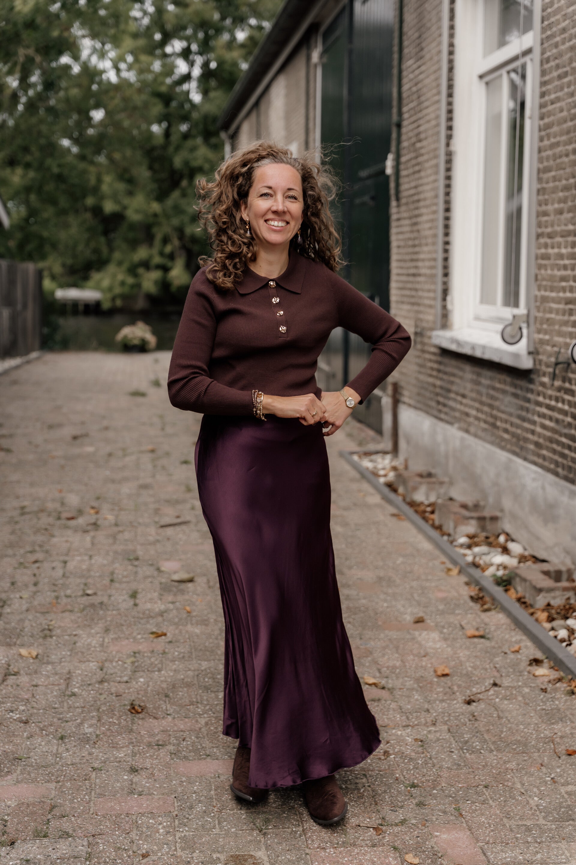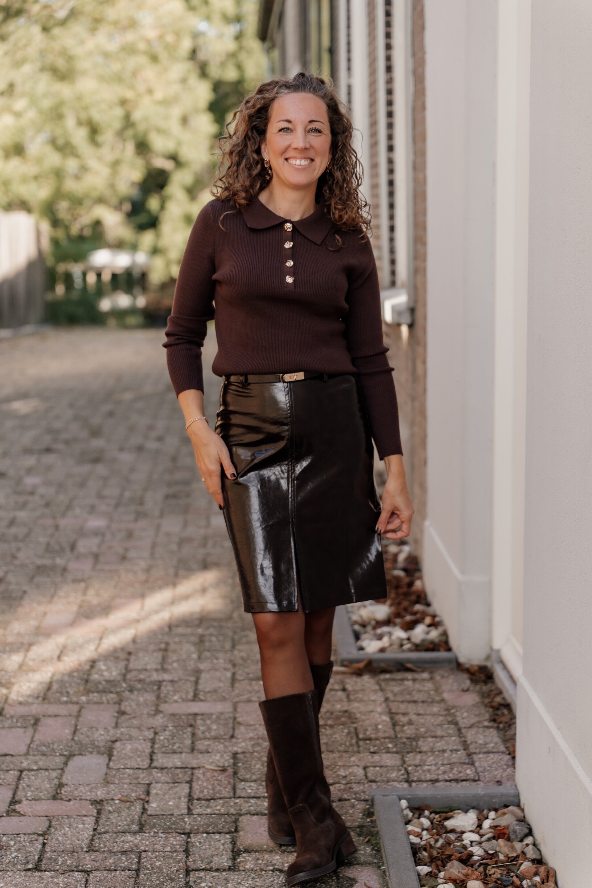 Deze gebreide top in warm bruin straalt tijdloze elegantie uit. Het subtiele kraagje en de gouden knoopjes aan de bovenzijde geven een verfijnde, klassieke touch. Dankzij de zachte stretchstof zit het truitje heerlijk comfortabel. Perfect voor een chique look met een rok of pantalon.