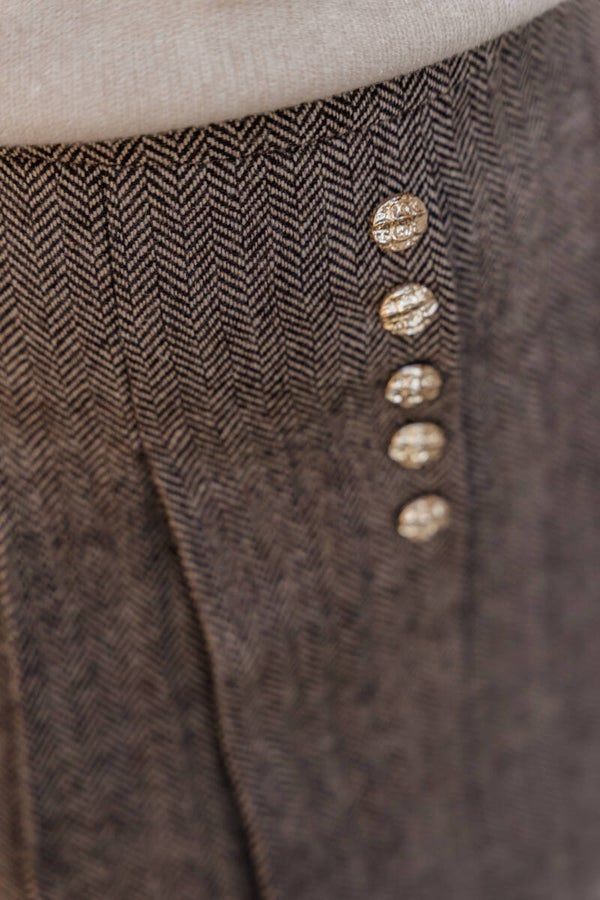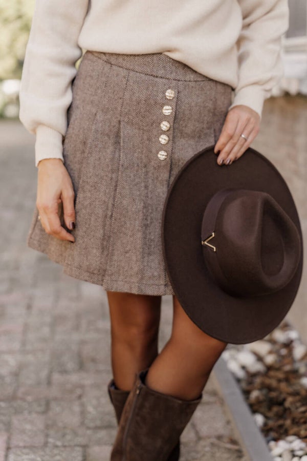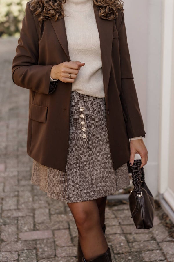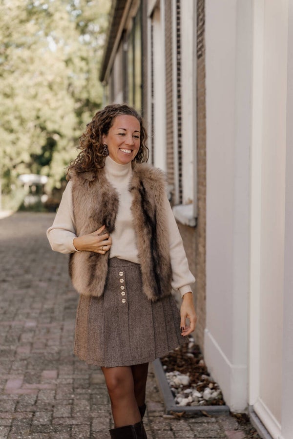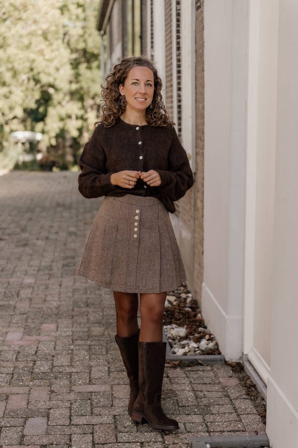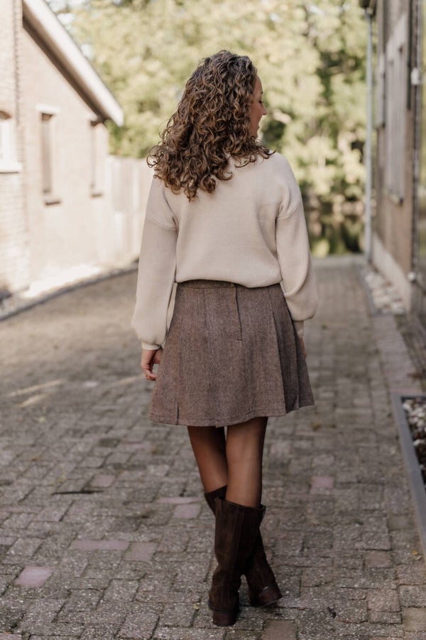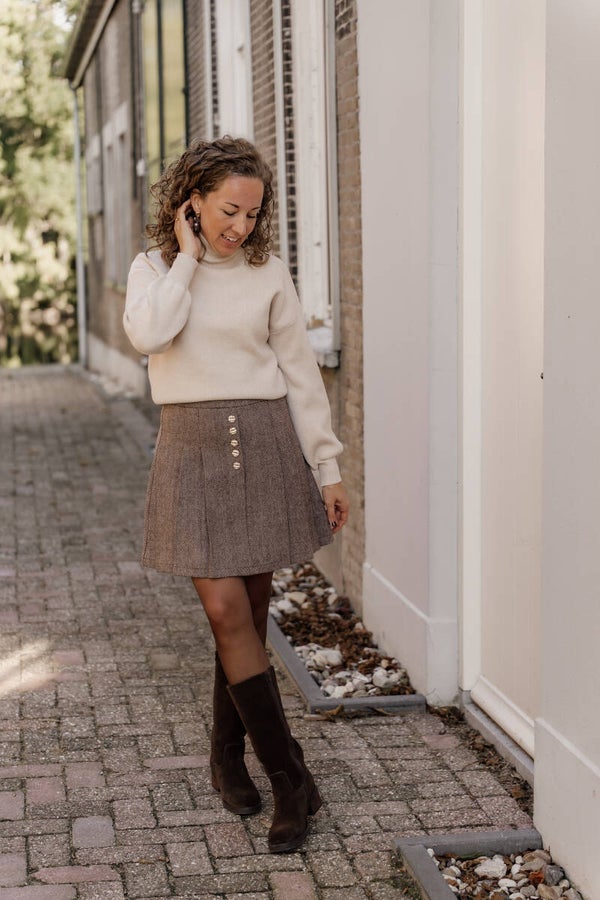 Deze stijlvolle rok is gemaakt van een zachte, kwalitatief dikke stof met visgraatpatroon. De gouden knopen aan de voorzijde geven het rokje een chique touch, terwijl de geplooide details zorgen voor een vrouwelijke en speelse uitstraling. De rok is voorzien van een rits aan de achterzijde en valt een maat kleiner. De rok is gevoerd.