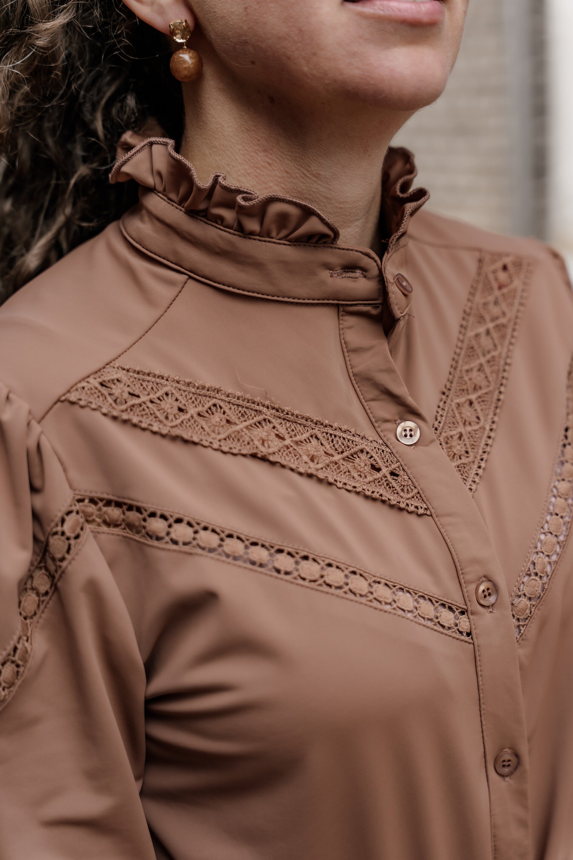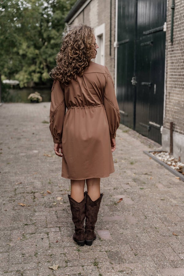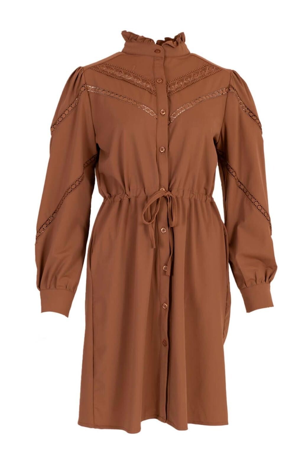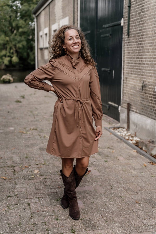 Een tijdloze jurk die elegantie en comfort perfect combineert. Deze bruine doorknoopjurk van Azzurro heeft een verfijnde hoge hals met subtiele ruches en romantische kanten details langs het schouder- en borstgedeelte. De lange mouwen met knoopmanchet en de vrouwelijke taillerie met strikkoord zorgen voor een flatterende pasvorm.