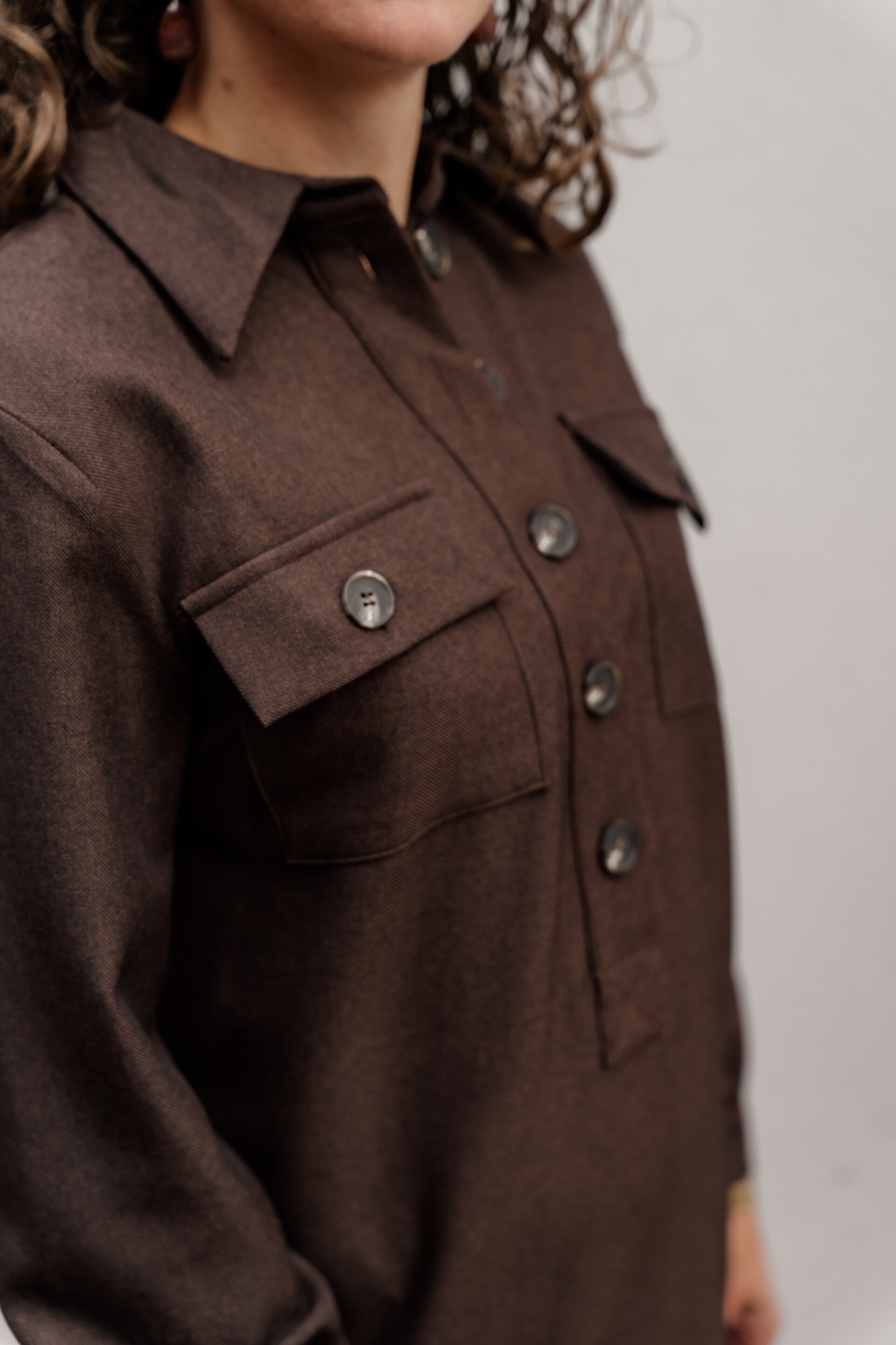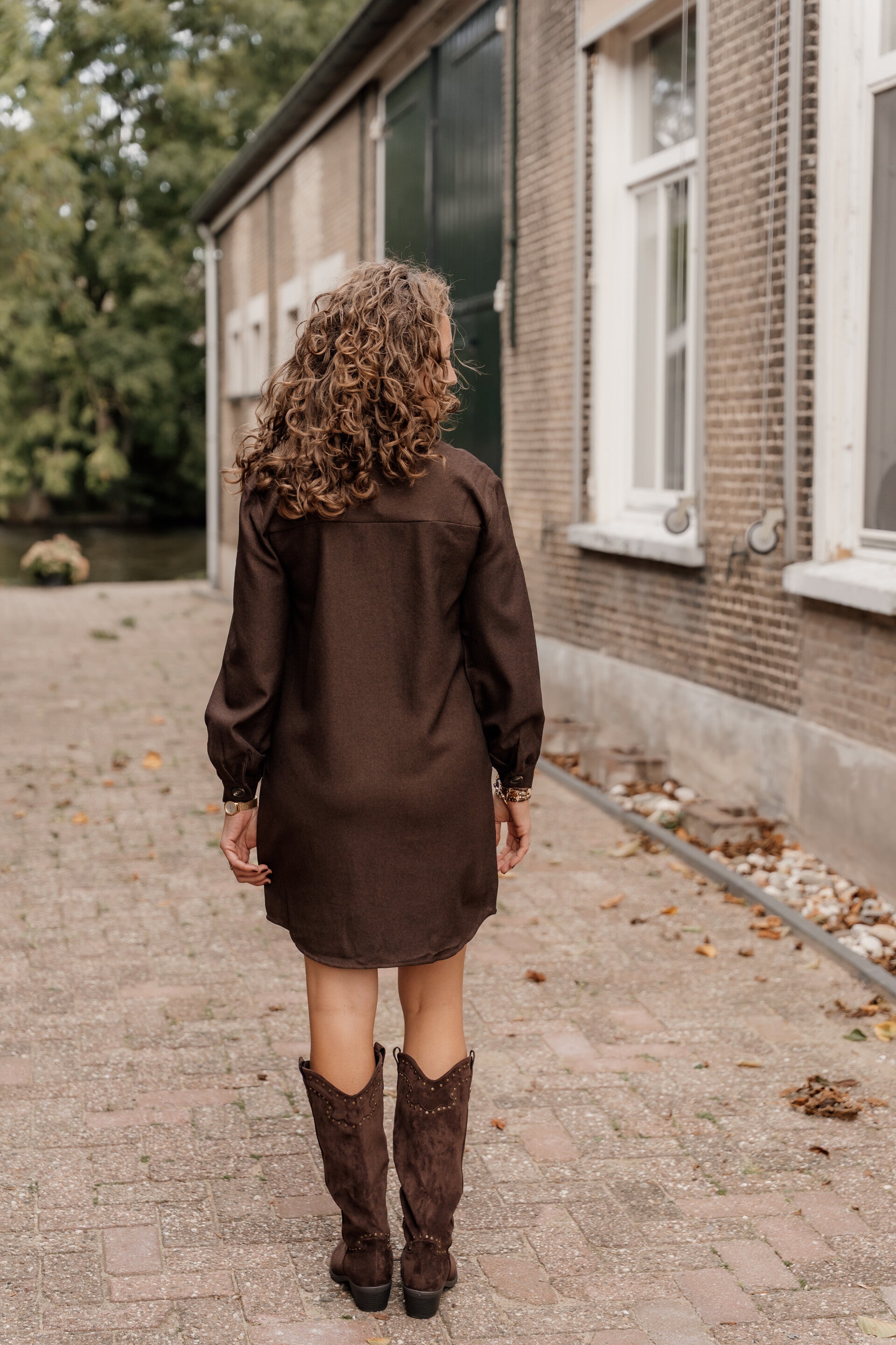 Deze jurk, gemaakt in een rijke, chocolade bruine tint, is een must-have voor je herfstgarderobe. Het gedetailleerde silhouet heeft lange mouwen, klepzakken aan de voorkant en een verfijnde knoopsluiting. De jurk is gemaakt van een zachte, hoogwaardige en dikke kwaliteit stof en is zowel comfortabel als chic. Combineer hem met laarzen, zoals afgebeeld, voor een complete herfstlook die comfortabel, stijlvol en moeiteloos elegant is.