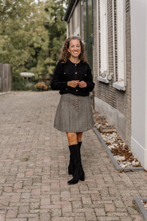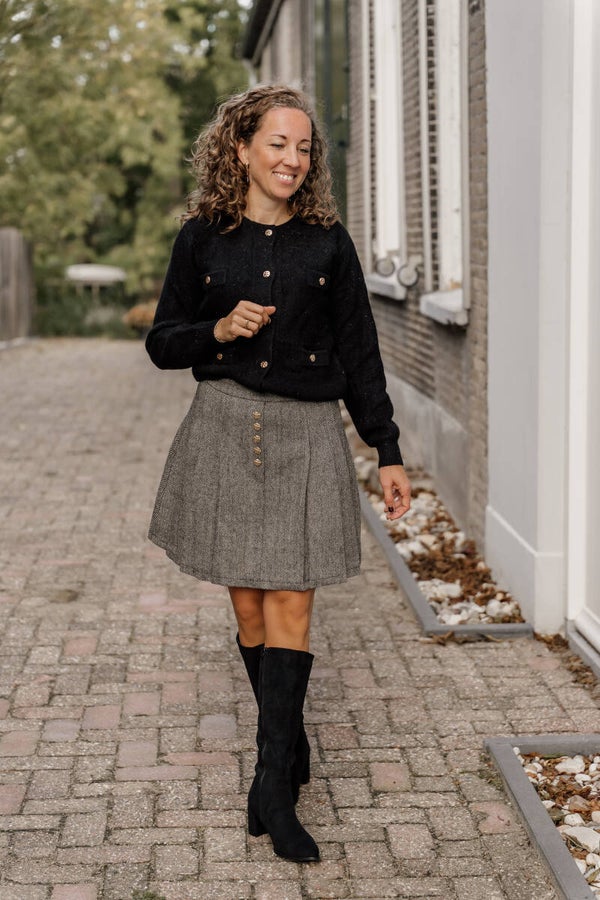 Deze stijlvolle rok is gemaakt van een zachte, kwalitatief dikke stof met visgraatpatroon. De gouden knopen aan de voorzijde geven het rokje een chique touch, terwijl de geplooide details zorgen voor een vrouwelijke en speelse uitstraling. De rok is voorzien van een rits aan de achterzijde en valt een maat kleiner. De rok is gevoerd.