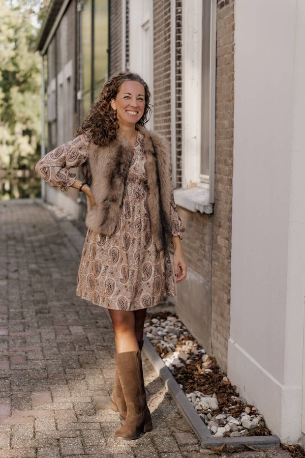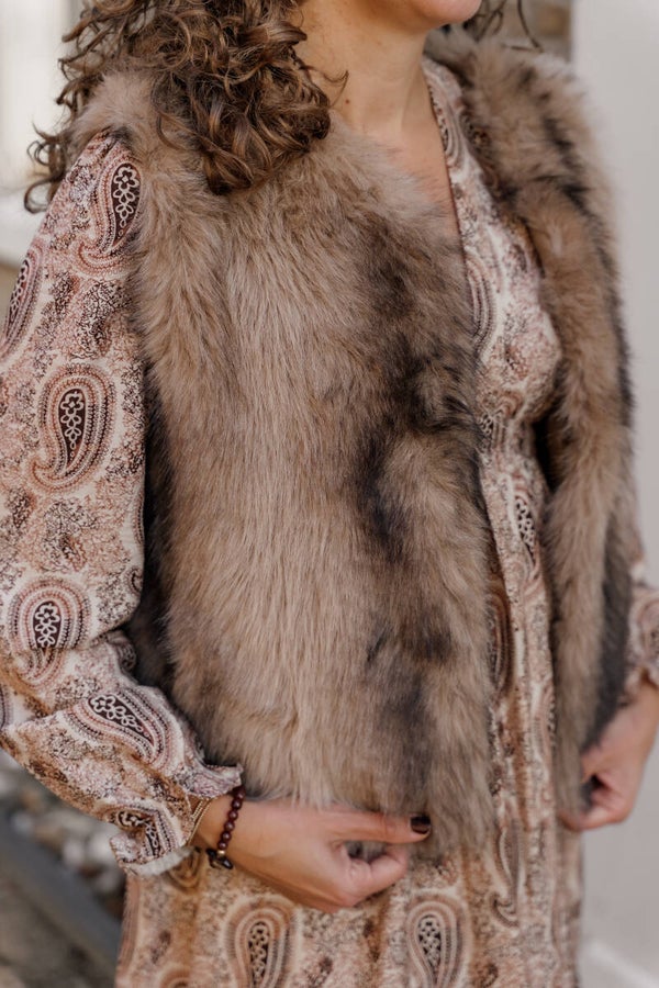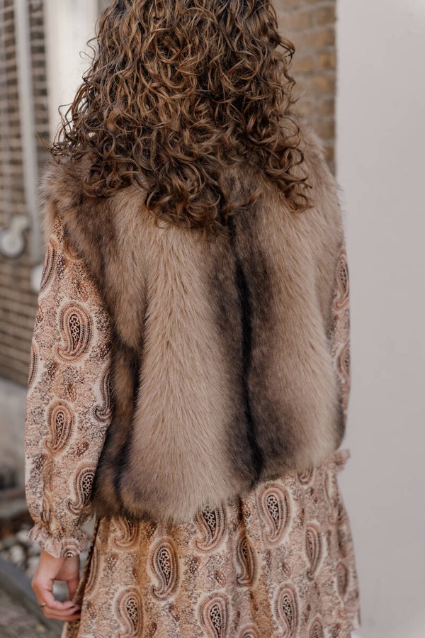Voeg een vleugje luxe toe aan je outfit met dit prachtige faux fur gilet. Het gilet is volledig gevoerd en gemaakt van een mooie, dikke kwaliteit die heerlijk zacht aanvoelt. De warme beige/bruine tint maakt het gemakkelijk te combineren met jurken, blouses of truien. Ideaal voor een stijlvolle, gelaagde look in de herfst en winter.