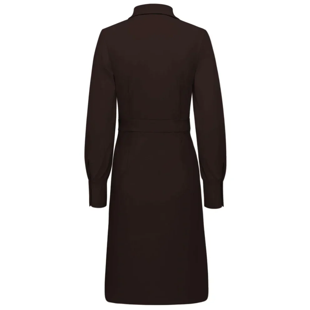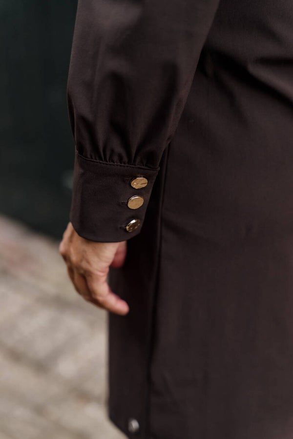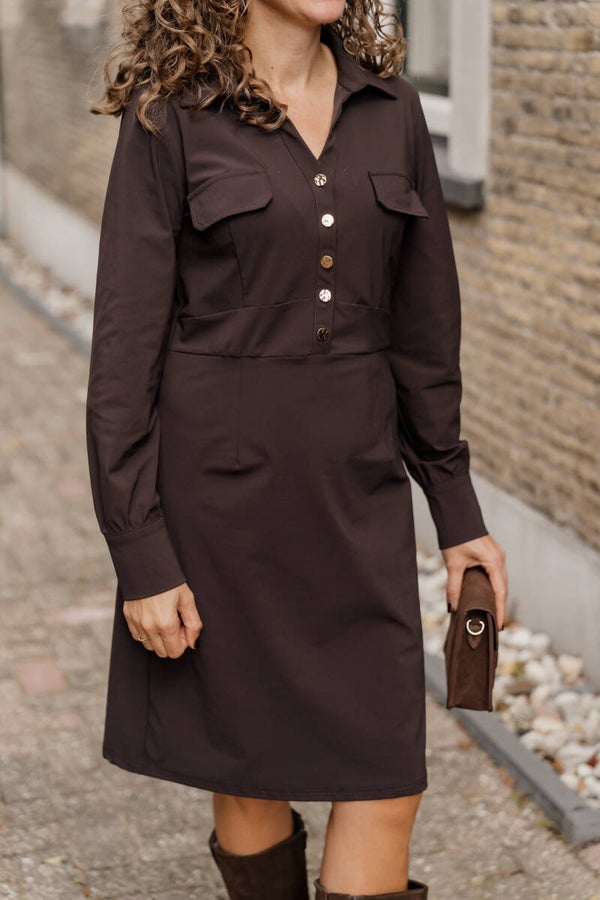 Een prachtige jurk van het merk Triple Nine. De jurk met kraag en lange mouwen is aan de bovenkant getailleerd en heeft een knoopsluiting met gouden knoopjes. De jurk valt in de meeste gevallen iets boven de knie. Dit item van top kwaliteit travelstof valt ruim, advies om een maatje kleiner te nemen.