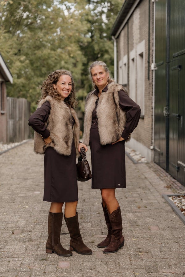 Lengte van de jurk is 102 cm. Mariëlle is 1,68 m en draagt maat S, Rianne is 1,78 m en draagt maat L.