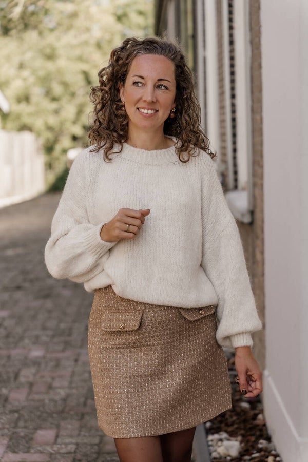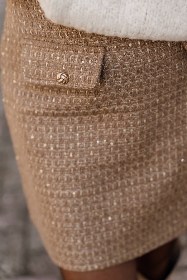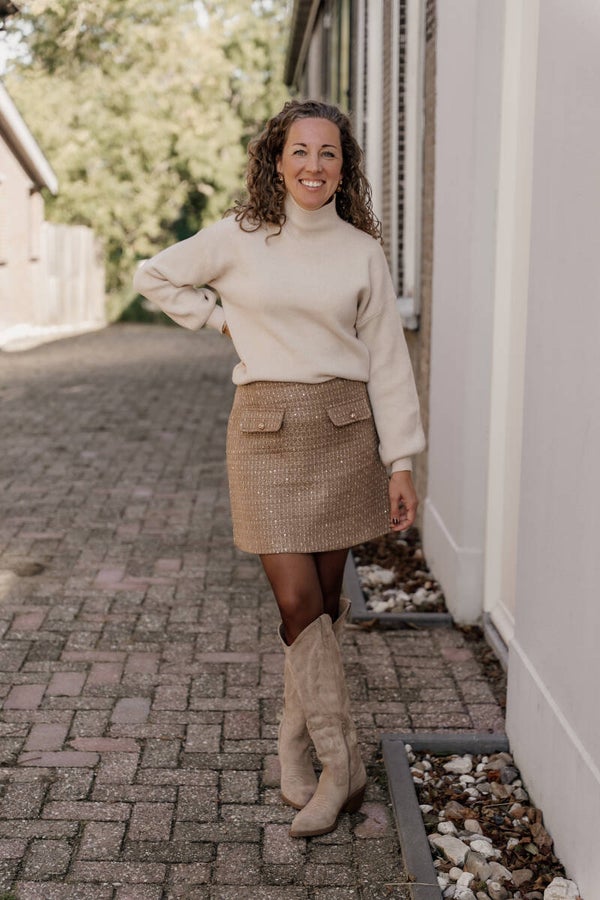 Voeg een vleugje elegantie toe aan je outfit met dit prachtige lurex tweed rokje in de kleur camel. Het rokje is gevoerd en heeft een chique geweven structuur met subtiele glitters, waardoor het zowel stijlvol als feestelijk oogt. De twee decoratieve zakjes met goudkleurige knoopdetails aan de voorkant geven het rokje een classy, vrouwelijke uitstraling.