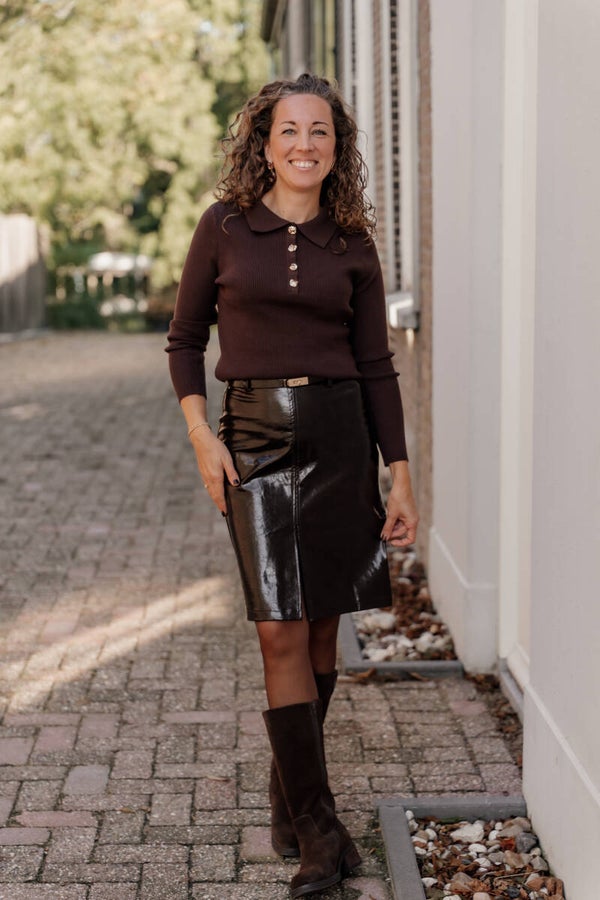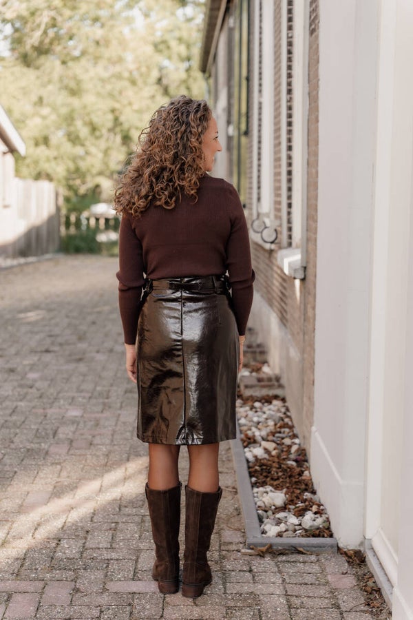 Stijlvolle laklook rok met split aan de voorzijde. De rok is voorzien van een bijpassend riempje, maar kan ook zonder riempje gedragen worden. De rok sluit aan de achterzijde met een rits.