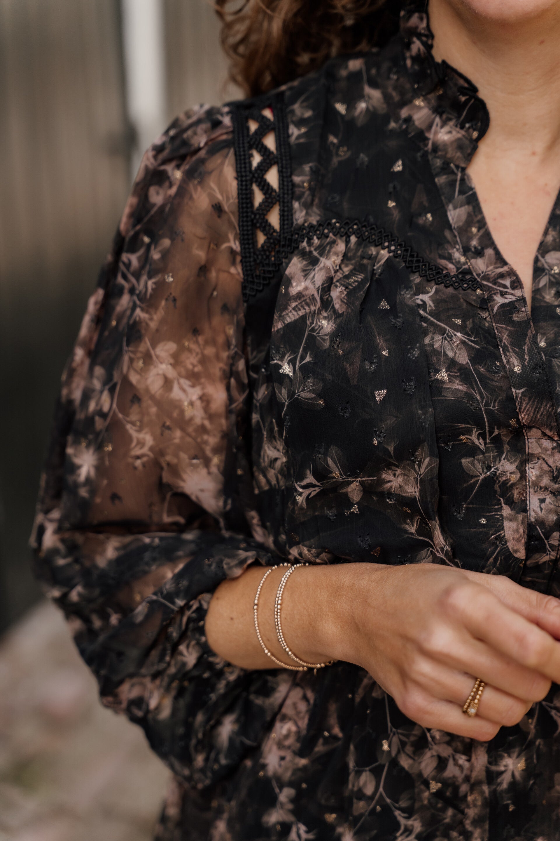 Deze romantische jurk in prachtige herfstkleuren is een echte eyecatcher! De rijke mix van zwart en beige tinten, gecombineerd met subtiele goudaccenten, geeft de jurk een luxe uitstraling. De pofmouwen en fijne plooien bij de schouders zorgen voor een elegante, vrouwelijke look.