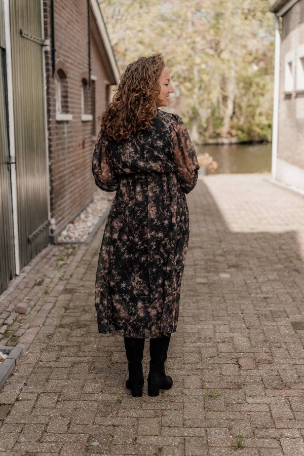 Deze romantische lange jurk in prachtige herfstkleuren is een echte eyecatcher! De rijke mix van zwart en beige tinten, gecombineerd met subtiele goudaccenten, geeft de jurk een luxe uitstraling. De pofmouwen en fijne plooien bij de schouders zorgen voor een elegante, vrouwelijke look.