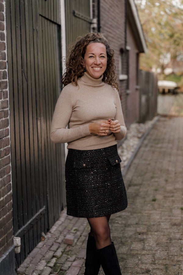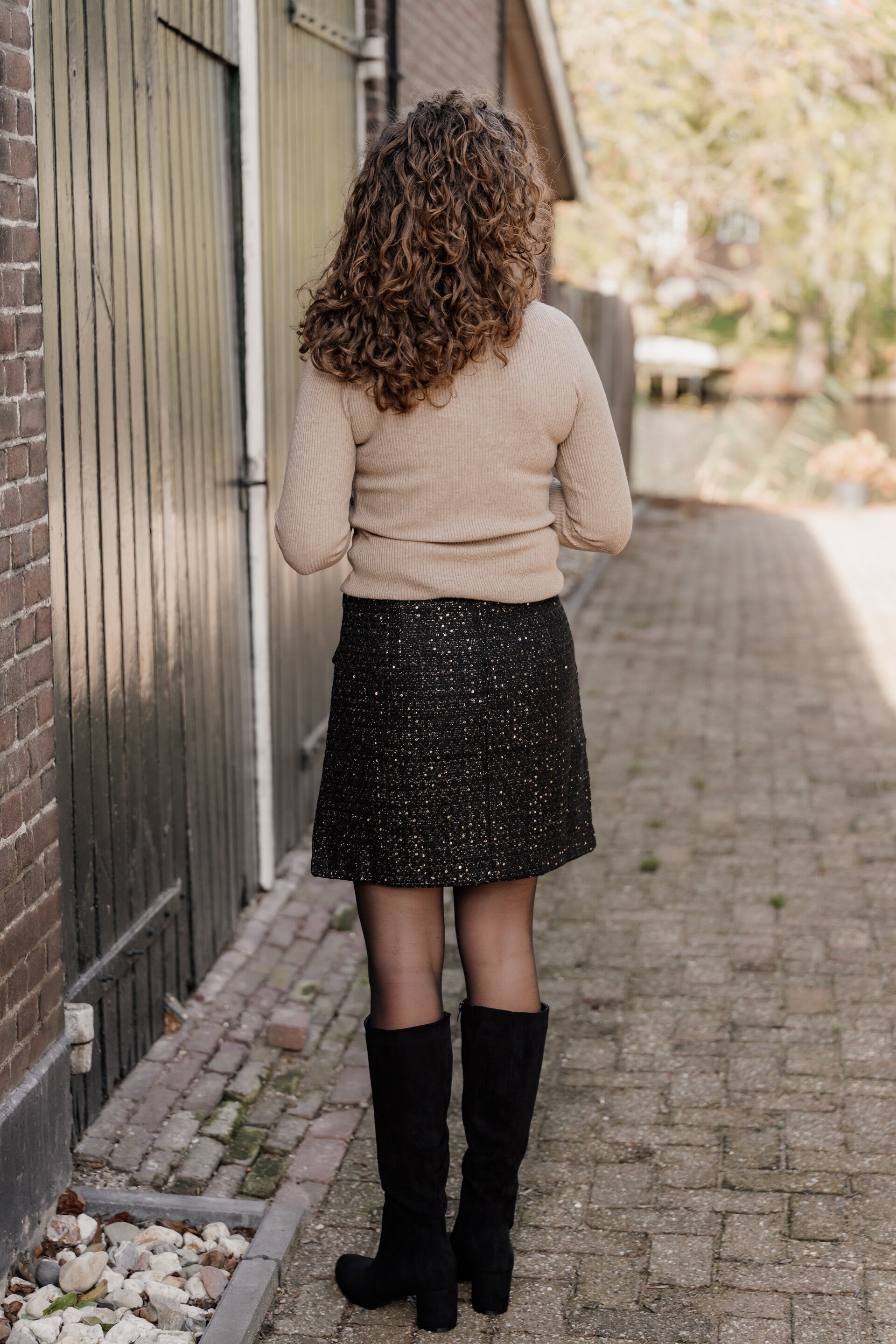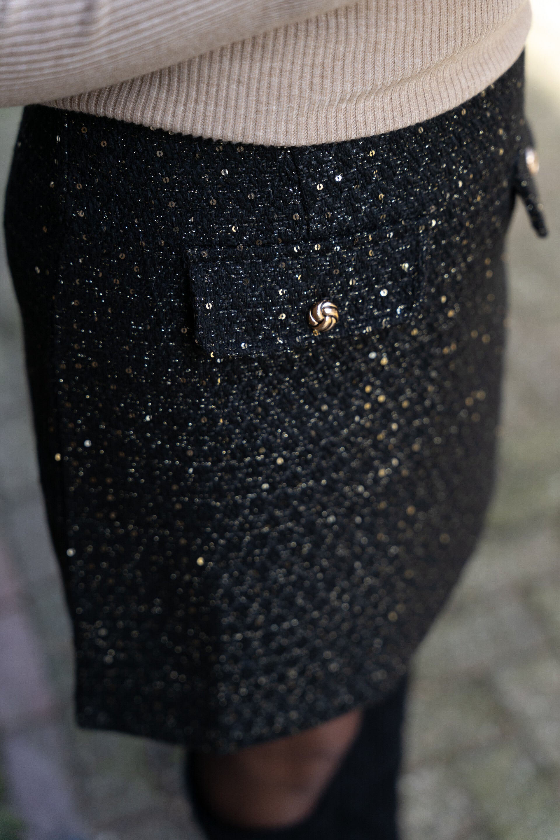 Voeg een vleugje elegantie toe aan je outfit met dit prachtige lurex tweed rokje in het zwart. Het rokje is gevoerd en heeft een chique geweven structuur met subtiele gouden glitters, waardoor het zowel stijlvol als feestelijk oogt. De twee decoratieve zakjes met goudkleurige knoopdetails aan de voorkant geven het rokje een classy, vrouwelijke uitstraling. Het rokje bevat een rits aan de achterzijde.