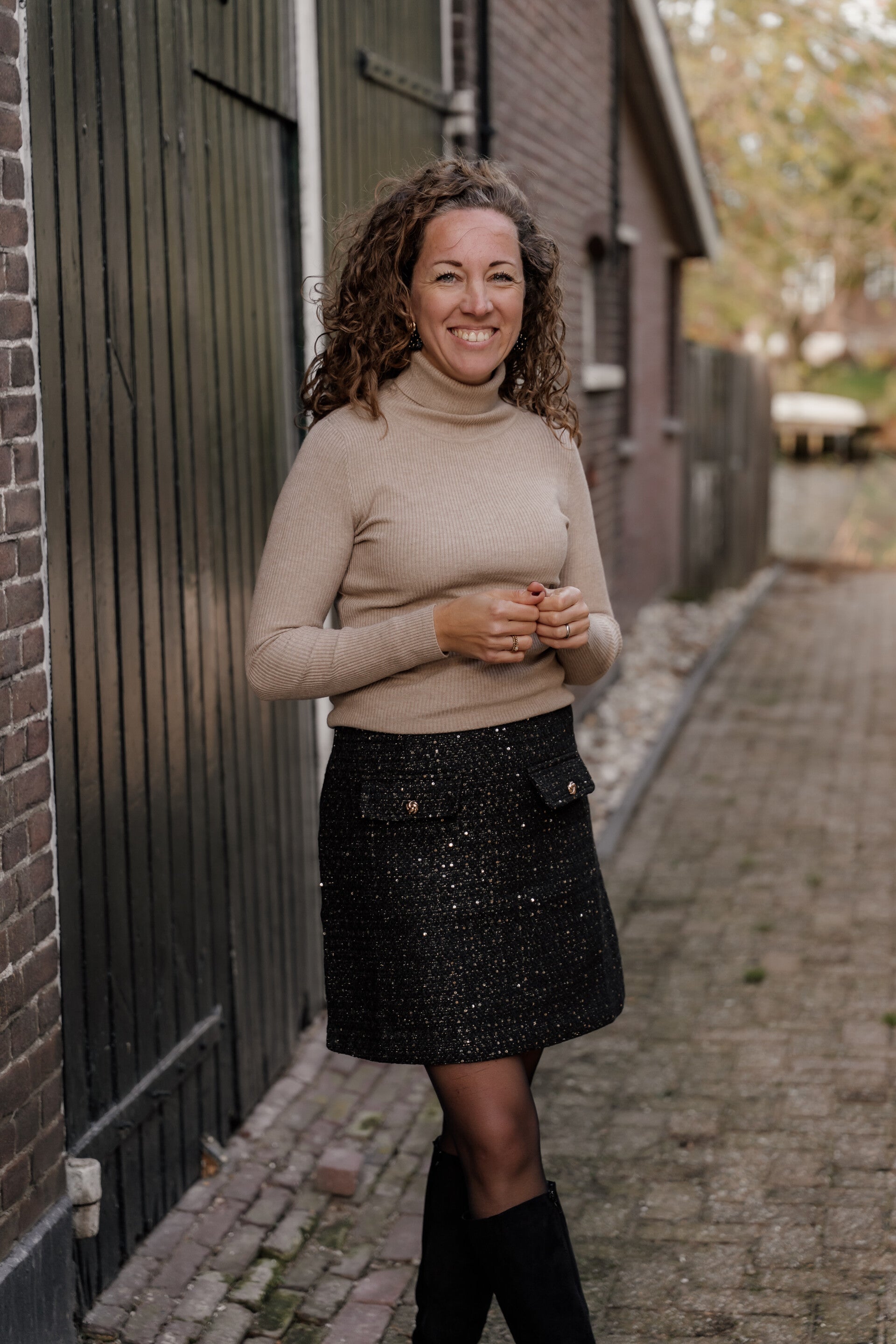 Lengte van het rokje is 44,5 cm (gemeten bij maat M). Mariëlle is 1,68 m en draagt maat M.