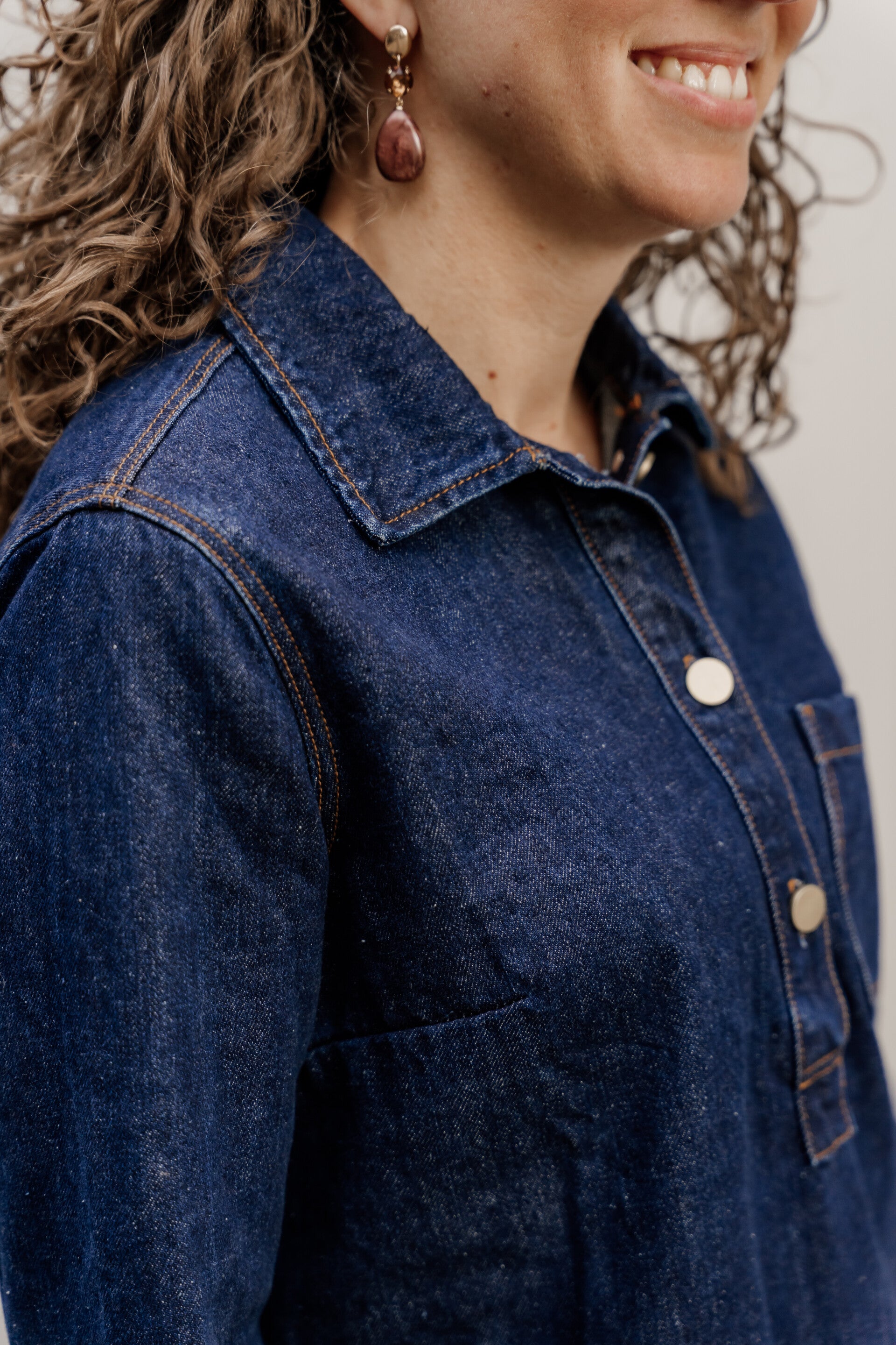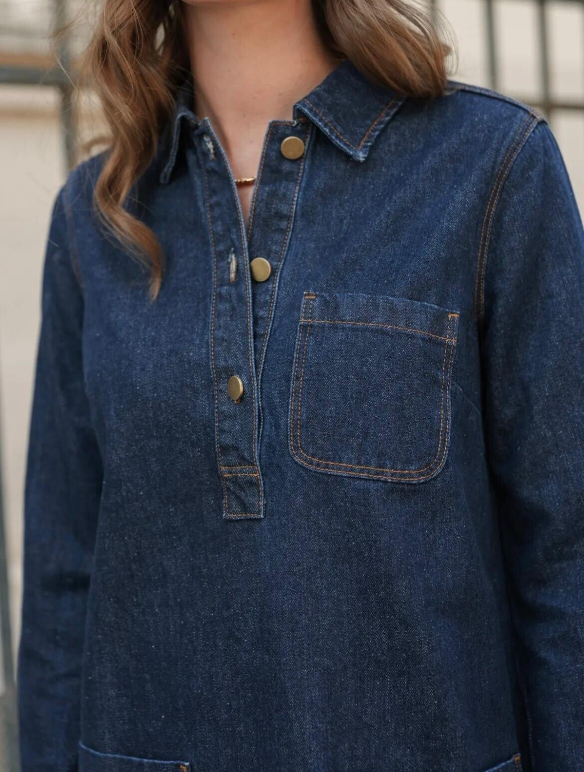 Deze denim jurk is een perfecte combinatie van comfort en stijl. Gemaakt van stevig, hoogwaardig denim met subtiele stiksels, biedt deze jurk een casual maar verzorgde look voor elke dag. Het rechte silhouet valt soepel om het lichaam en de knoopsluiting aan de hals voegt een speels, utilitaire touch toe.