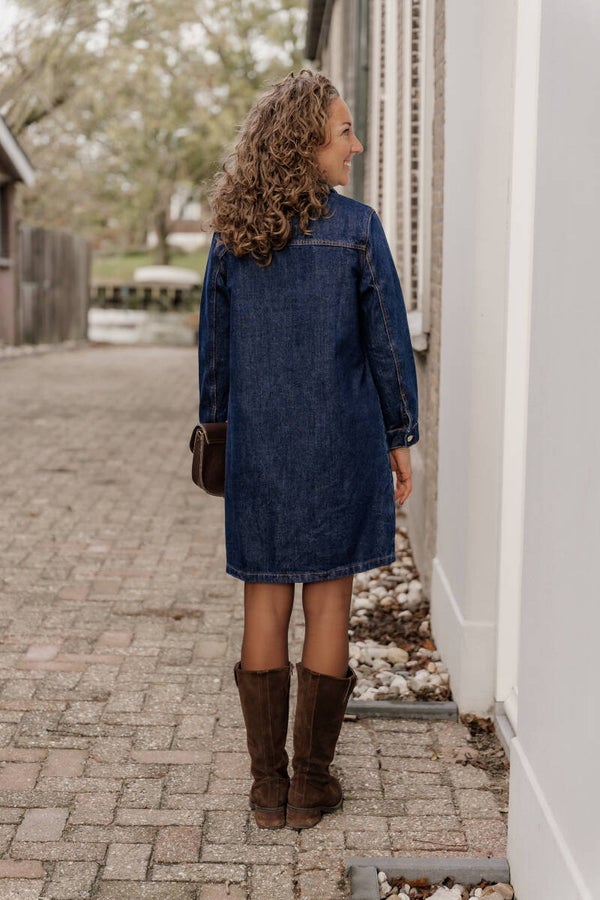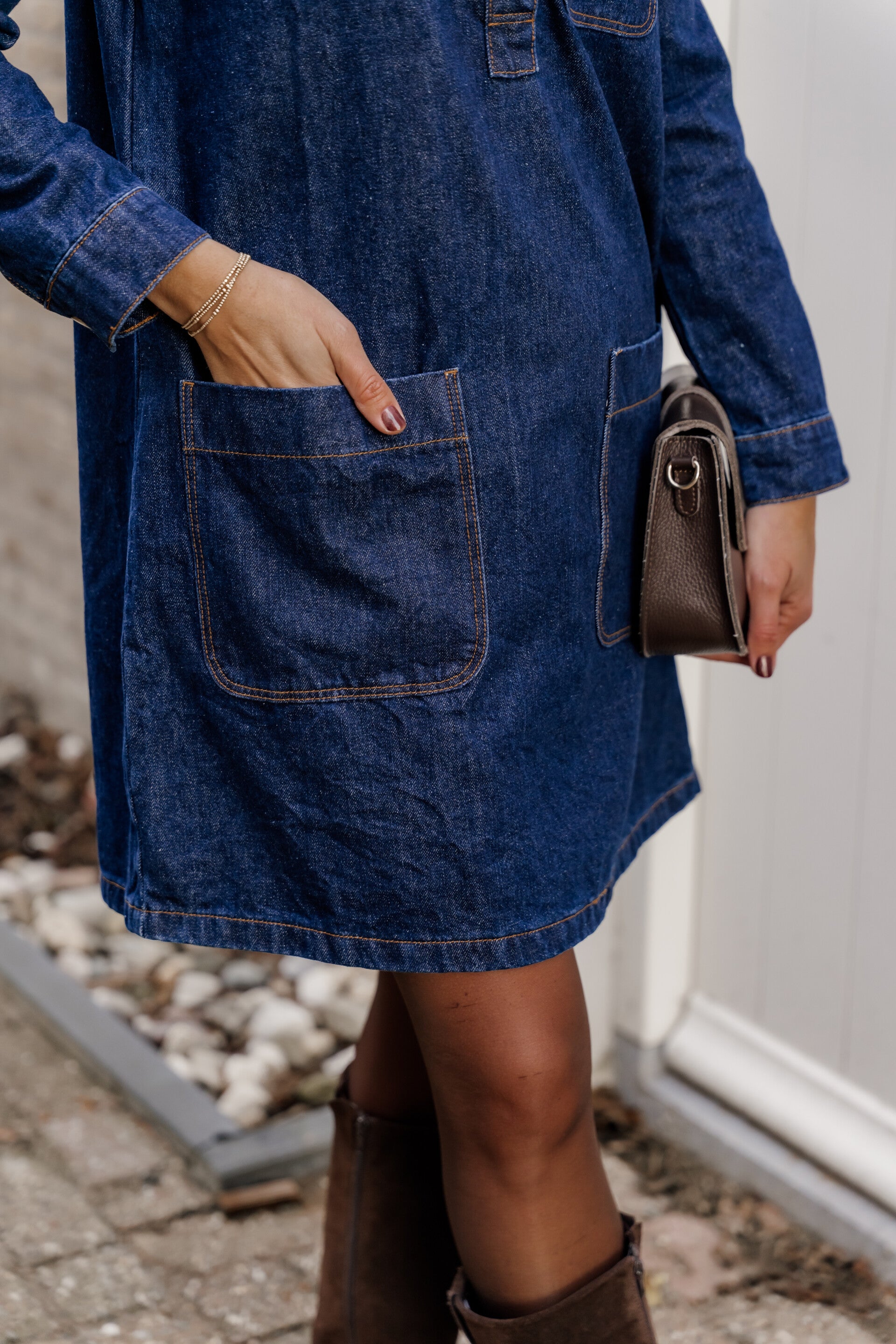Met drie praktische opgestikte zakken - één op de borst en twee aan de voorkant - is deze jurk niet alleen mooi, maar ook functioneel. Draag de jurk met bruine laarzen voor een stijlvolle outfit.