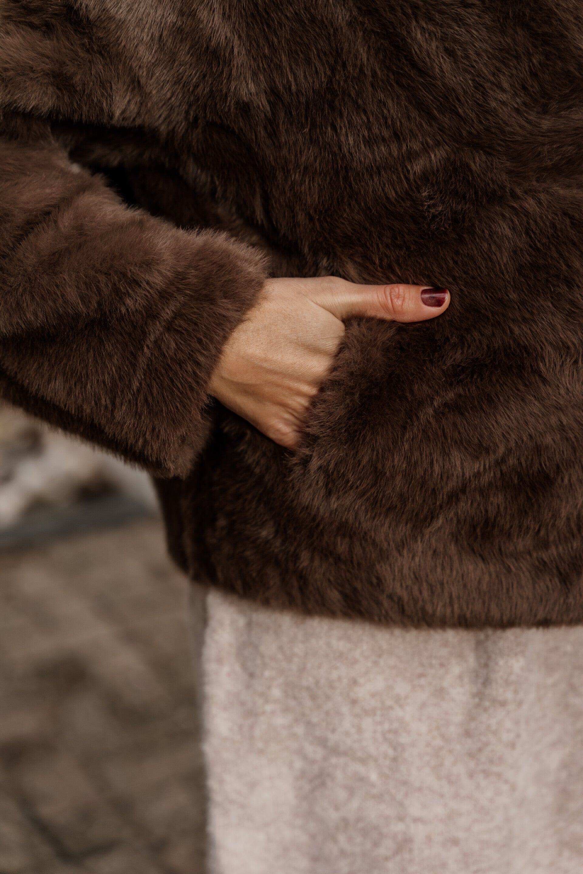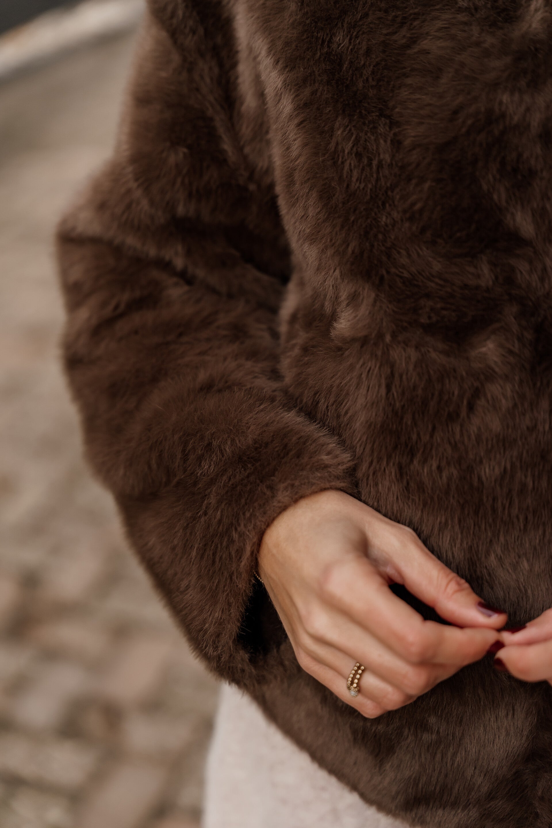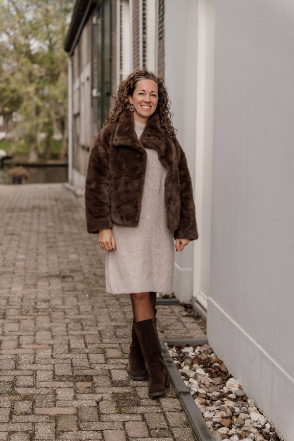 Prachtig gevoerde jas van faux fur in chocolade bruine kleur. De jas is gemaakt van dikke kwaliteit waardoor deze heerlijk warm en zacht aanvoelt, geschikt voor koude dagen. De jas bevat stevige drukknopen en een hoge hals bovenaan waardoor er geen sjaal nodig is om het warm te hebben.