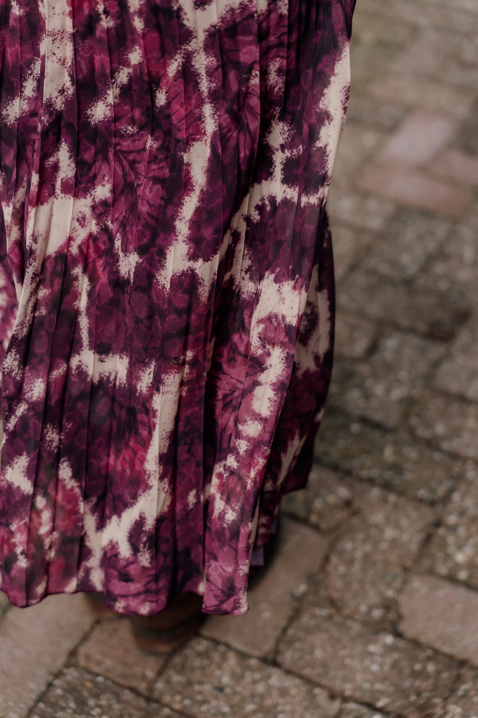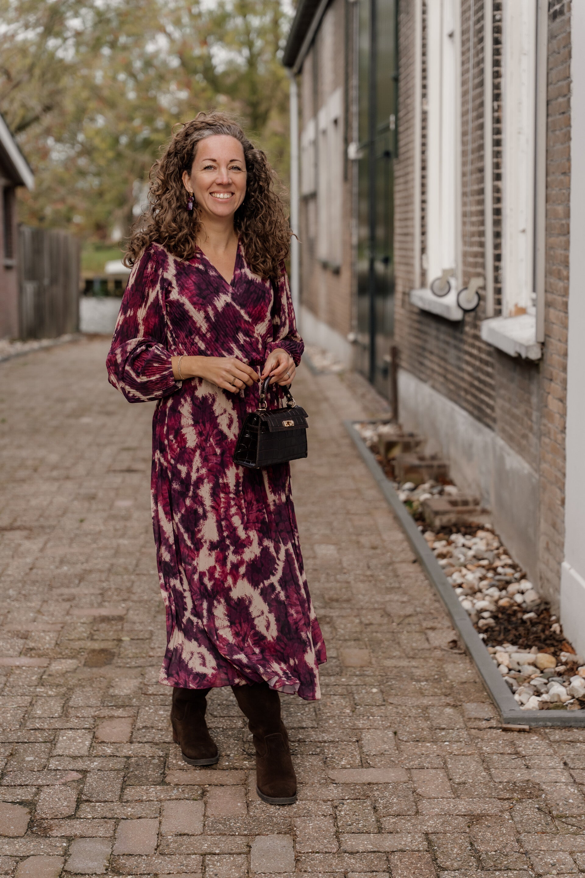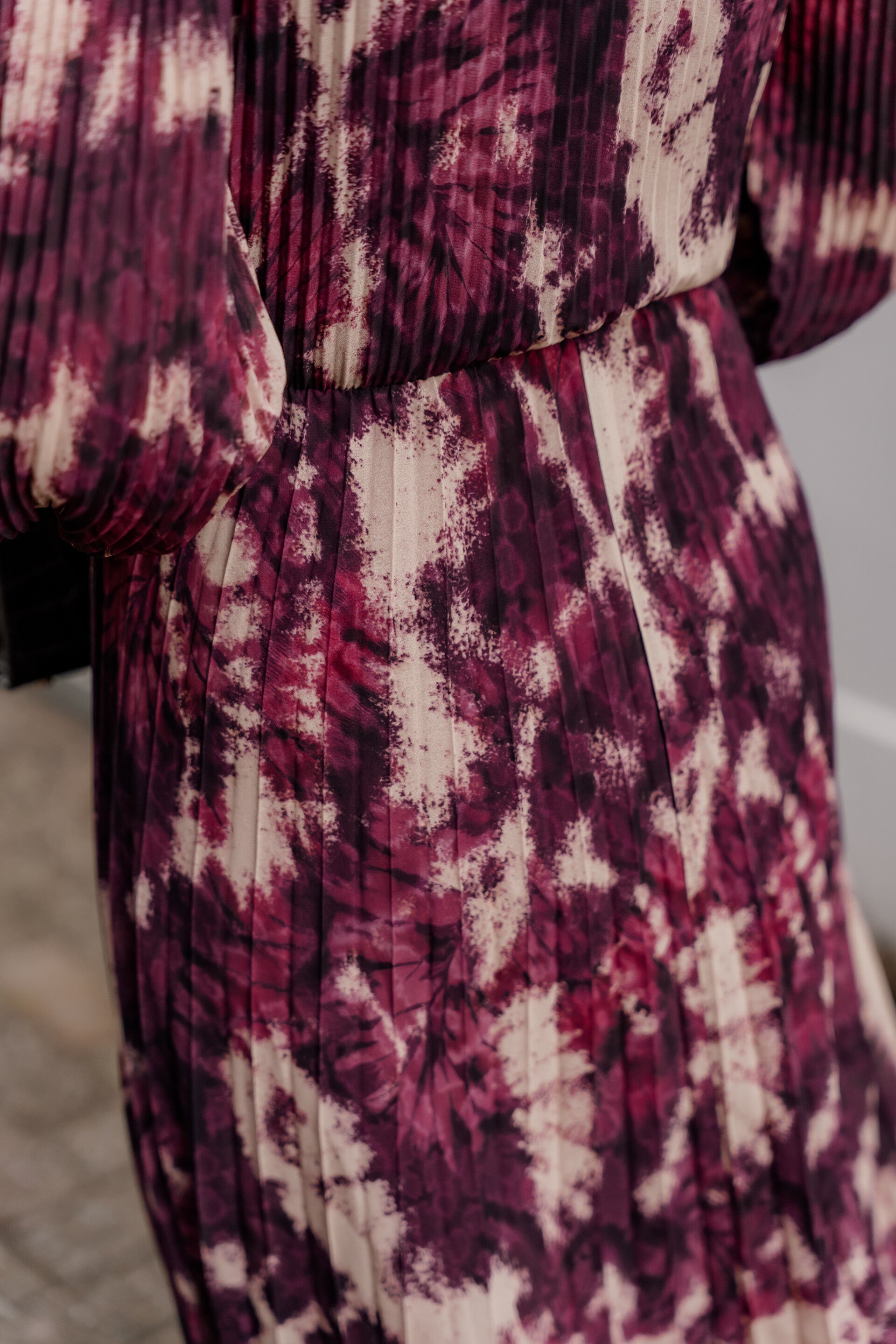 Deze prachtige jurk combineert een vrouwelijke snit met een speelse, bordeaux print. De overslaghals en elastische taille zorgen voor een flatterend silhouet, terwijl de luchtige stof elegant met je meebeweegt.