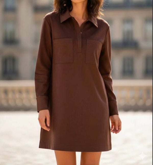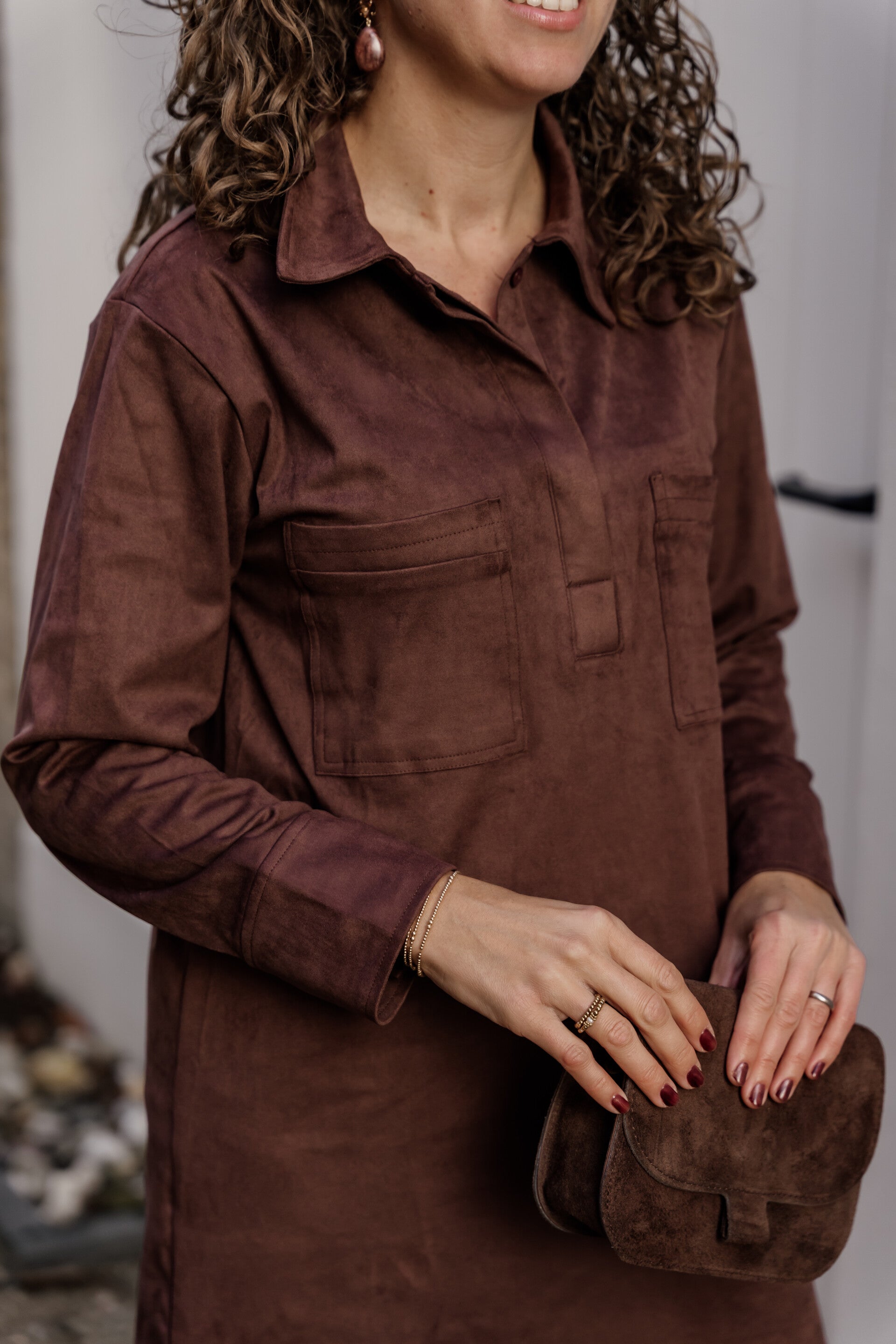 De twee opgestikte borstzakken voegen een subtiel detail toe, terwijl de lange mouwen en nette afwerking de jurk perfect maken voor het najaar. Dankzij de suedine stof voelt de jurk extra zacht aan en heeft ze een rijke, verfijnde look.