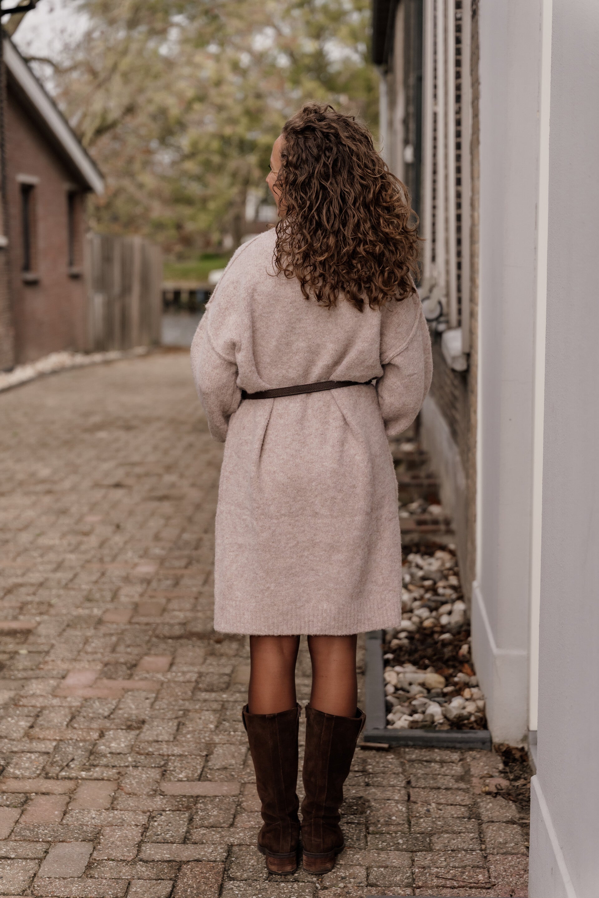 De lengte van de jurk is 105 cm (zonder ceintuur), ideaal te combineren met een panty en hoge laarzen voor een warme, stijlvolle herfst- of winteroutfit.