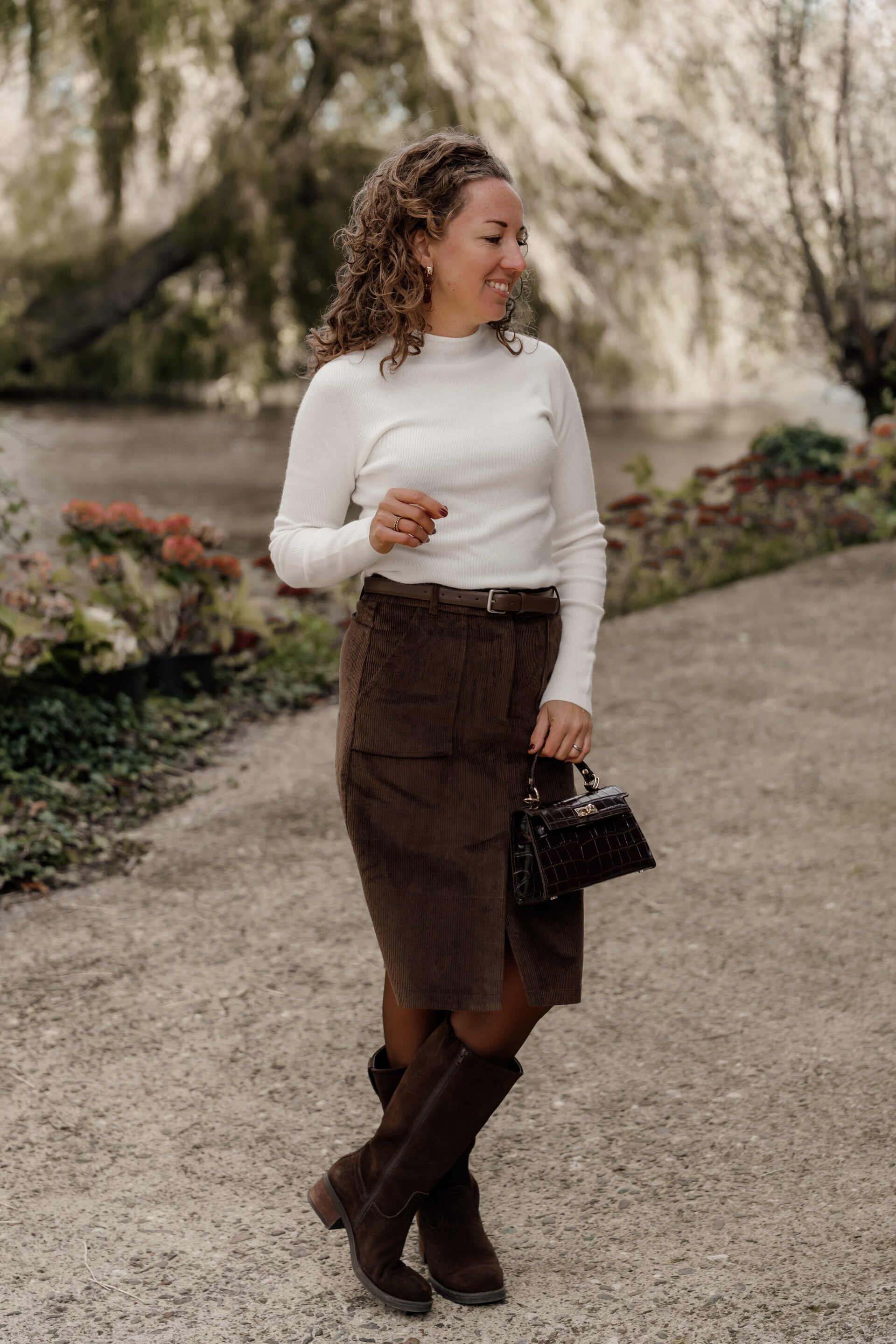 Deze prachtige corduroy midi-rok in een diepe chocoladebruine kleur is een stijlvolle musthave voor het najaar! De zachte ribfluwelen stof voelt stevig maar comfortabel aan en geeft de rok een luxe, tijdloze uitstraling. De rechte pasvorm en de elegante split aan de voorkant zorgen voor een vrouwelijke en flatterende look.