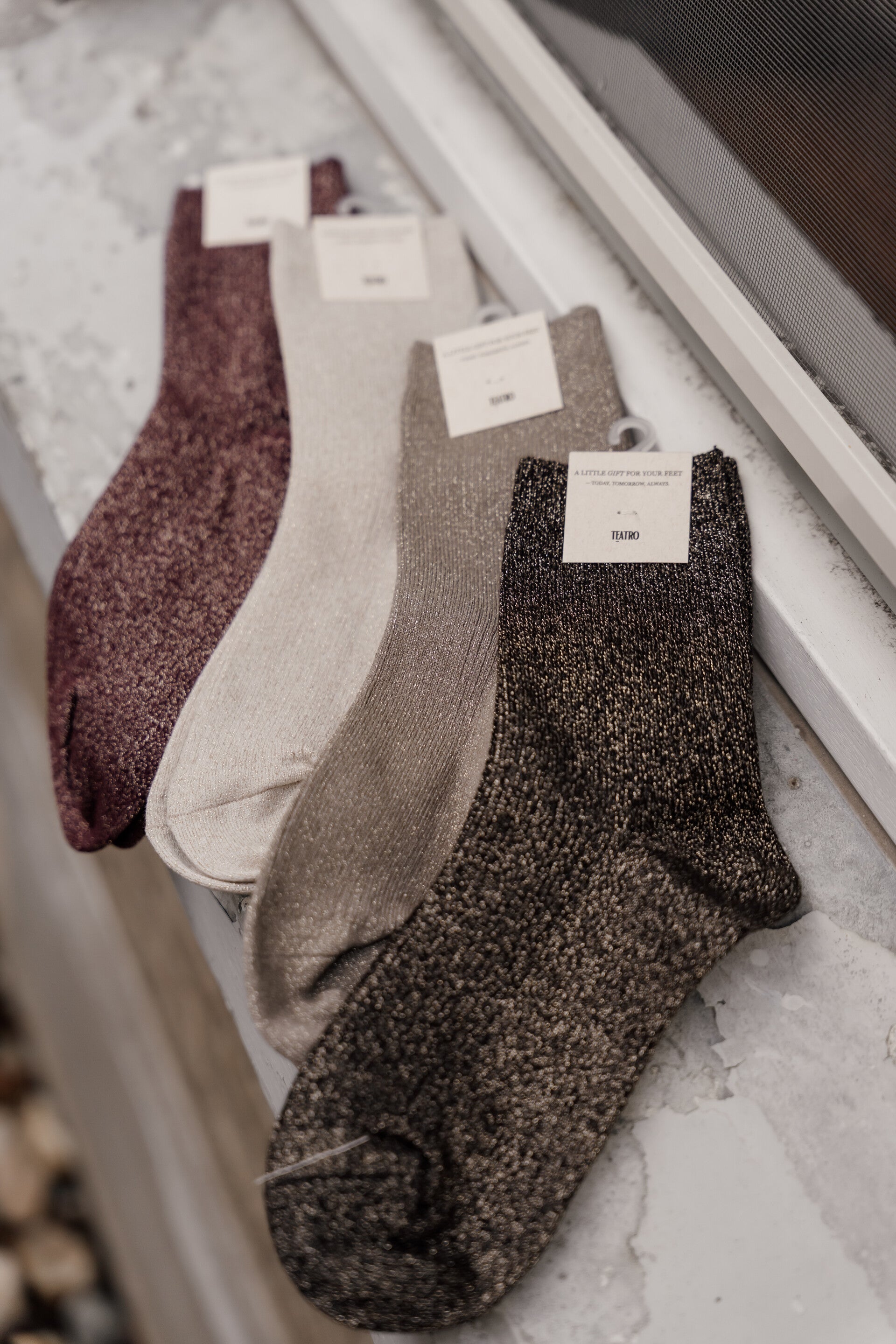 De sokken zijn afgewerkt met een subtiel gouden lurex glitterdraadje en verkrijgbaar in vier kleuren: burgundy, taupe, donkerbruin en beige. One size, geschikt van maat 36-41.