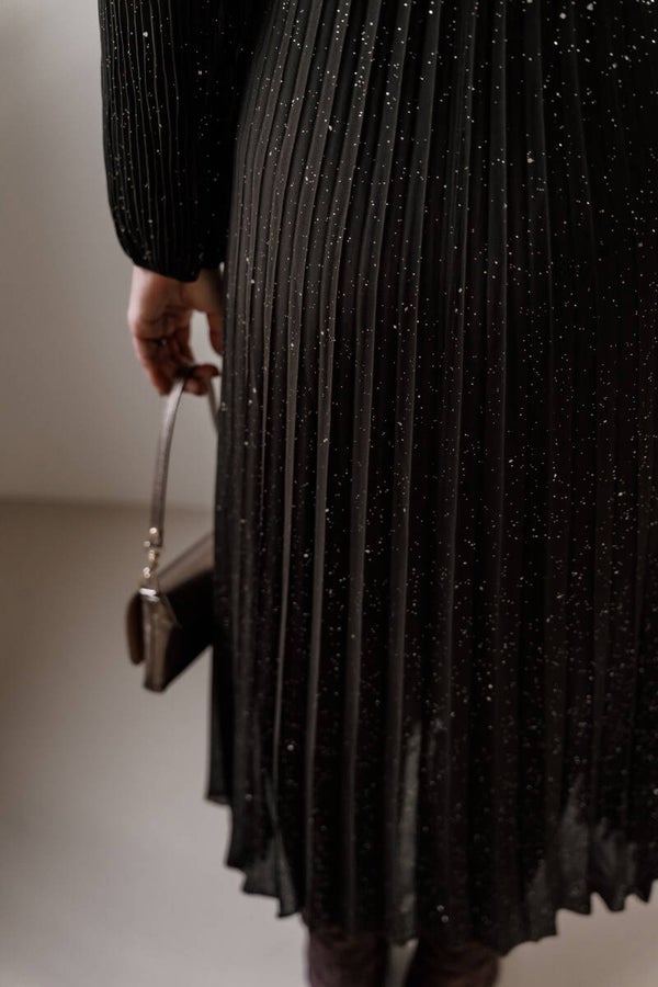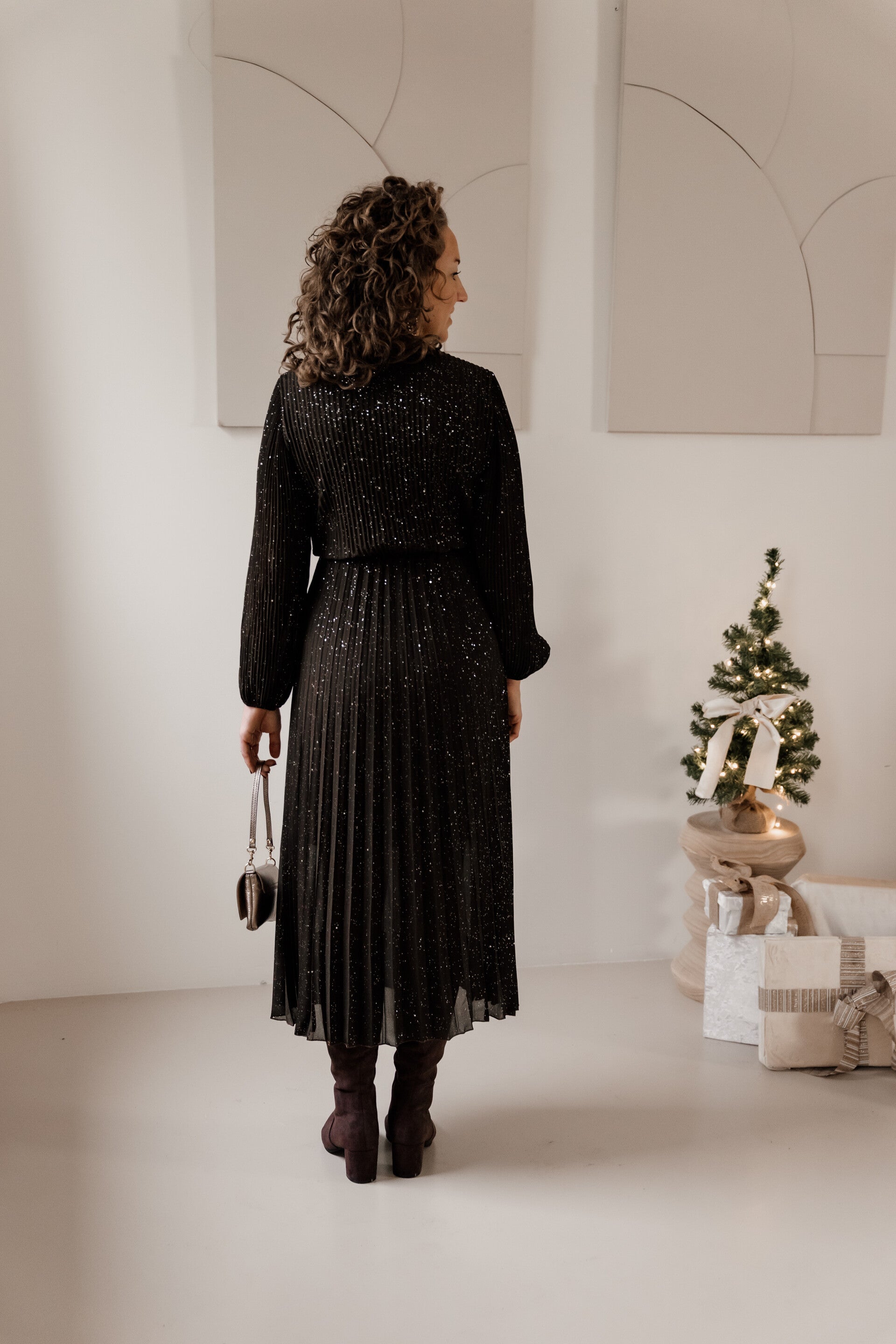 De plissé rok valt soepel en creëert een elegante beweging bij elke stap. Dankzij de flatterende tailleband ontstaat er een mooi zandloperfiguur, zonder in te leveren op draagcomfort. Perfect voor diners, borrels of feestdagen.