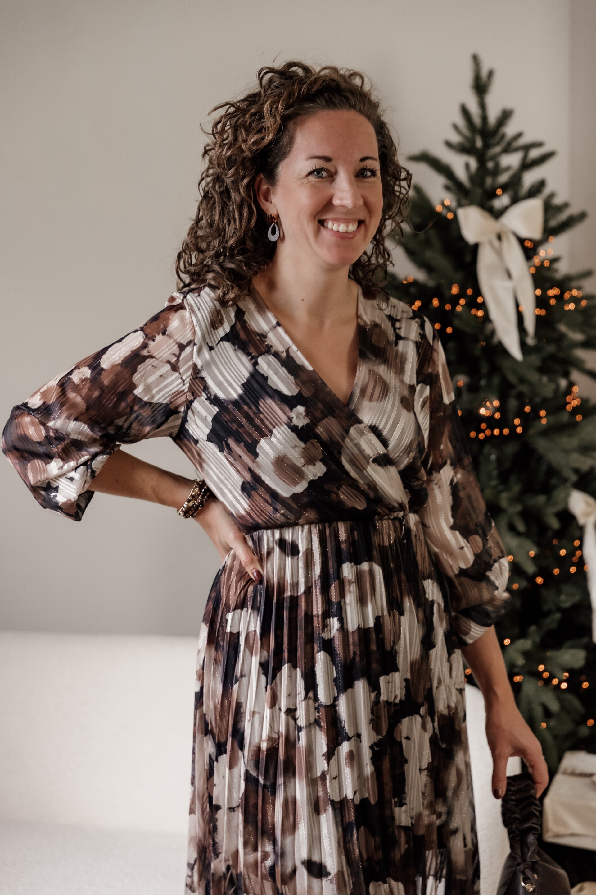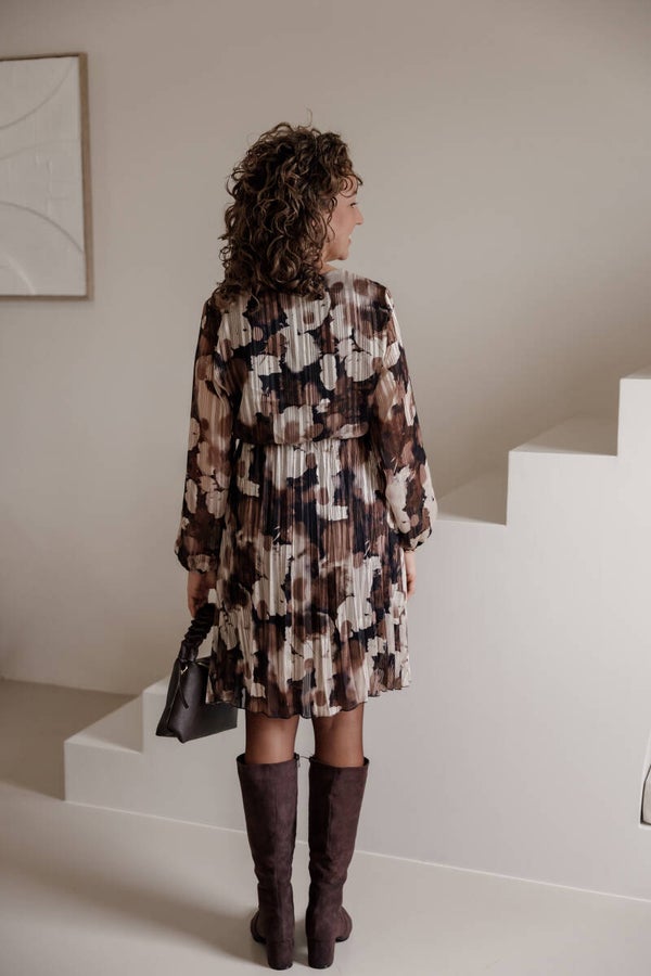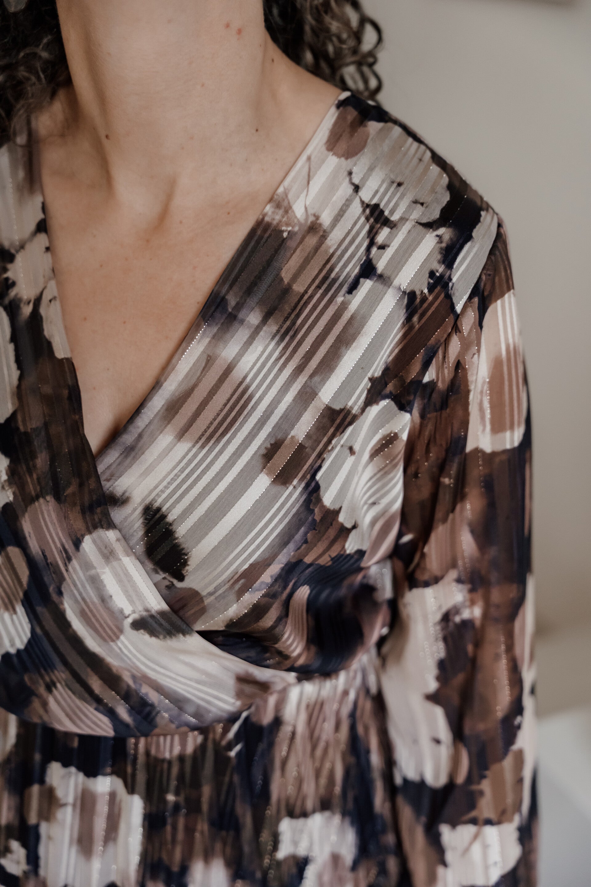 Deze elegante jurk is de perfecte combinatie van stijl en comfort. De stof met gouden lurexdraagje en prachtige print in zachte bruin- en beigetinten geeft een verfijnde en vrouwelijke uitstraling.