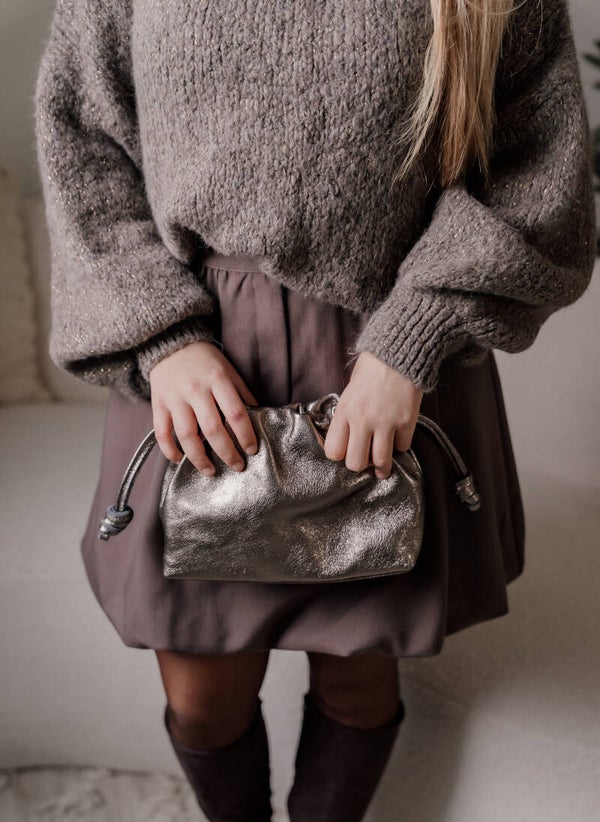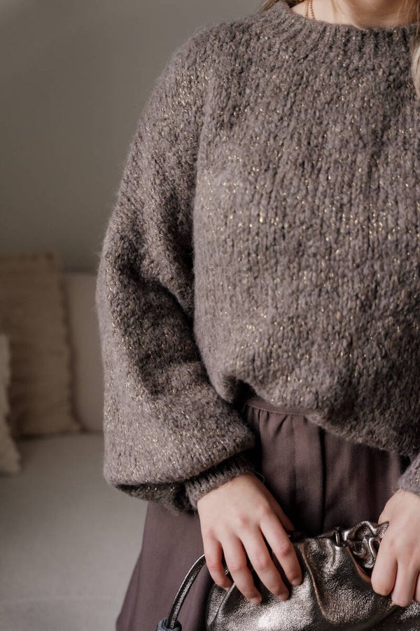 Deze taupe kleurige trui met gouden glitters is de perfecte combinatie van comfort en stijl. Gemaakt van een zachte, warme stof met een grove structuur, biedt deze trui ultiem draagcomfort op koude dagen. De ballonmouwen geven het een speelse en eigentijdse uitstraling.