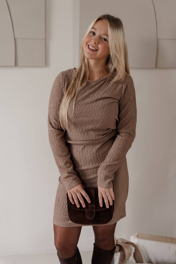 De warme taupe-tint geeft de jurk een chique, moderne uitstraling, terwijl de lengte net boven de knie zorgt voor een vlot en vrouwelijk silhouet. Perfect te combineren met laarzen en een kleine clutch voor een complete, stijlvolle look.