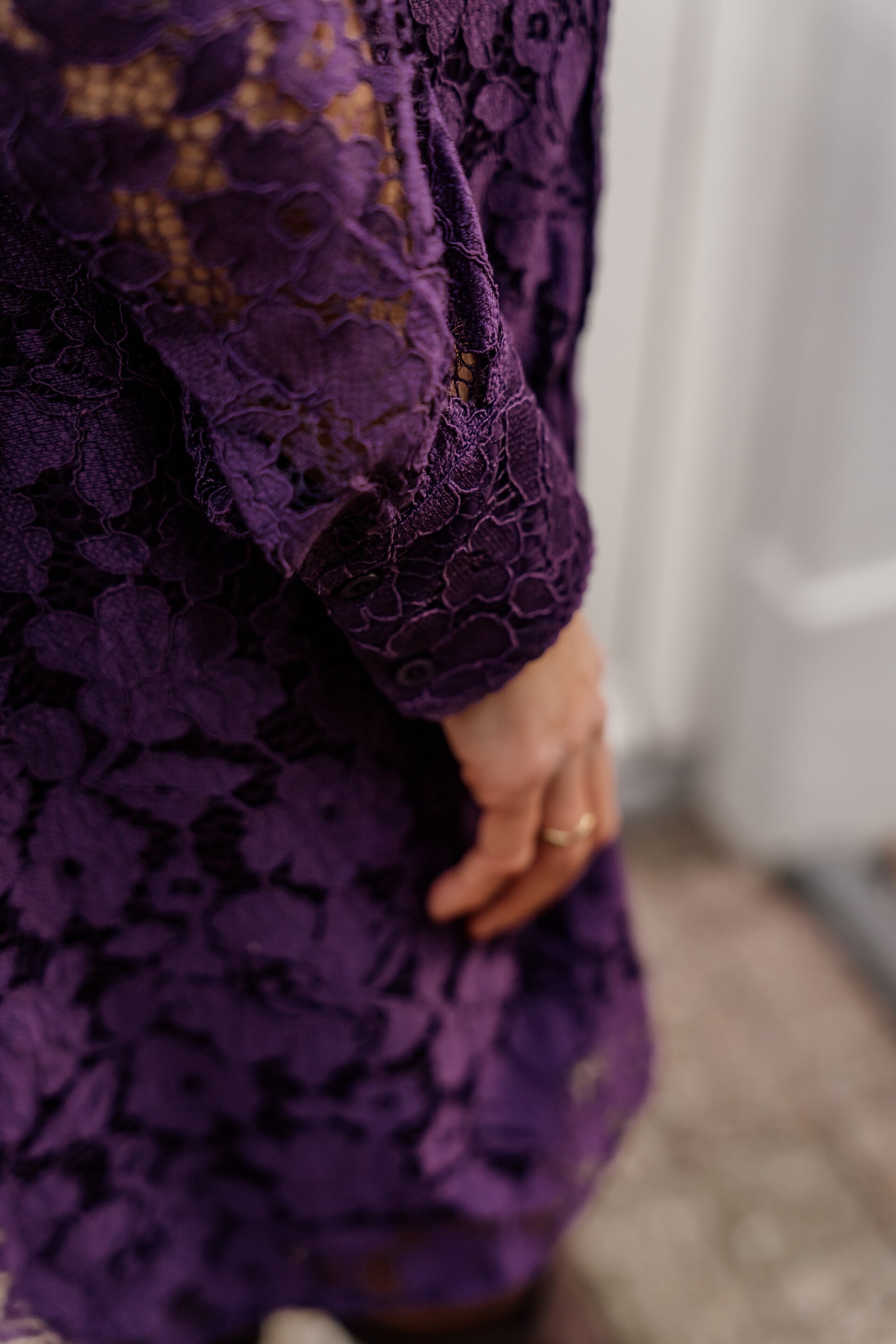 Deze prachtige paarse lace jurk is een echte eyecatcher voor elke gelegenheid. De jurk is volledig uitgevoerd in verfijnd kant met een bloemmotief, waardoor hij een luxe en vrouwelijke uitstraling heeft. Dankzij de doorknoopsluiting aan de voorkant krijgt de jurk een moderne en elegante look.