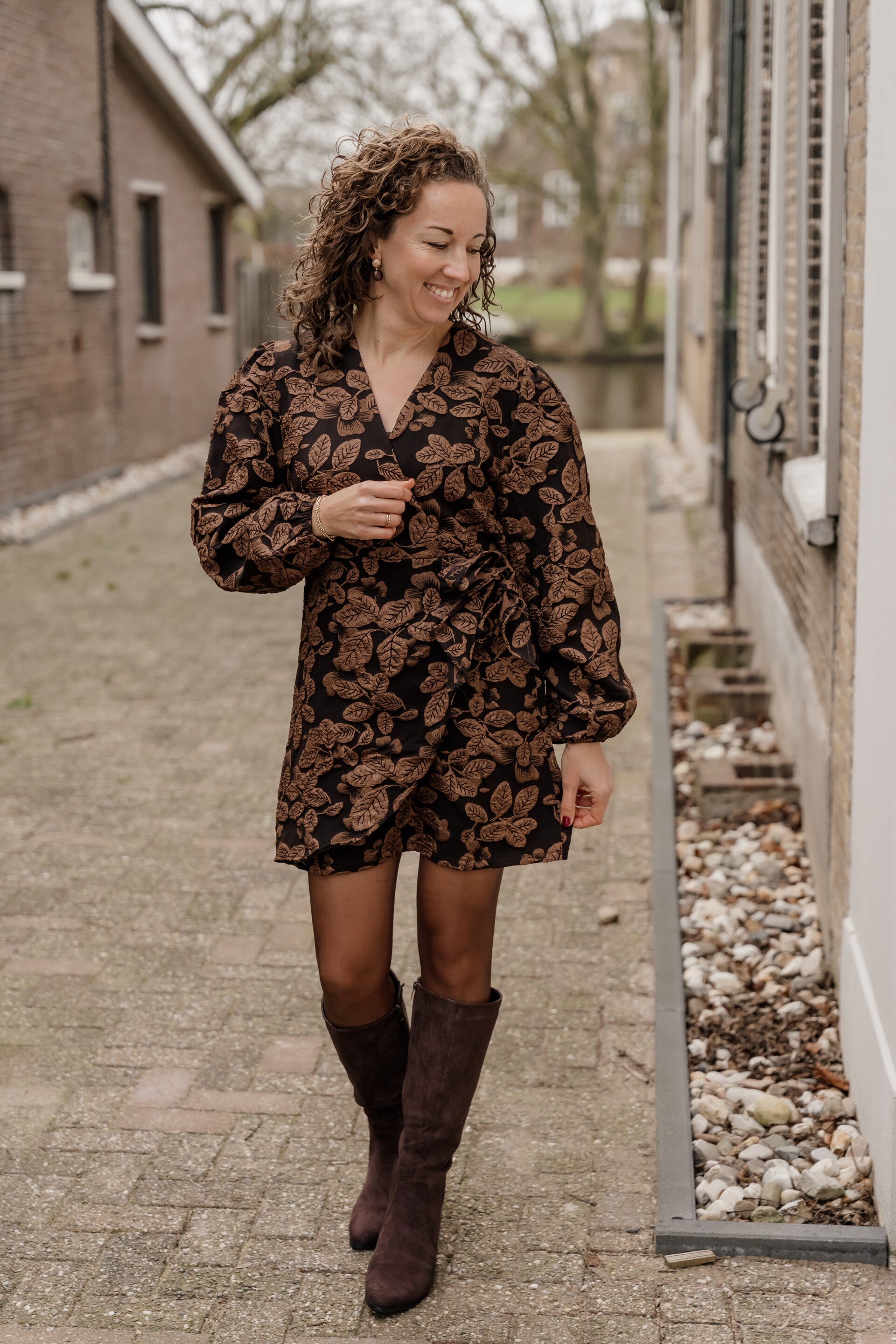 Voeg een vleugje warmte en elegantie toe aan je garderobe met deze jurk. Deze prachtige jurk heeft een rijke bruine basis met een verfijnde bladprint in warme carameltonen.