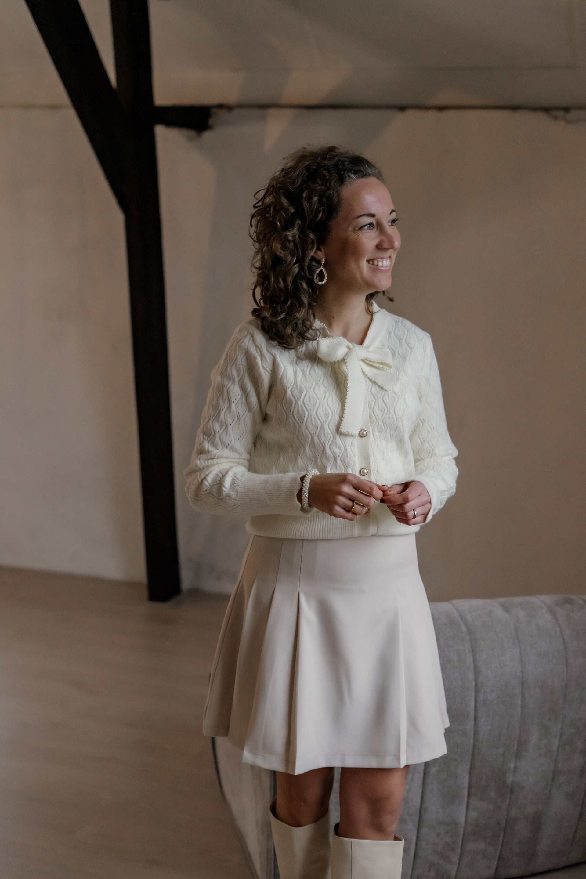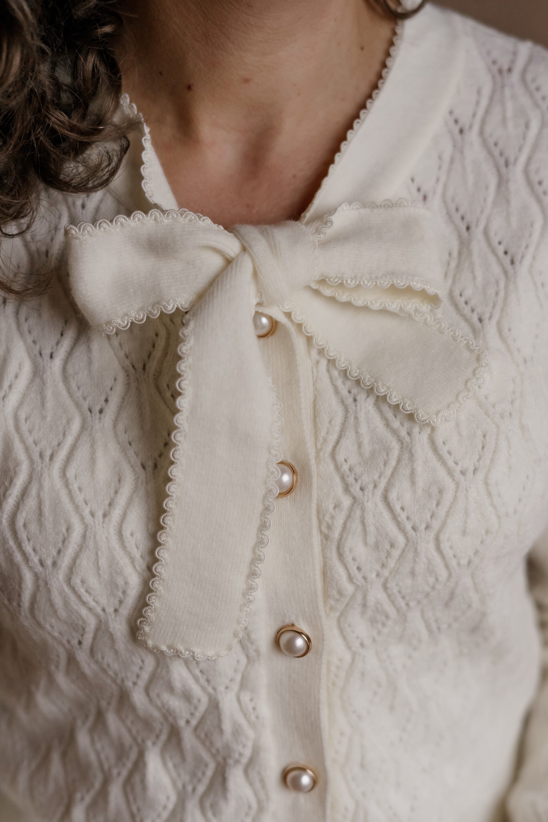 Dit zachte en comfortabele gebreide vestje is een elegante toevoeging aan je garderobe. Het verfijnde strikdetail bij de hals zorgt voor een vrouwelijke en stijlvolle uitstraling. Dankzij het tijdloze ontwerp is het vest perfect om elke outfit subtiel op te fleuren en tegelijkertijd warm af te maken.
