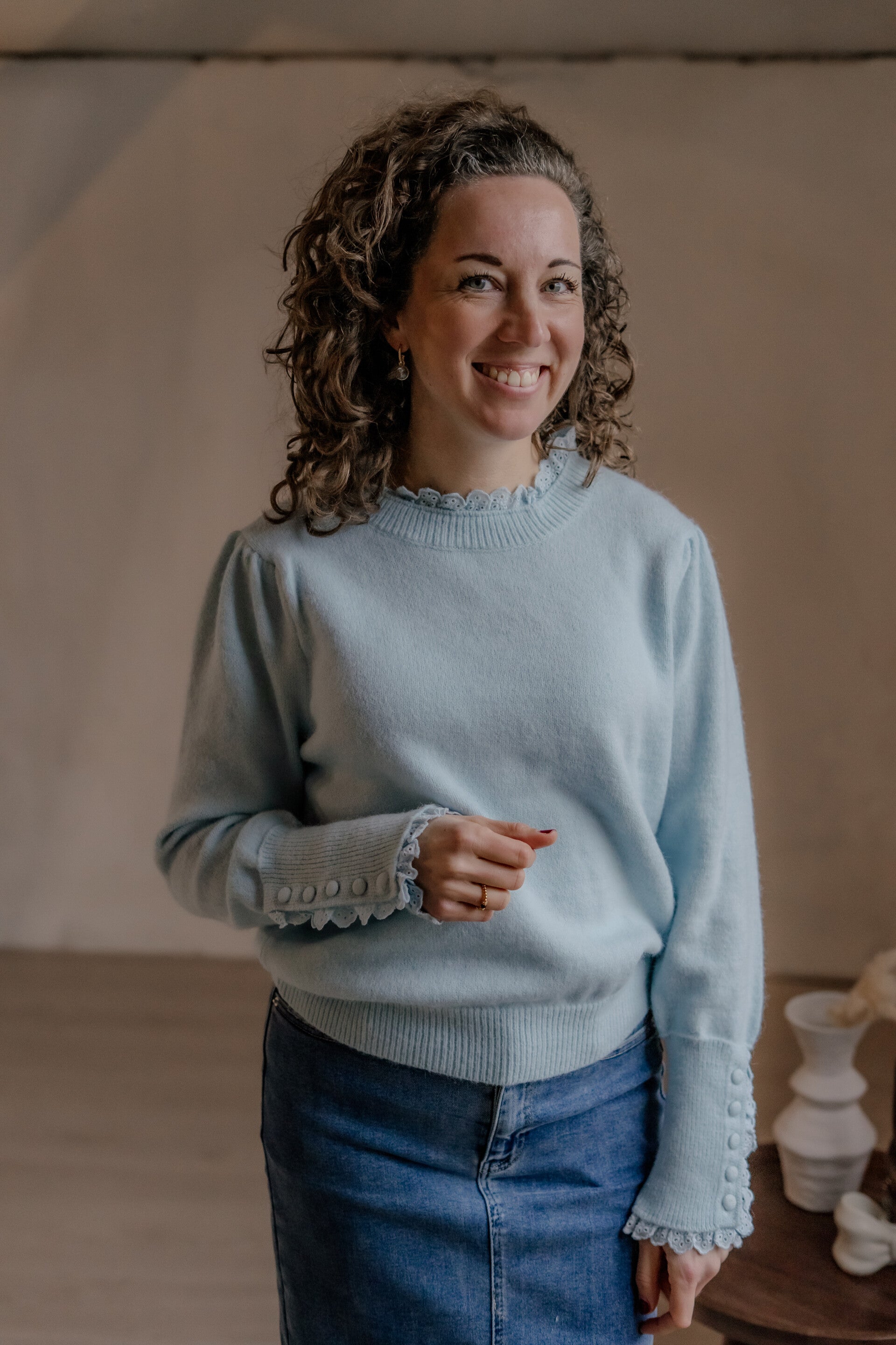 Deze lichtblauwe damestrui combineert comfort met verfijnde details. De trui heeft een ronde hals met subtiel kanten randje en elegante mouwen met kant en knoopjes bij de manchetten. De zachte stof draagt heerlijk en geeft een vrouwelijke, romantische uitstraling.