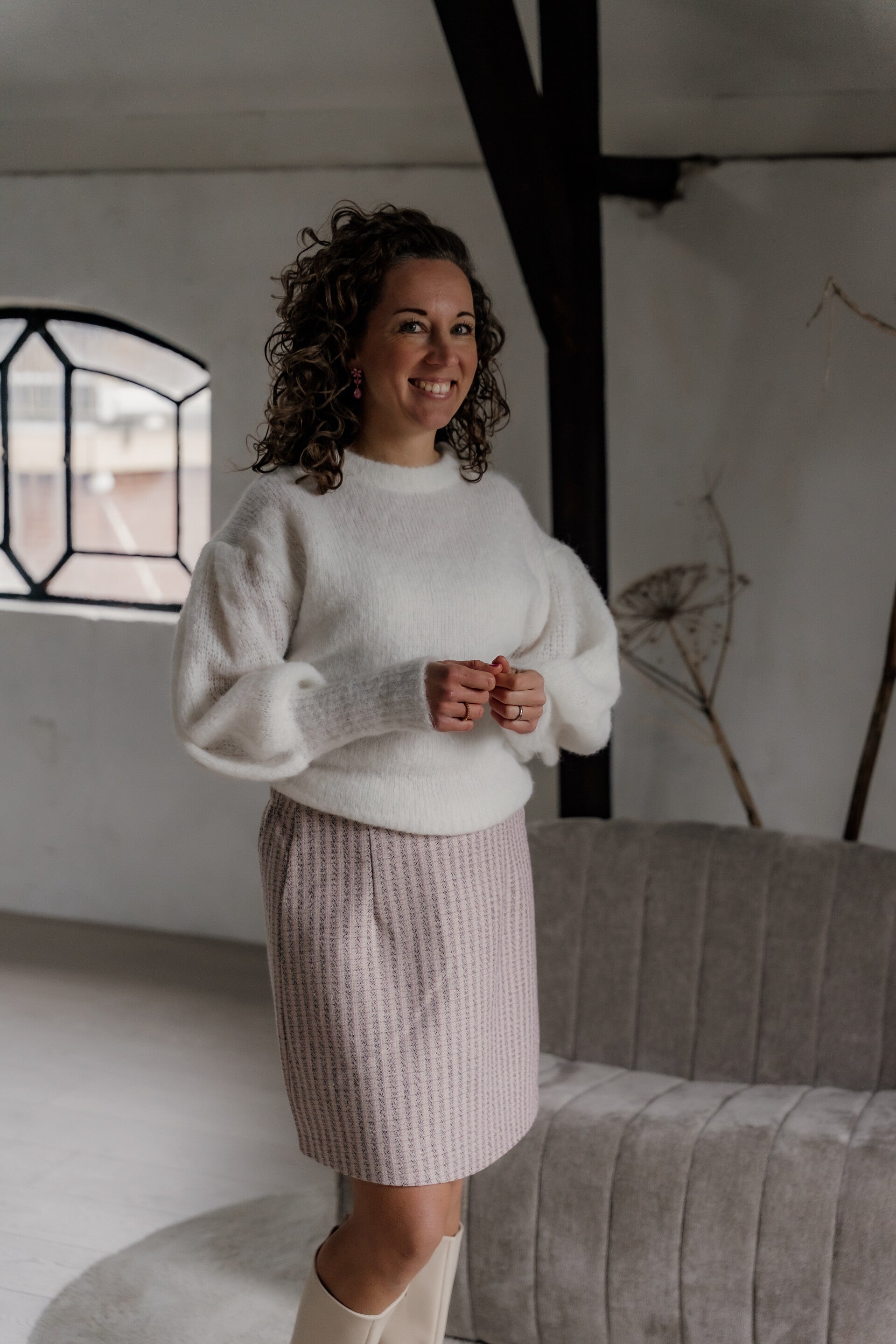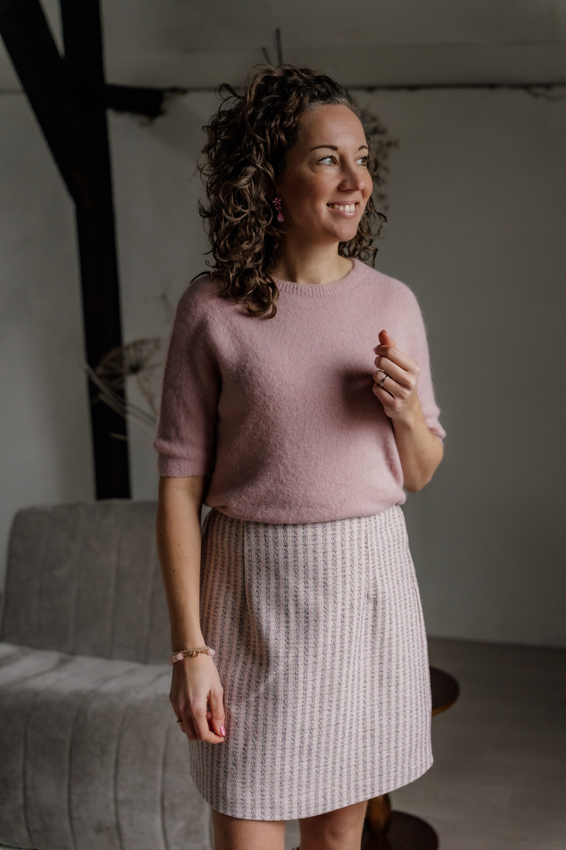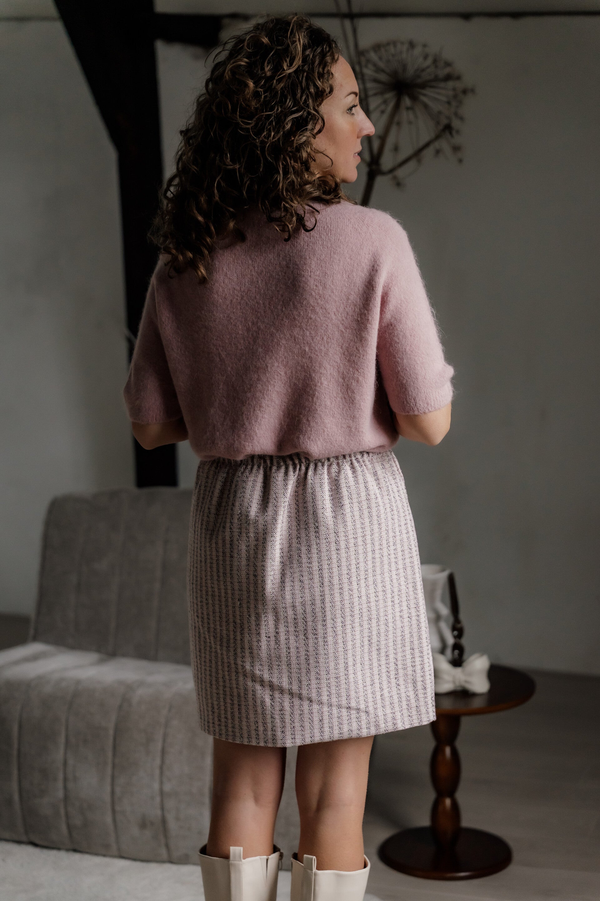 Dit elegante rokje heeft een rechte pasvorm en is uitgevoerd in een verfijnde geweven stof met een subtiel streeppatroon. De zachte tinten geven het rokje een vrouwelijke en tijdloze uitstraling.