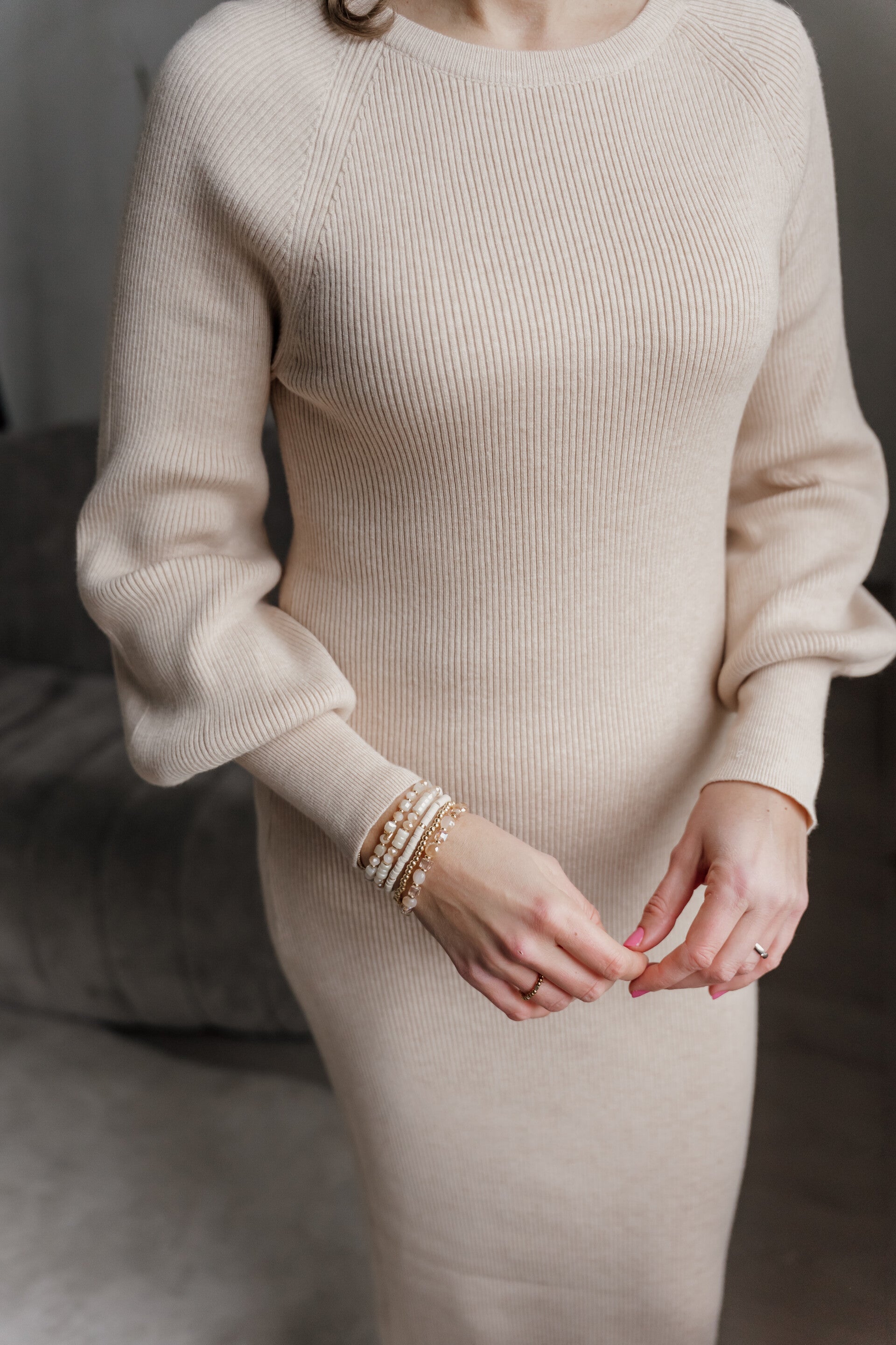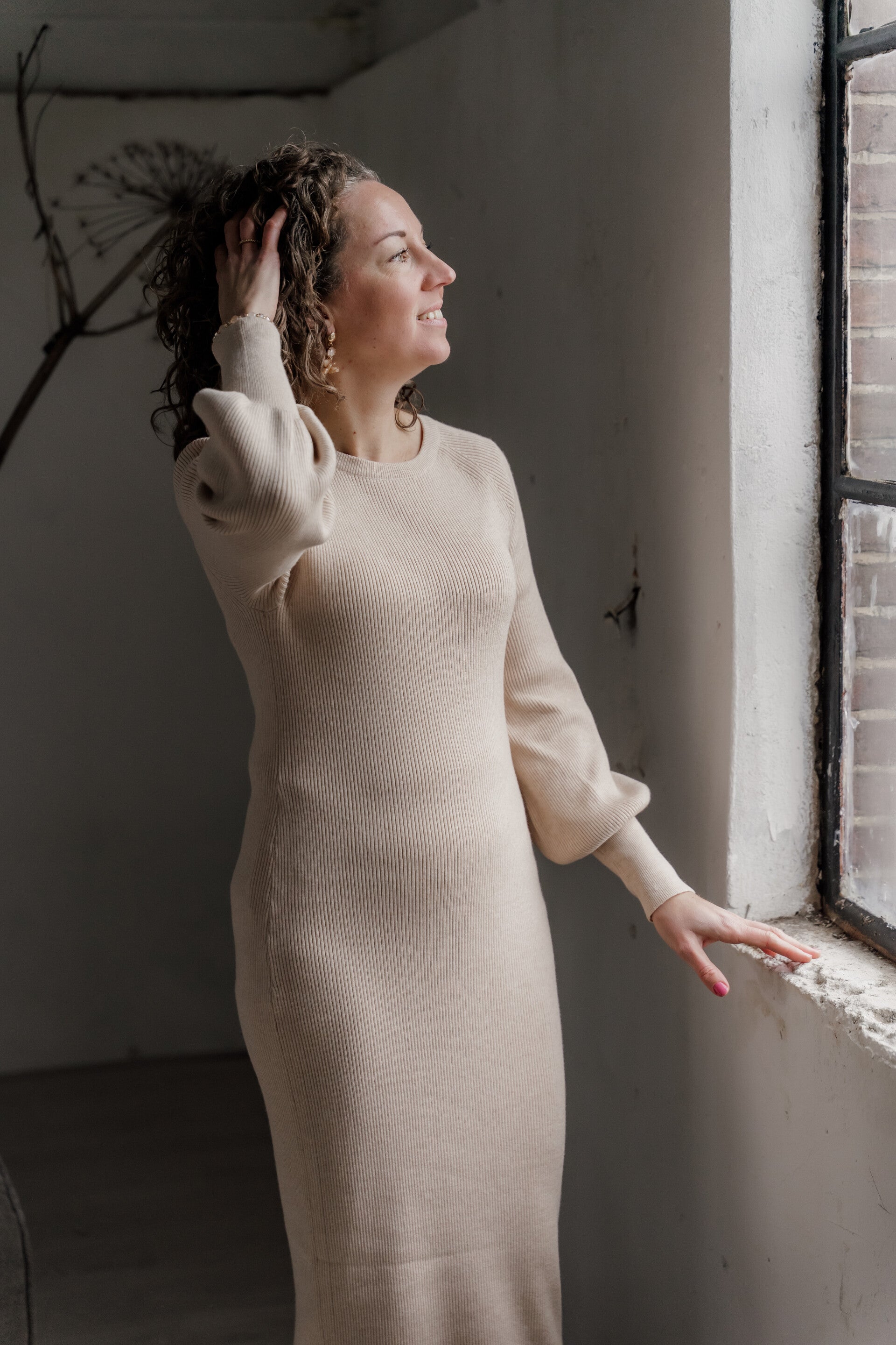Deze gebreide beige bodycon jurk heeft een warme en stijlvolle uitstraling. De zachte knitstof sluit mooi aan en zorgt voor een comfortabele pasvorm. Perfect voor een cosy maar elegante look, geschikt voor zowel dagelijks gebruik als een geklede gelegenheid.