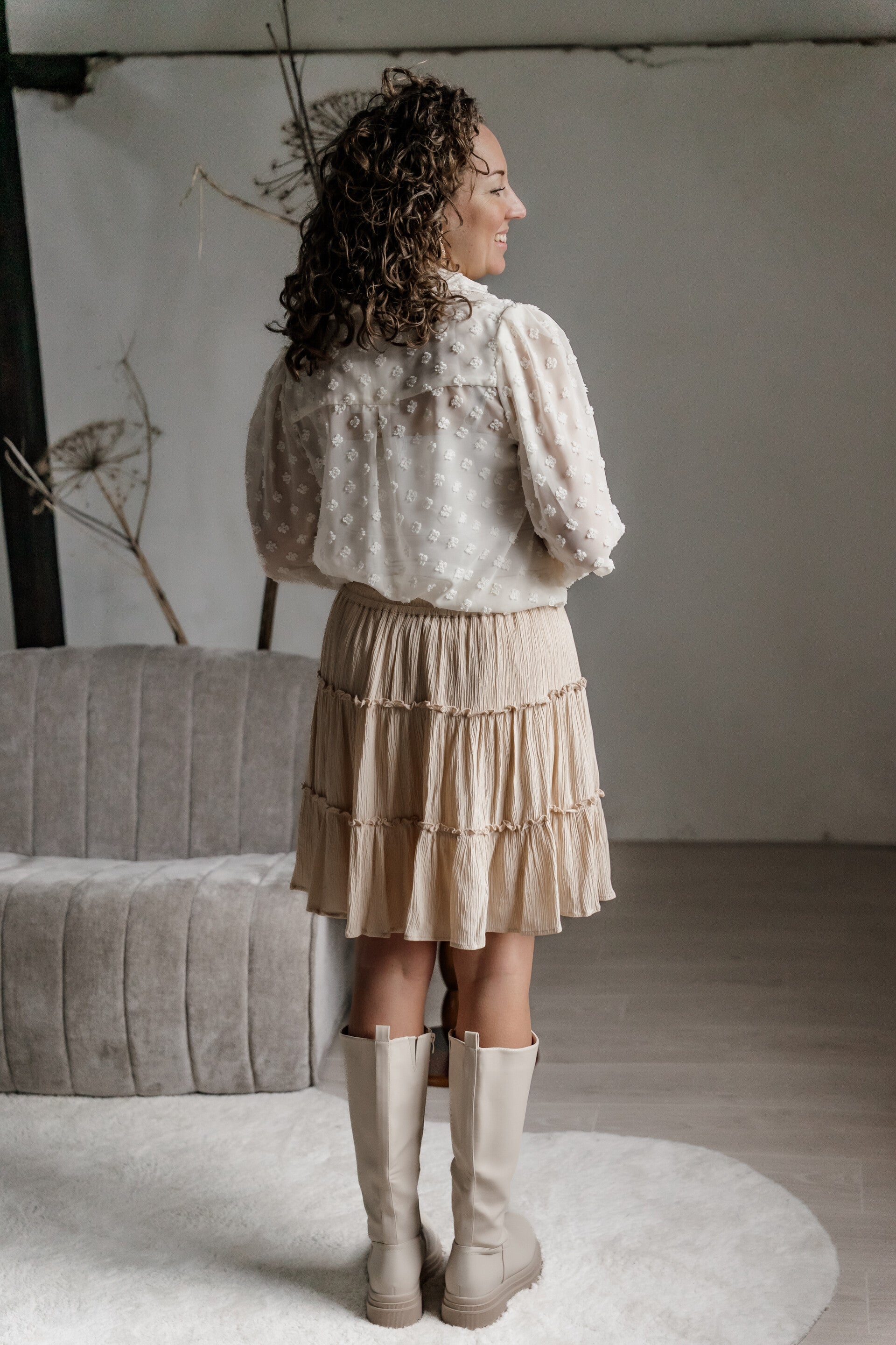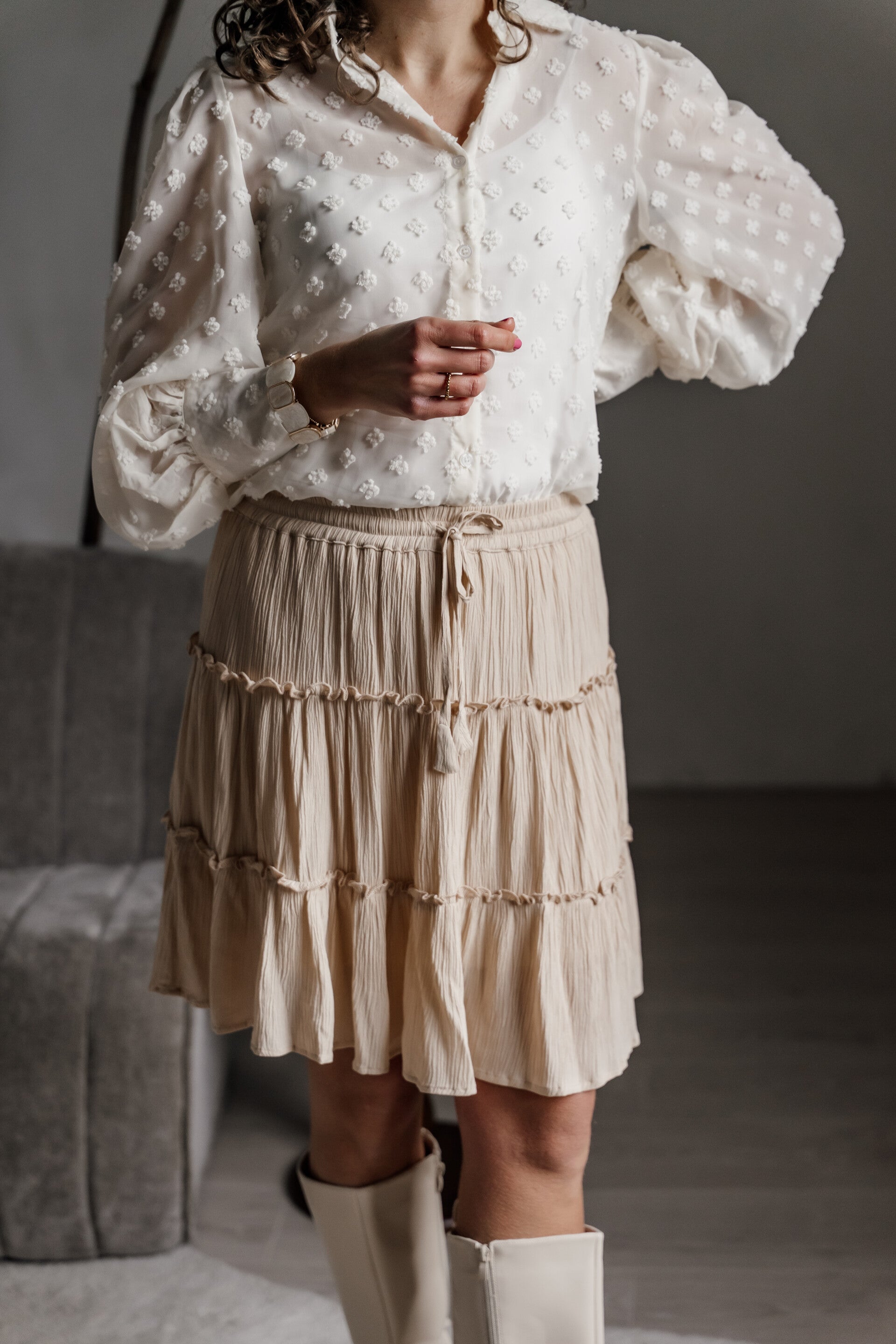 Dankzij de neutrale kleur is de blouse eenvoudig te combineren met een diverse rokken of onder een blazer - geschikt voor zowel casual als geklede momenten.